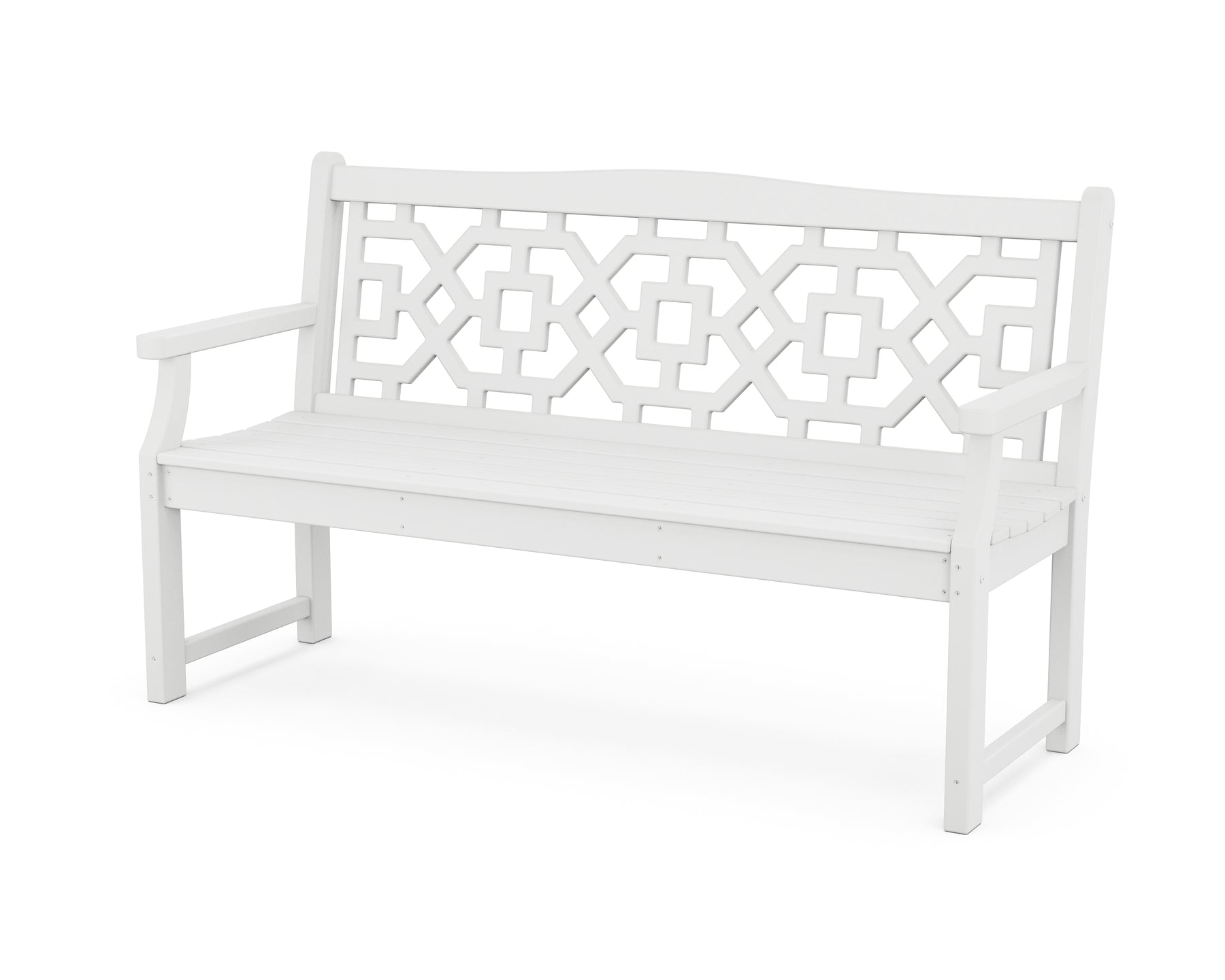 The Martha Stewart by POLYWOOD Chinoiserie 60" Garden Bench is a natural fit for creating beautiful outdoor spaces. Notes of traditional design are seen in the graceful lines and intricate latticework, delicate details that are balanced by the bench's sturdy frame and all-weather durability. Whether nestled among the blooms or perched on your porch, its peaceful presence will beckon more moments outside.