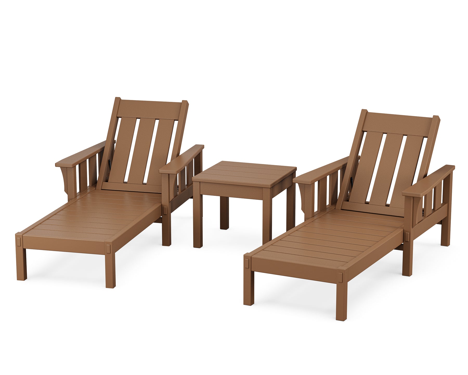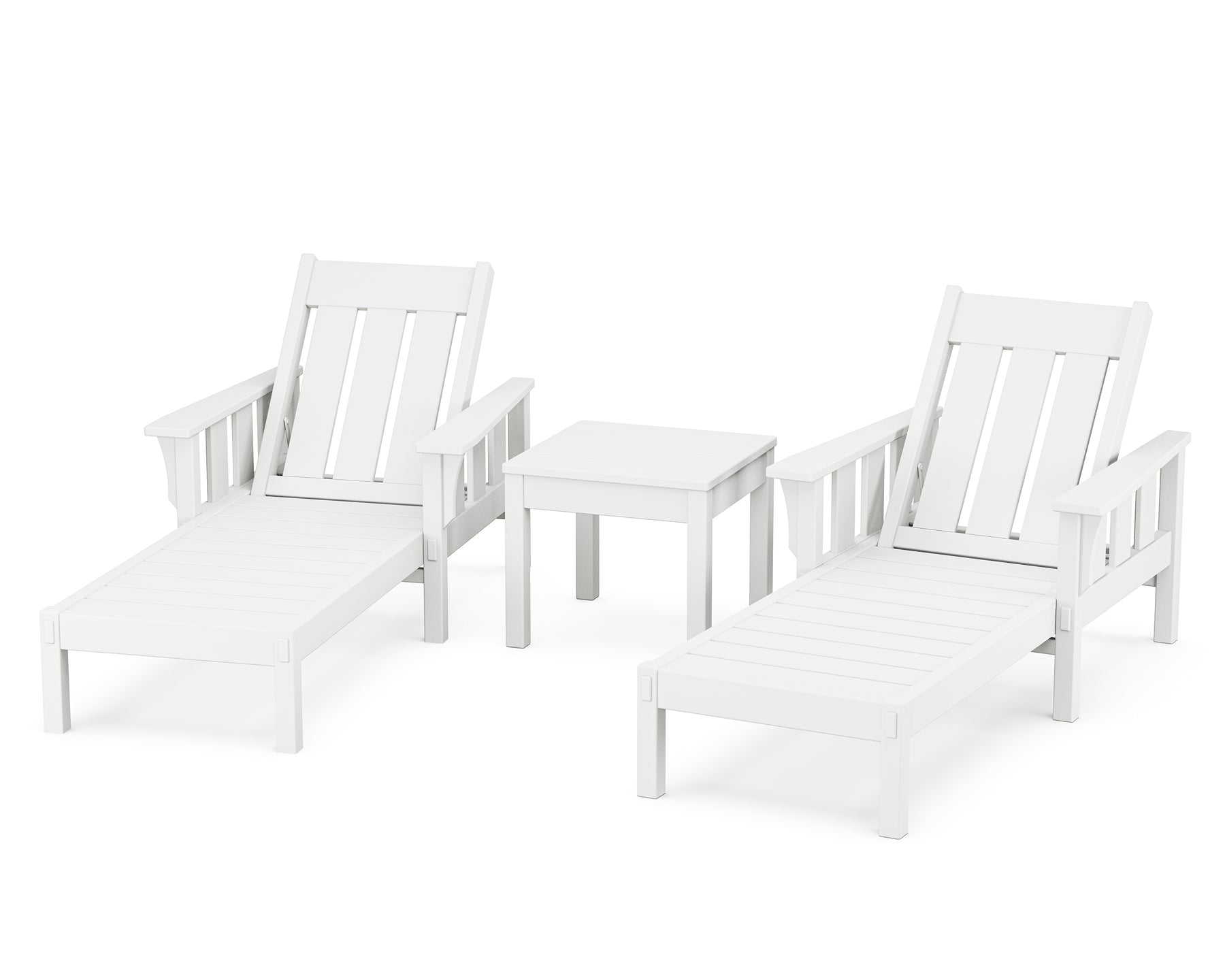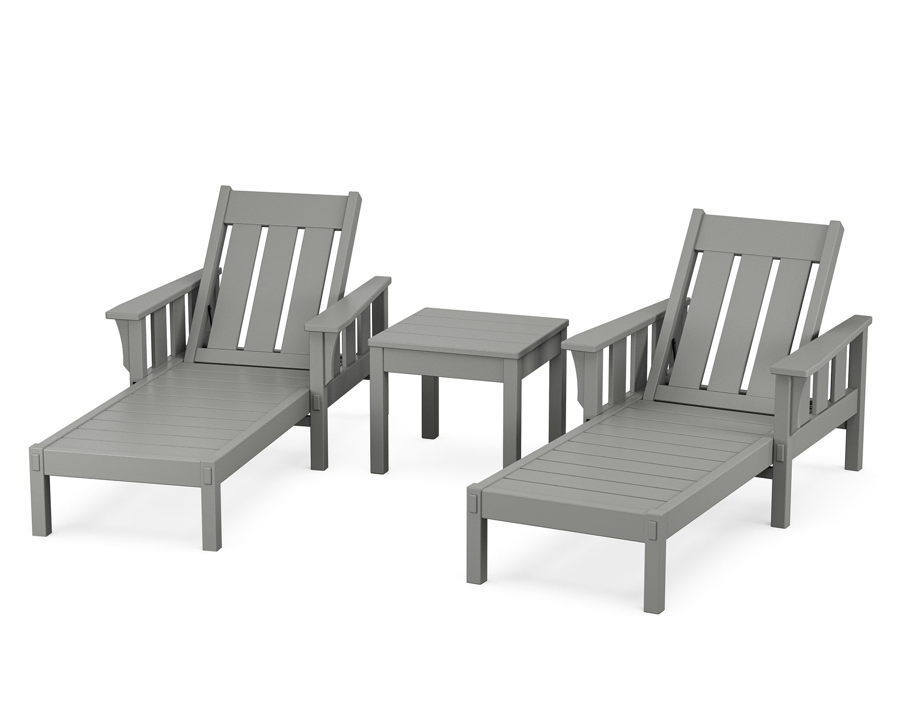 The Martha Stewart by POLYWOOD Acadia 3-Piece Chaise Set brings paradise to your own backyard. With adjustable backrests, the chaises are made for every way you rest, relax, and recline. A side table rounds out this lounge-ready look. Defined by strong vertical lines and decorative details emulating traditional woodworking joinery, this all-weather collection was inspired by the Craftsman furniture at Martha Stewart's residence in Maine, a bucolic beauty built in the 1920s.