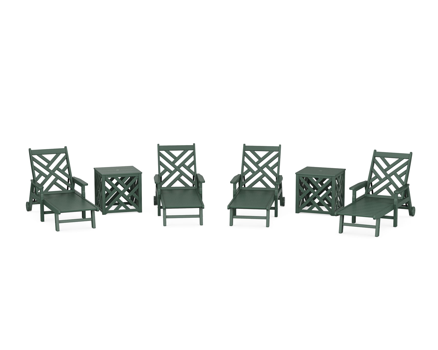 • Set includes (4) Chippendale Chaises with Arms and Wheels and (2) Chippendale Umbrella Stand Accent Tables