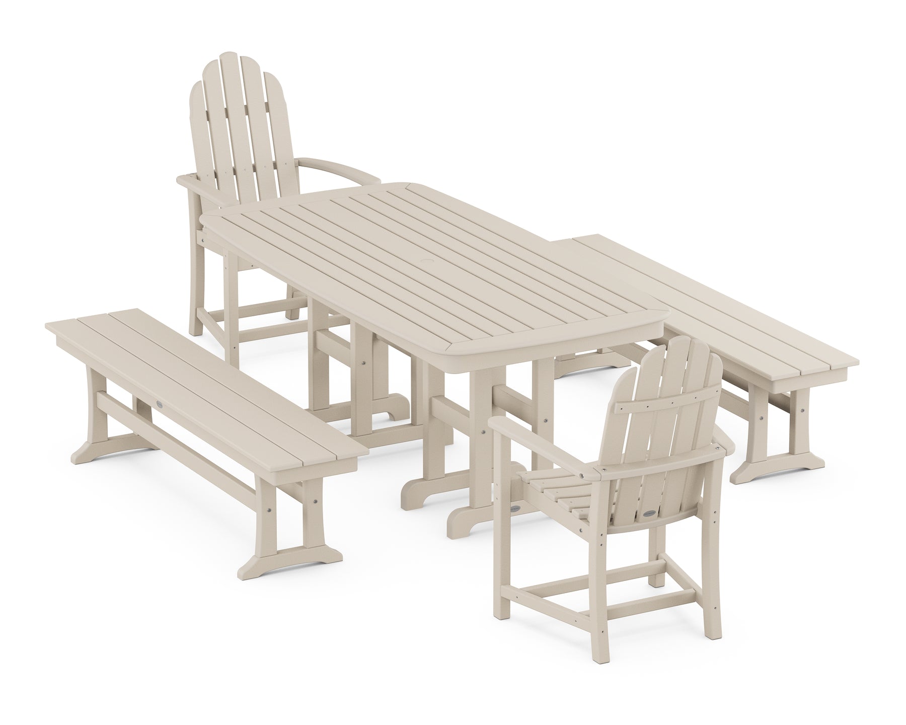 Pay homage to a summertime icon with our Classic Adirondack Collection. The dining chairs' design celebrates the original's reclined profile, spacious seat, and wide-set armrests to create an inviting atmosphere anywhere from patio to poolside. With its welcoming comforts and casual seating styles, the all-weather Classic Adirondack 5-Piece Dining Set with Benches feels like a true slice of Americana.
