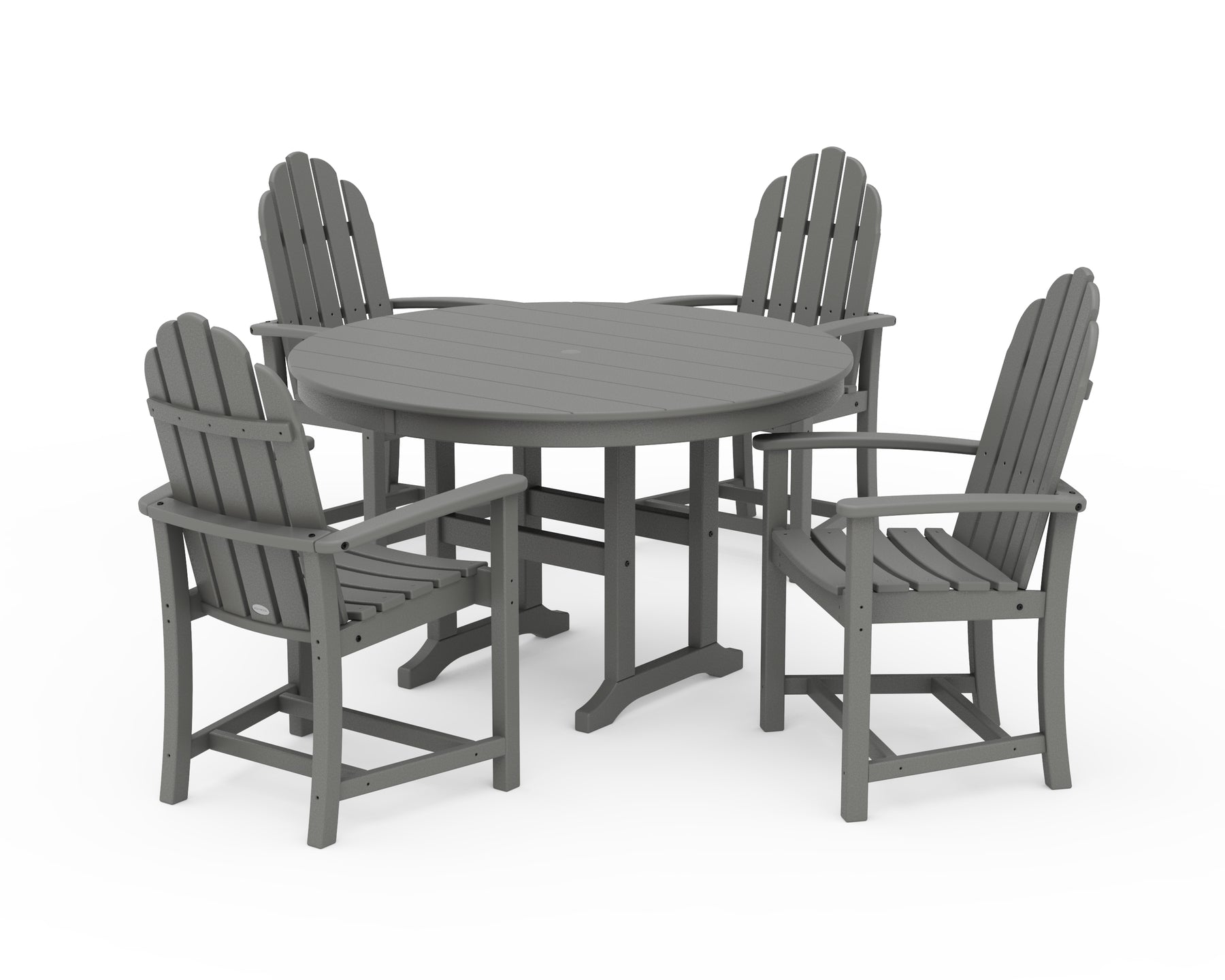 The Classic Adirondack 5-Piece Dining Set is an ideal table setting for those looking for timeless design. Easily recognizable, our Classic Adirondack dining chairs complement the casual and classic round dining table design. Choose a matching color for all the pieces in this all-weather set or mix it up with colorful chairs and a white table.