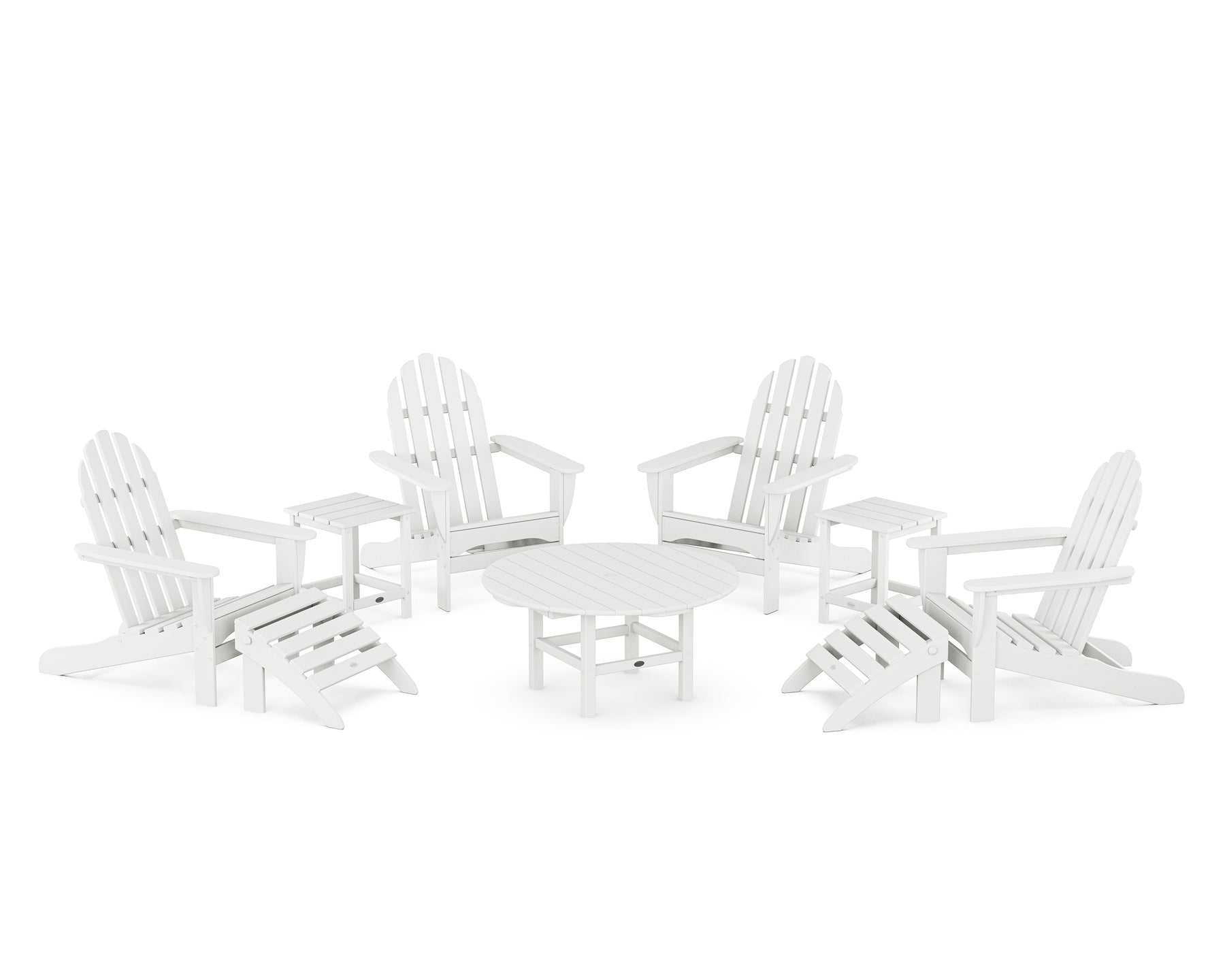 • Set includes (4) Classic Adirondack Chairs, (2) Classic Adirondack Folding Ottomans, (2) Long Island 18" Side Tables, and (1) Round 38" Conversation Table