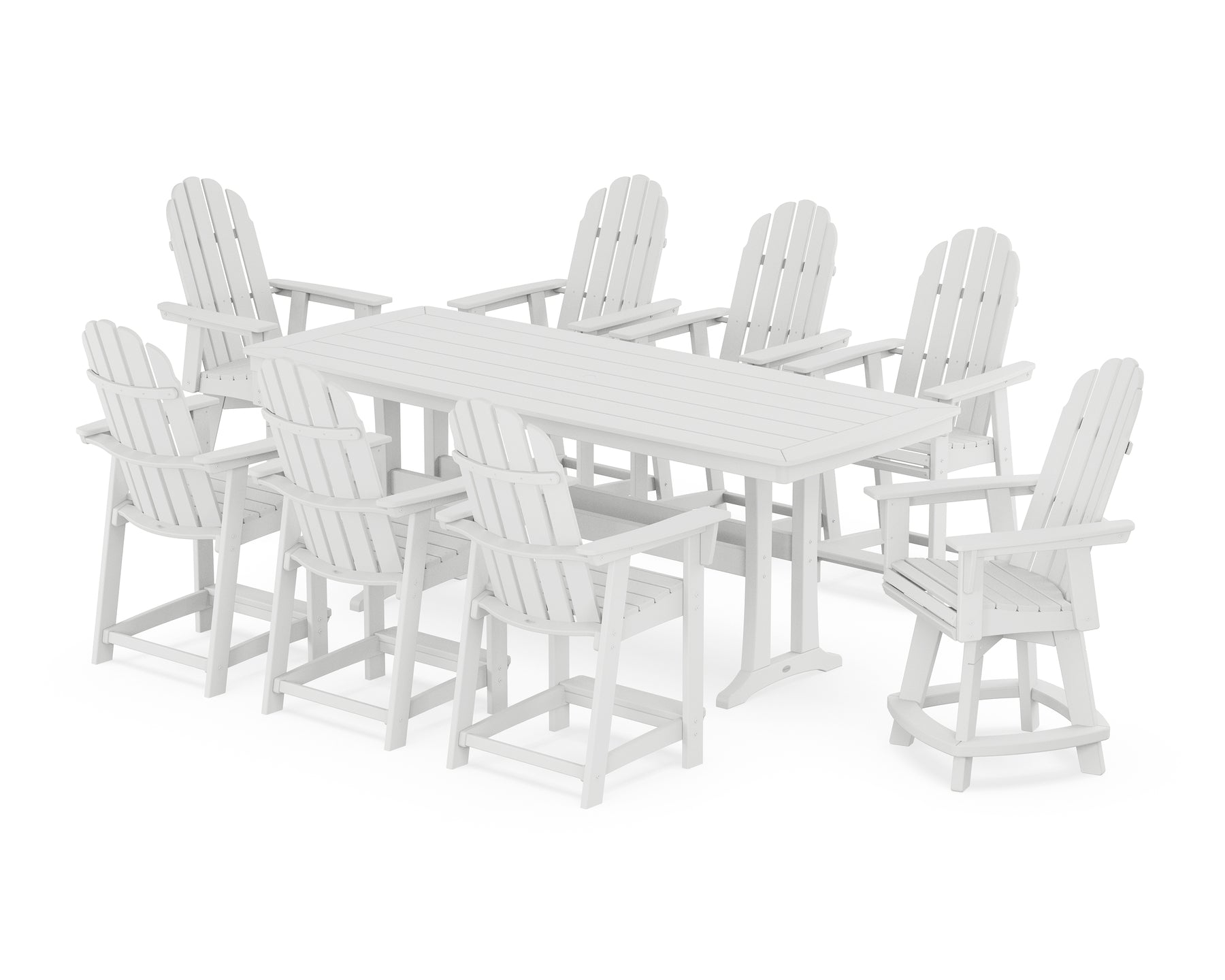 • Set includes (1) Nautical Trestle 39" x 97" Counter Table, (6) Vineyard Curveback Adirondack Counter Chairs, and (2) Vineyard Curveback Adirondack Swivel Counter Chairs