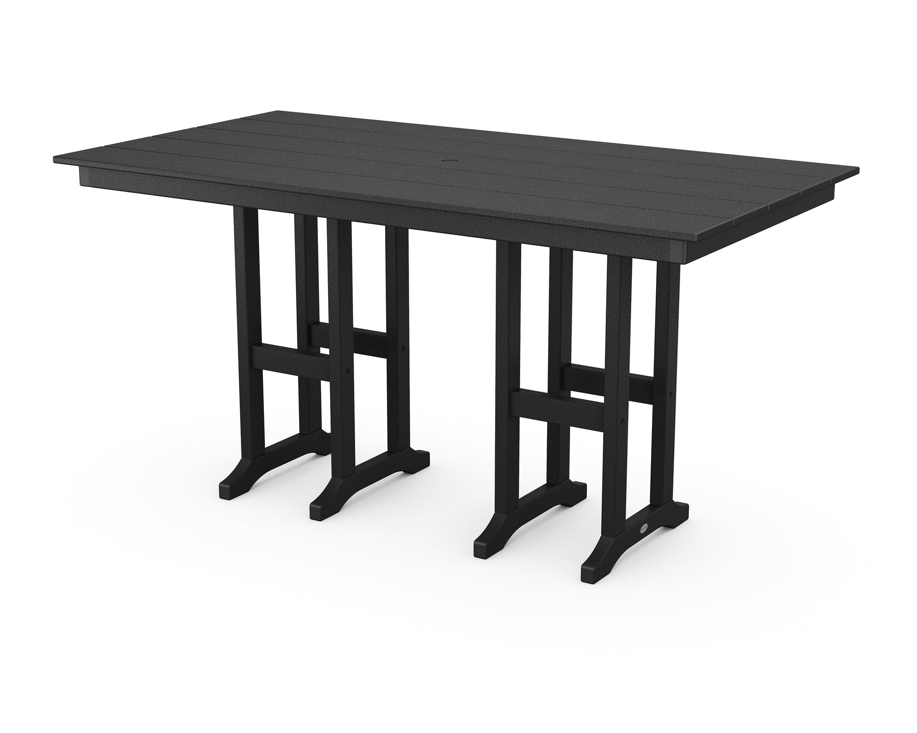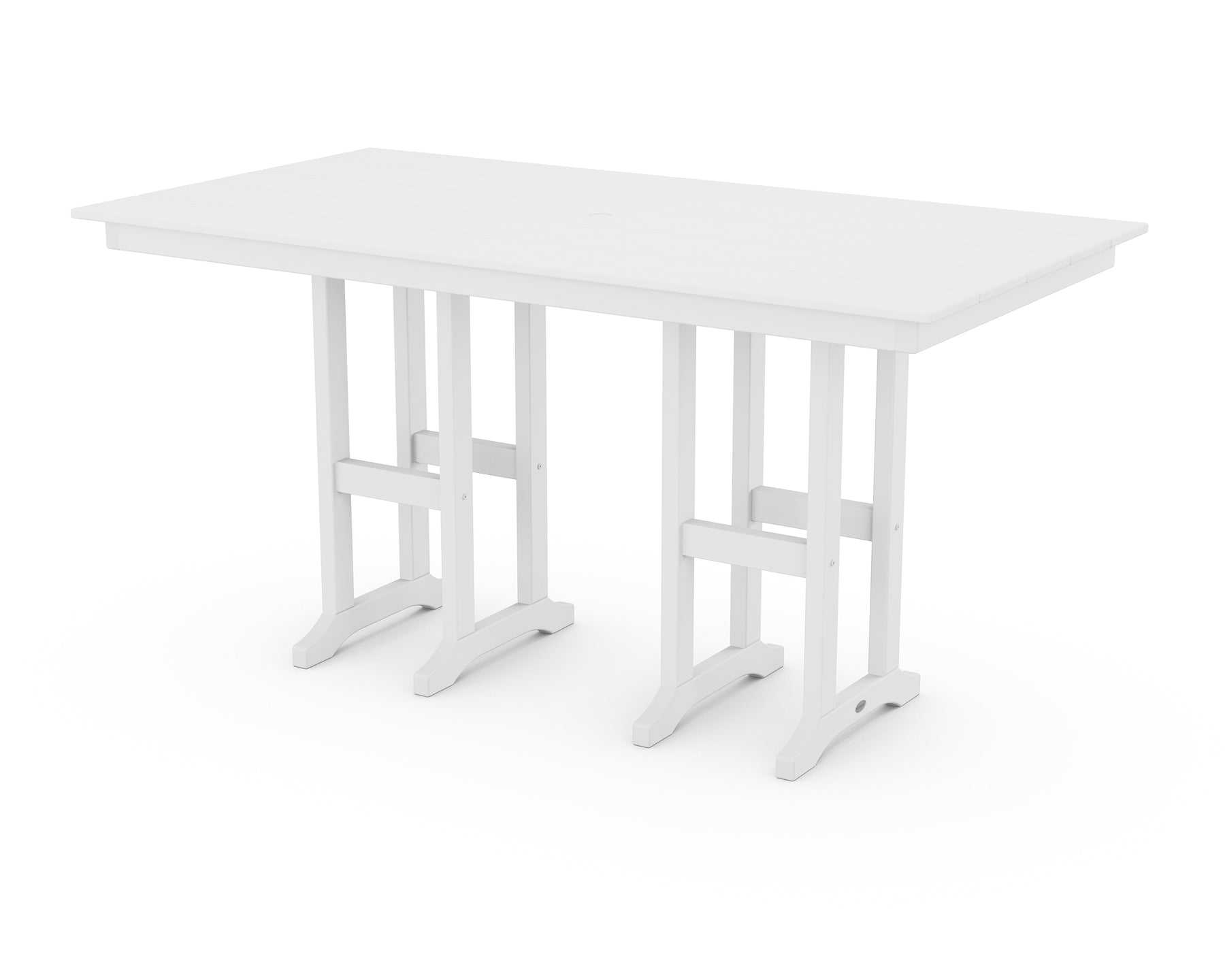 Designed for alfresco entertaining in any season, the Farmhouse 37" x 72" Counter Table levels up any occasion, from morning coffee dates to after-work libations. This tall table offers plenty of room to serve up tasty dishes and drinks with its rectangle tabletop and slim trestle bases. Gather some POLYWOOD counter-height chairs to create the dining set of your dreams.
