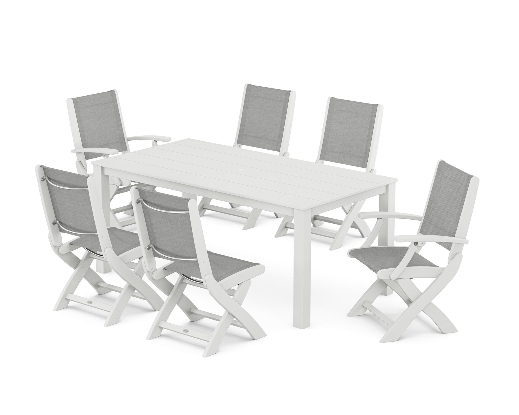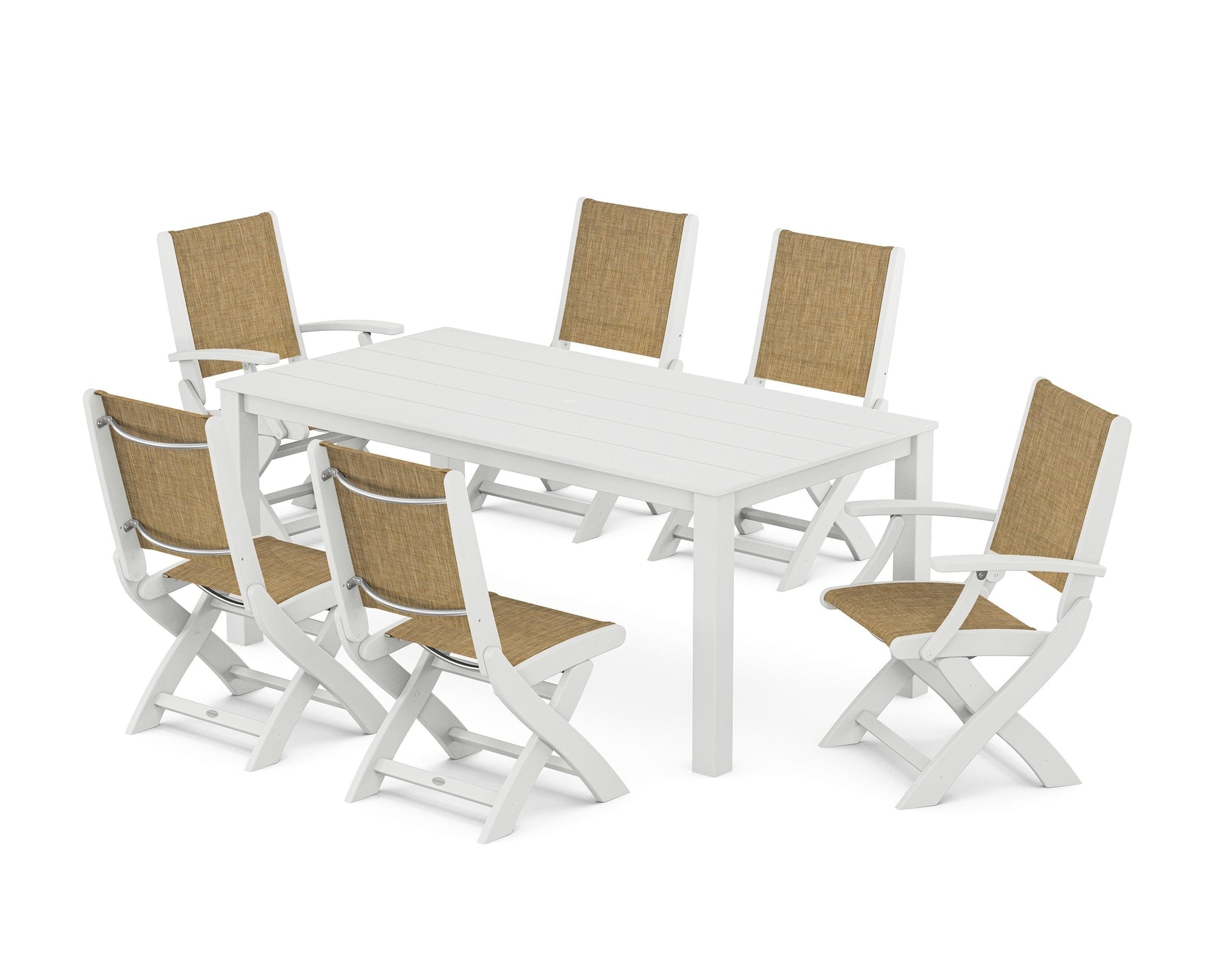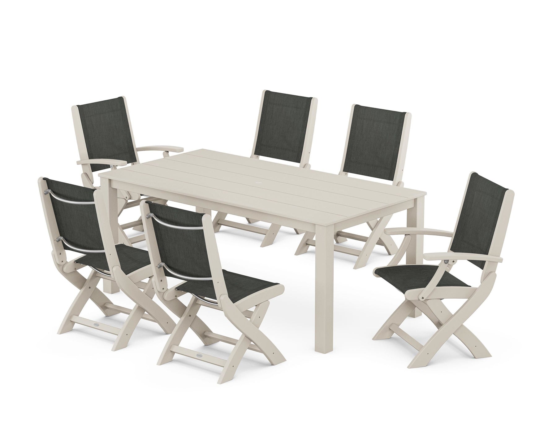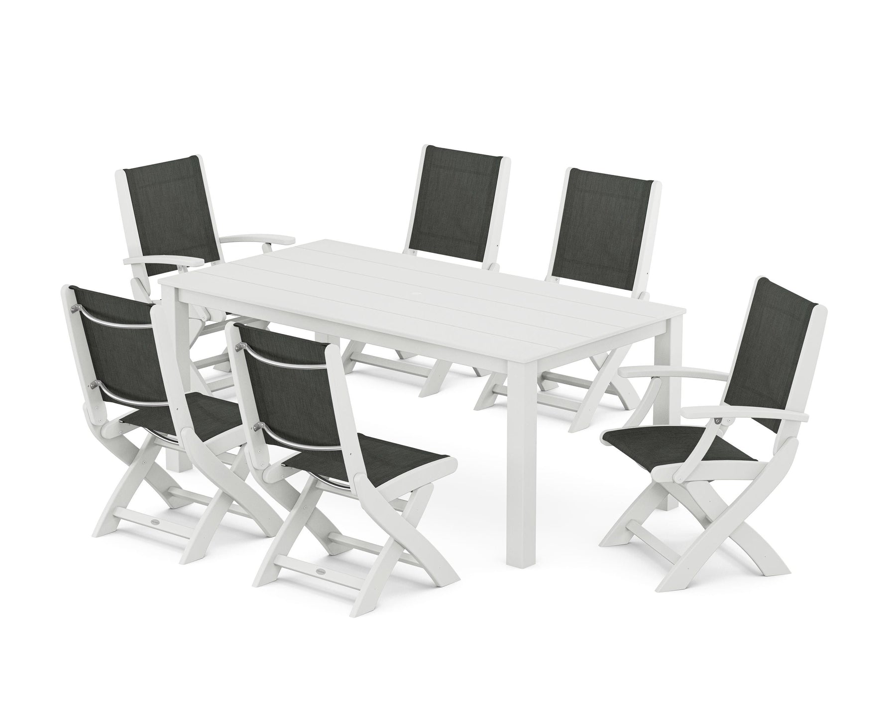 Two words can sum up the Coastal Collection: comfortable and carefree. Designed with materials that withstand all the elements, the Coastal Folding Chair 7-Piece Parsons Dining Set features durable lumber frames and all-weather sling seats with the perfect amount of bounce. Centered around a modernist dining table, this set easily and comfortably accommodates six.