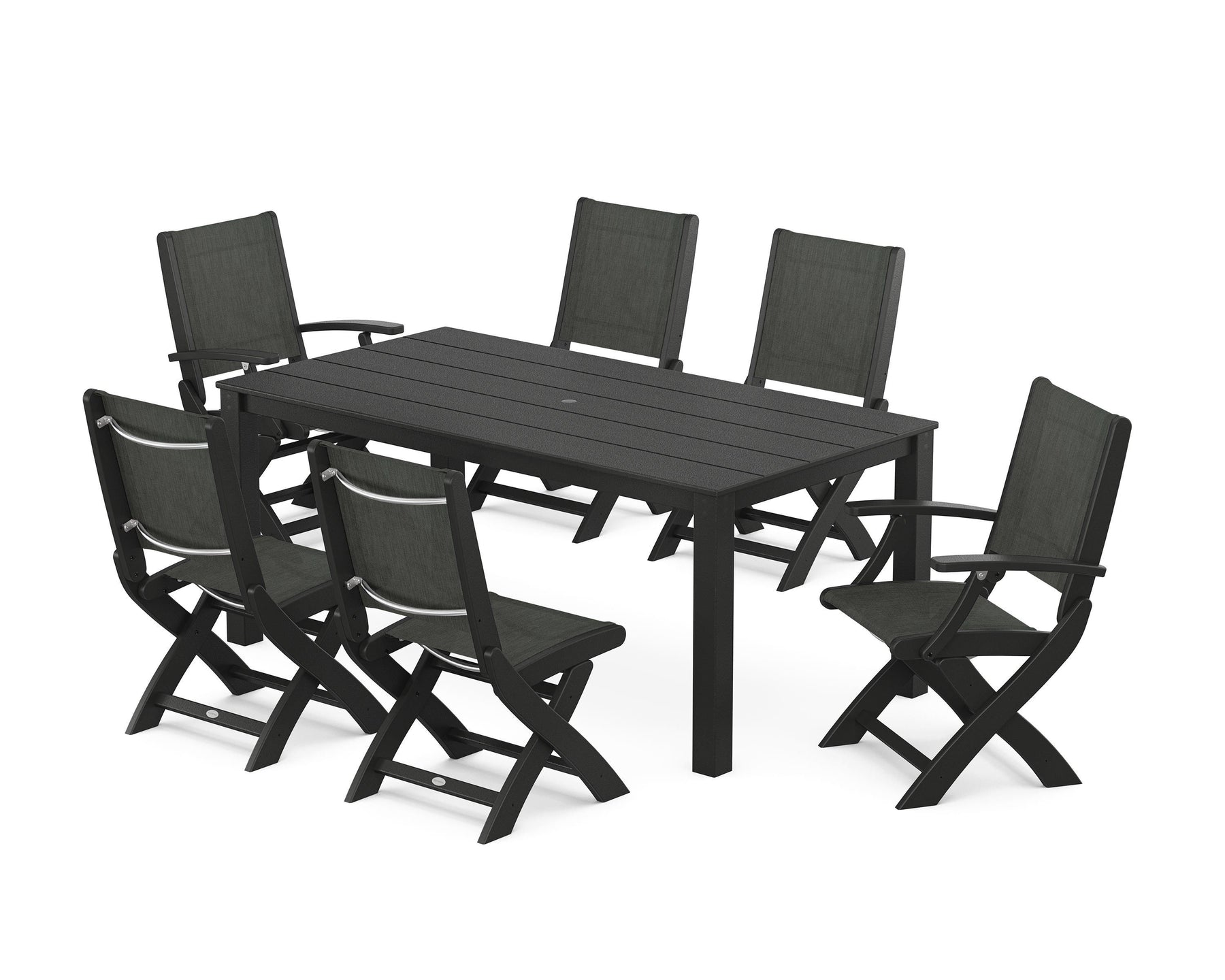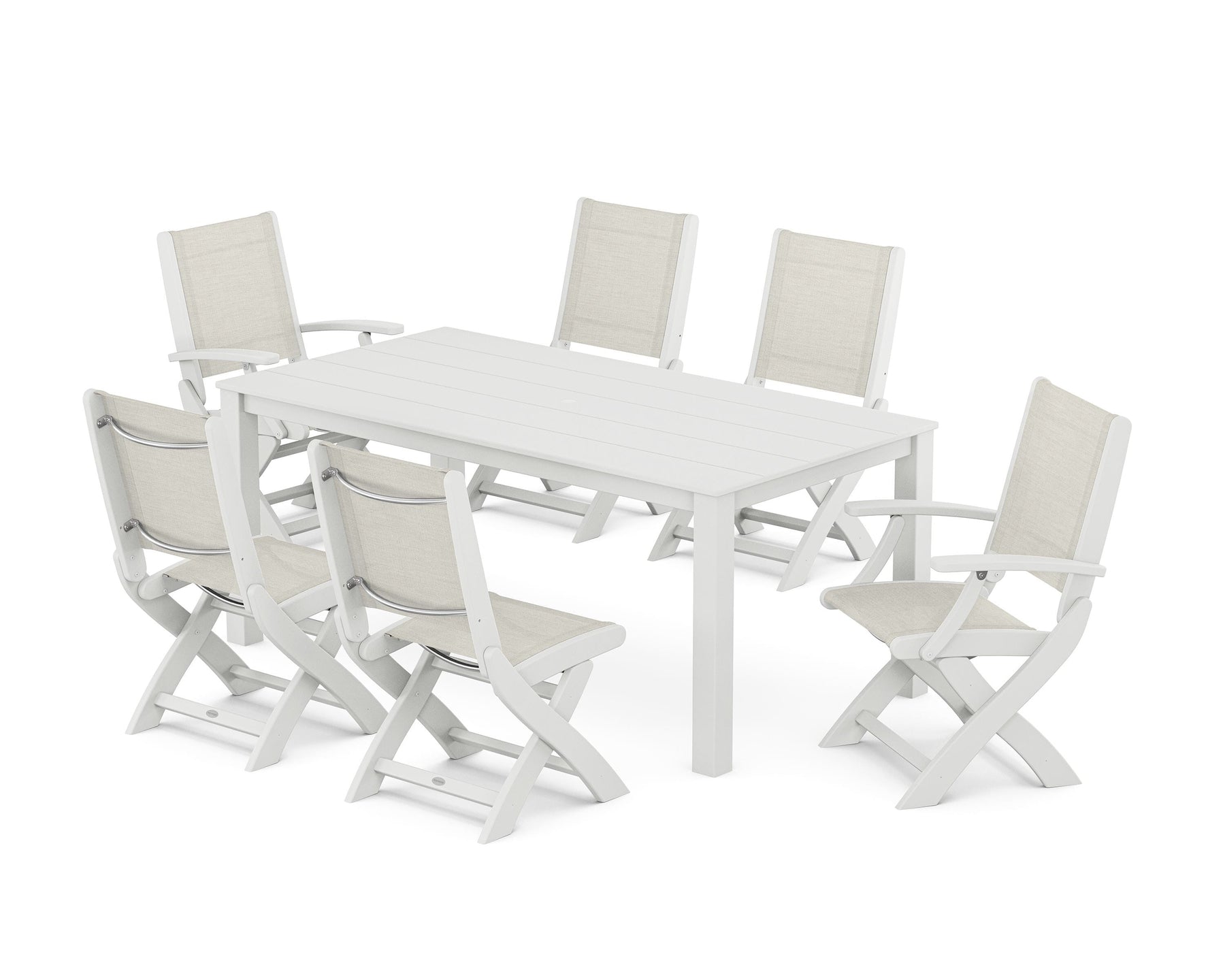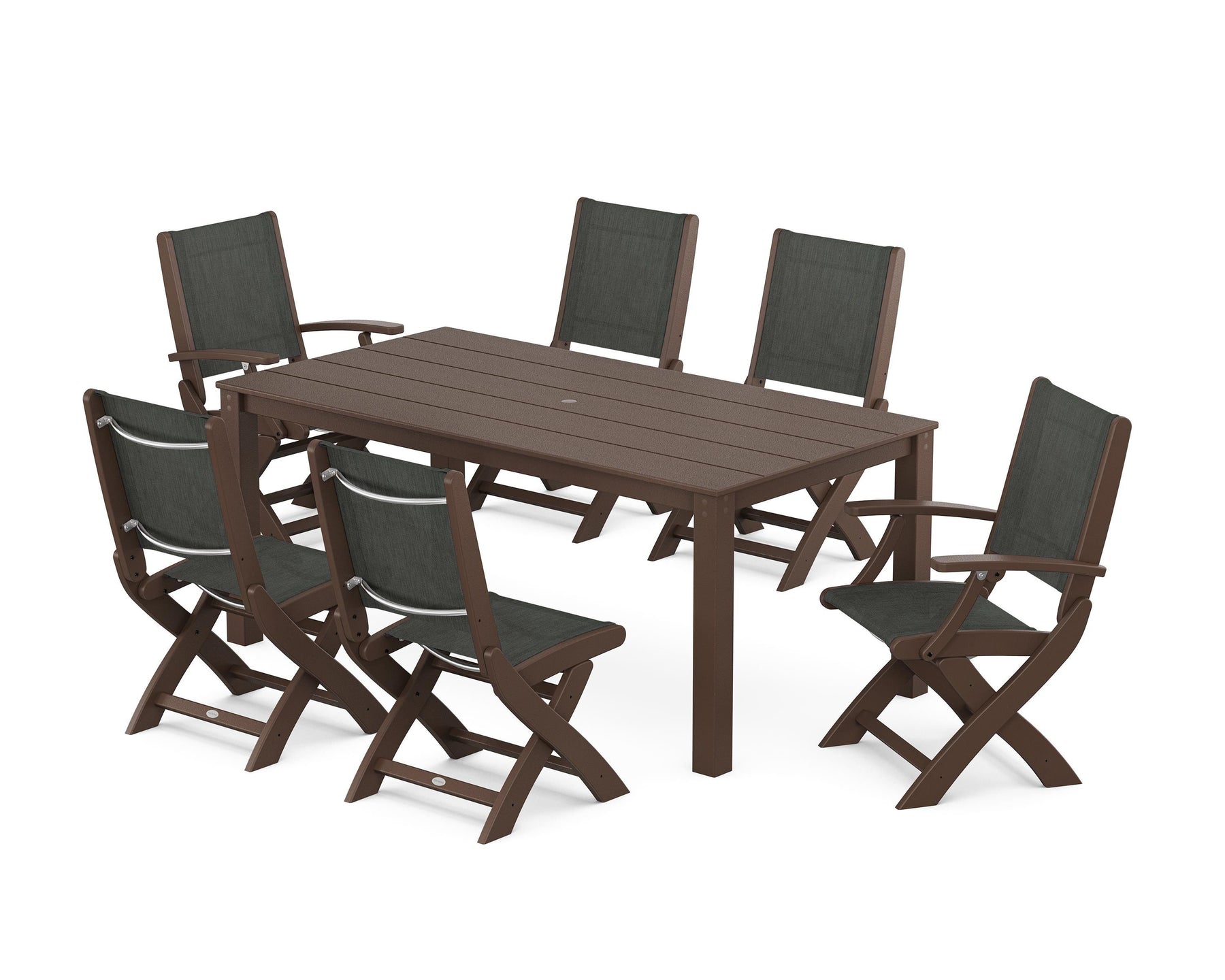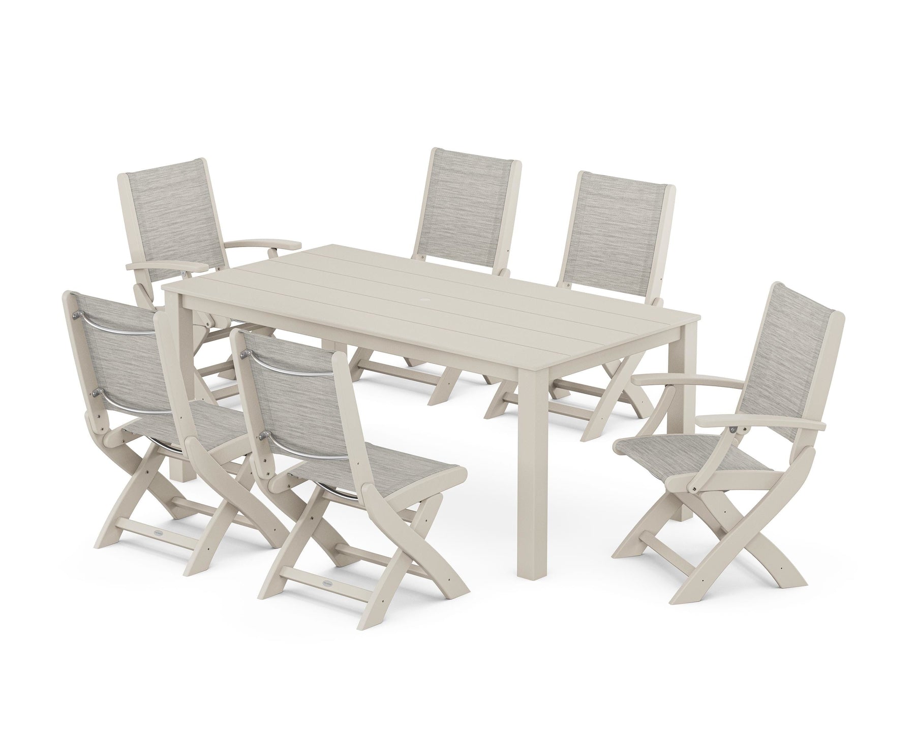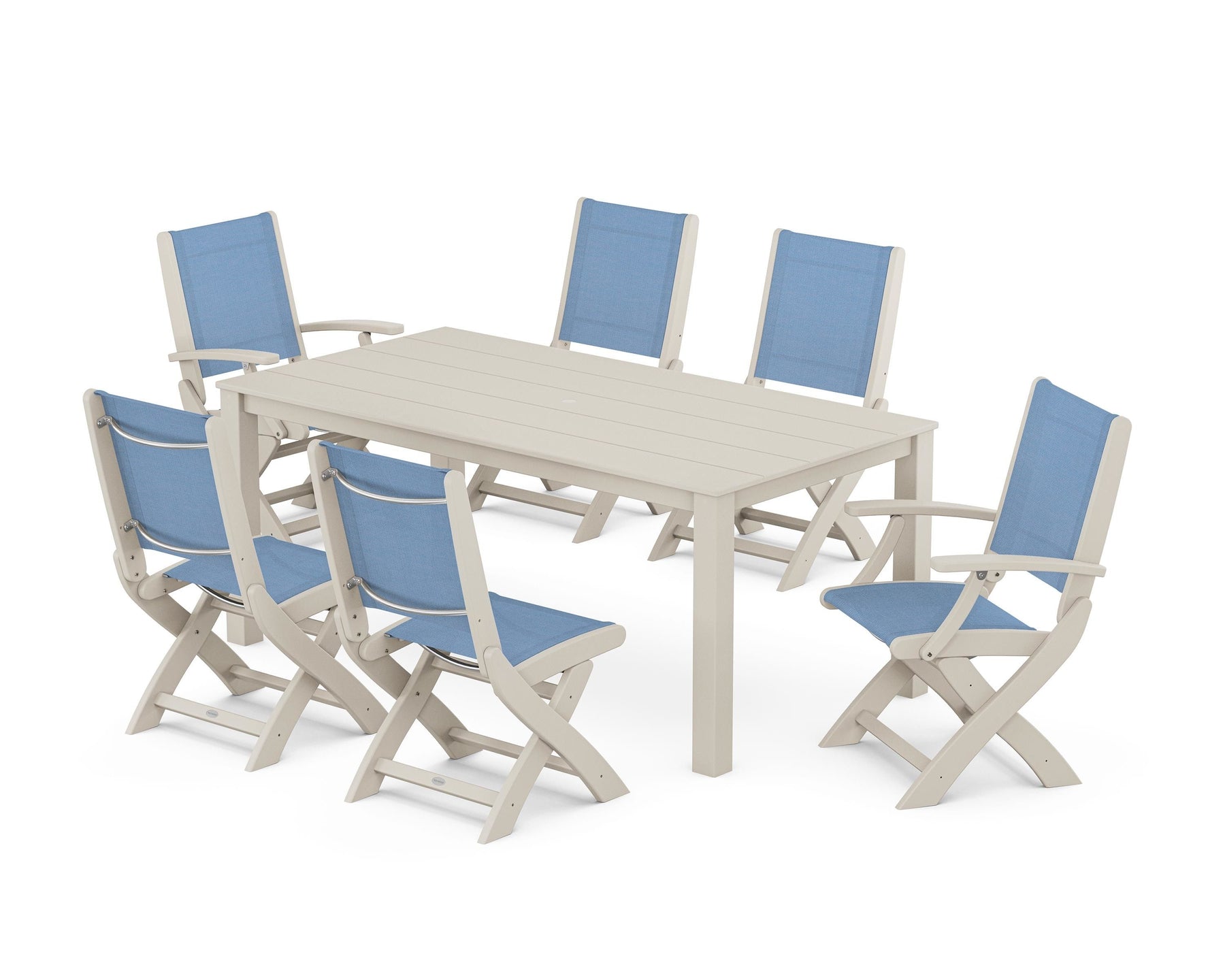 Two words can sum up the Coastal Collection: comfortable and carefree. Designed with materials that withstand all the elements, the Coastal Folding Chair 7-Piece Parsons Dining Set features durable lumber frames and all-weather sling seats with the perfect amount of bounce. Centered around a modernist dining table, this set easily and comfortably accommodates six.