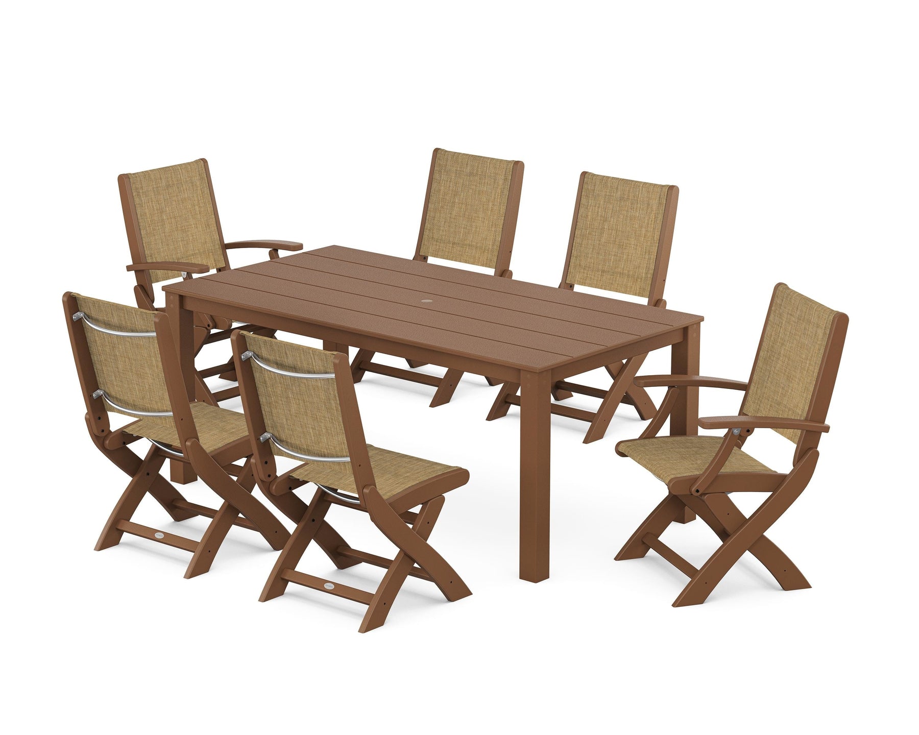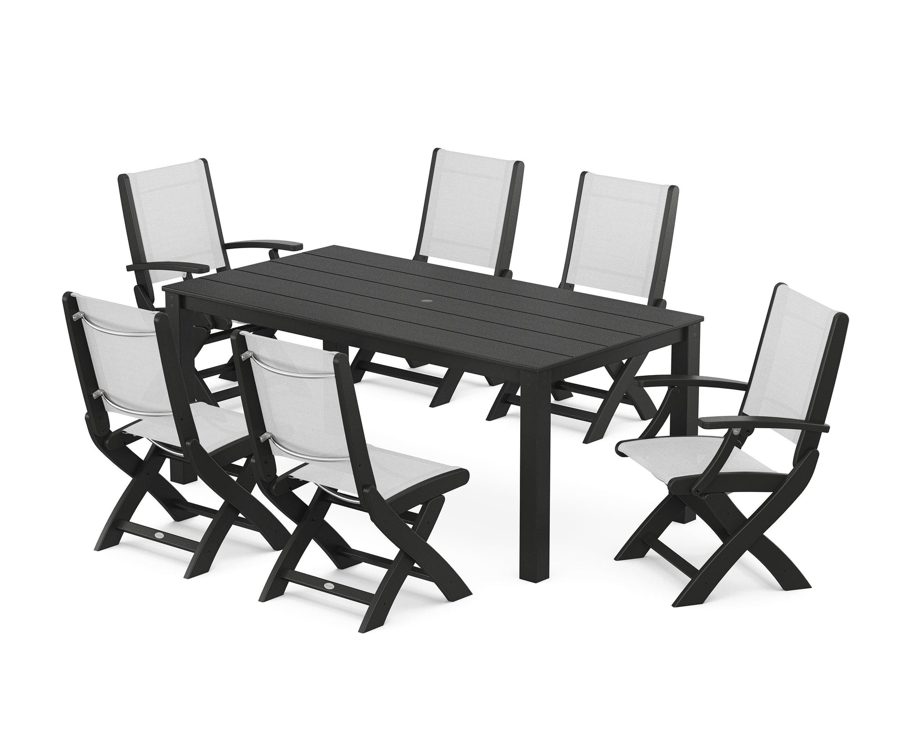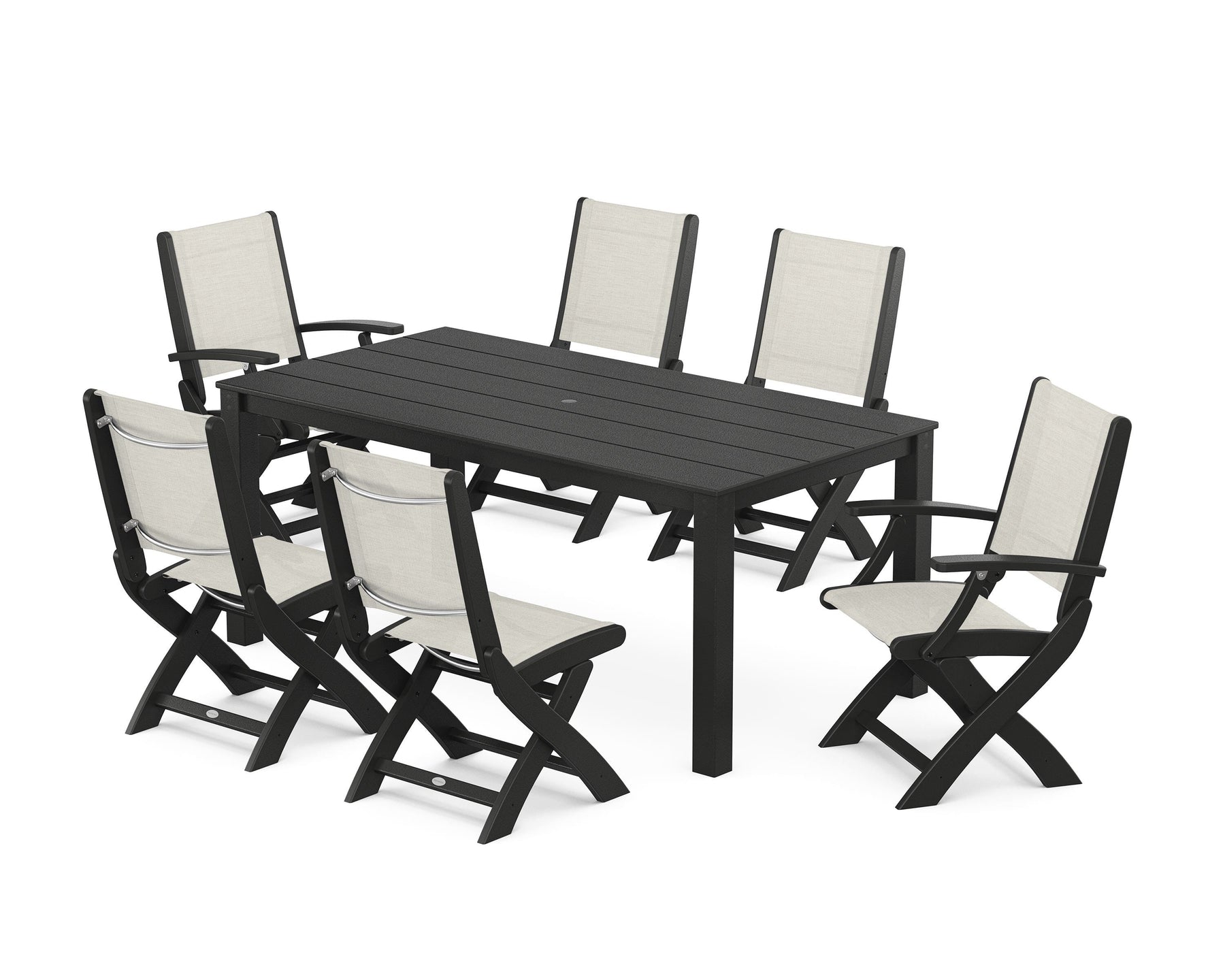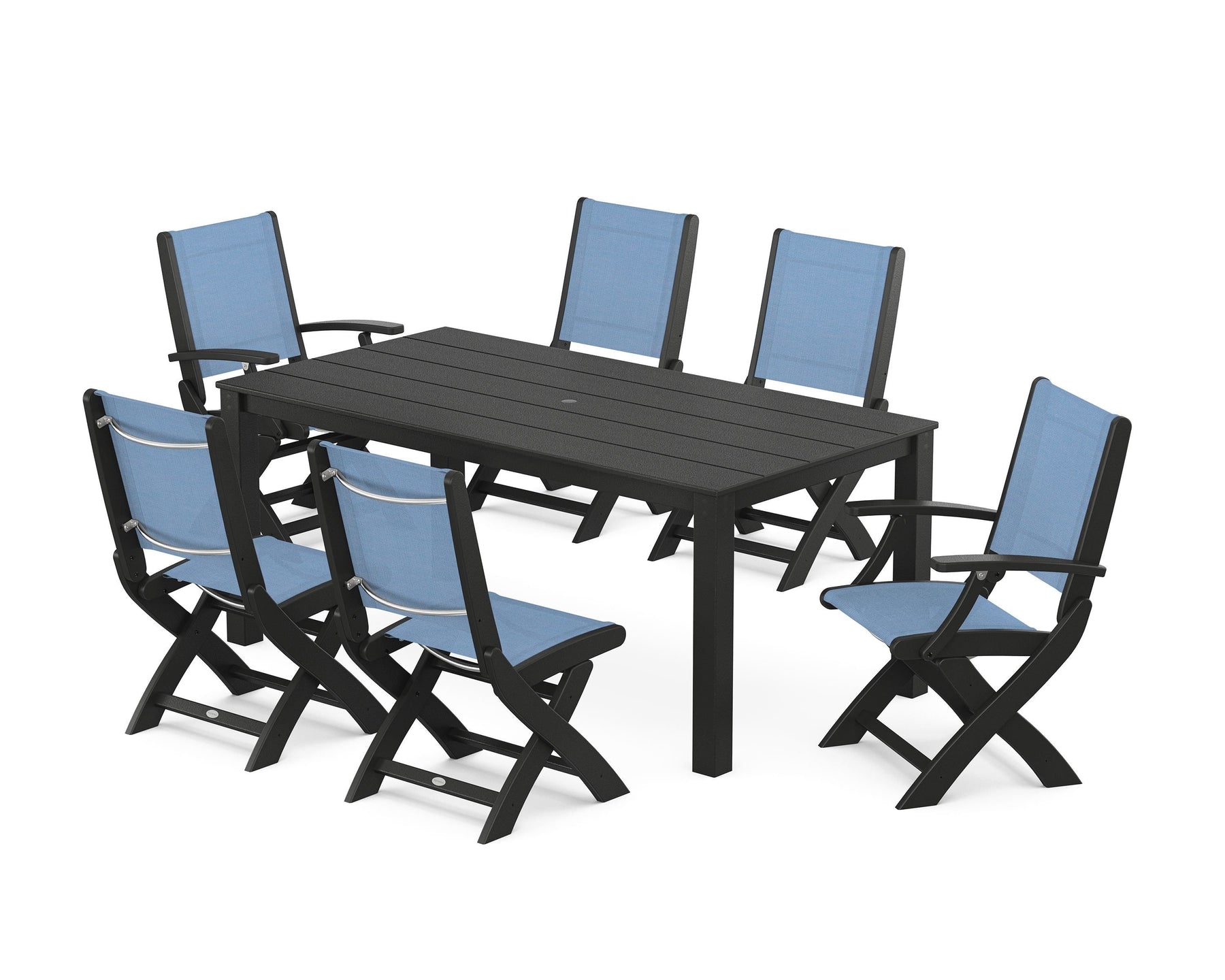 Two words can sum up the Coastal Collection: comfortable and carefree. Designed with materials that withstand all the elements, the Coastal Folding Chair 7-Piece Parsons Dining Set features durable lumber frames and all-weather sling seats with the perfect amount of bounce. Centered around a modernist dining table, this set easily and comfortably accommodates six.