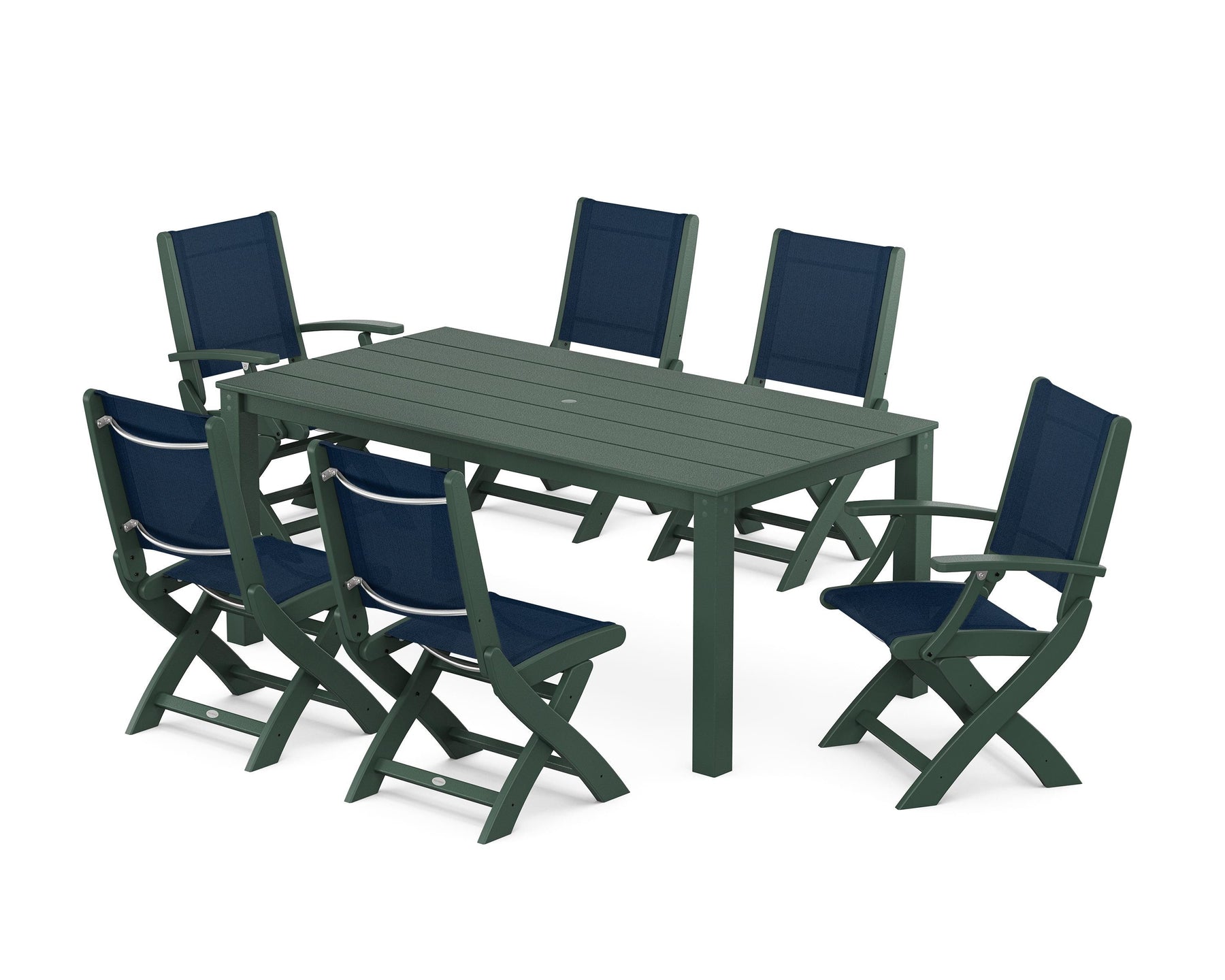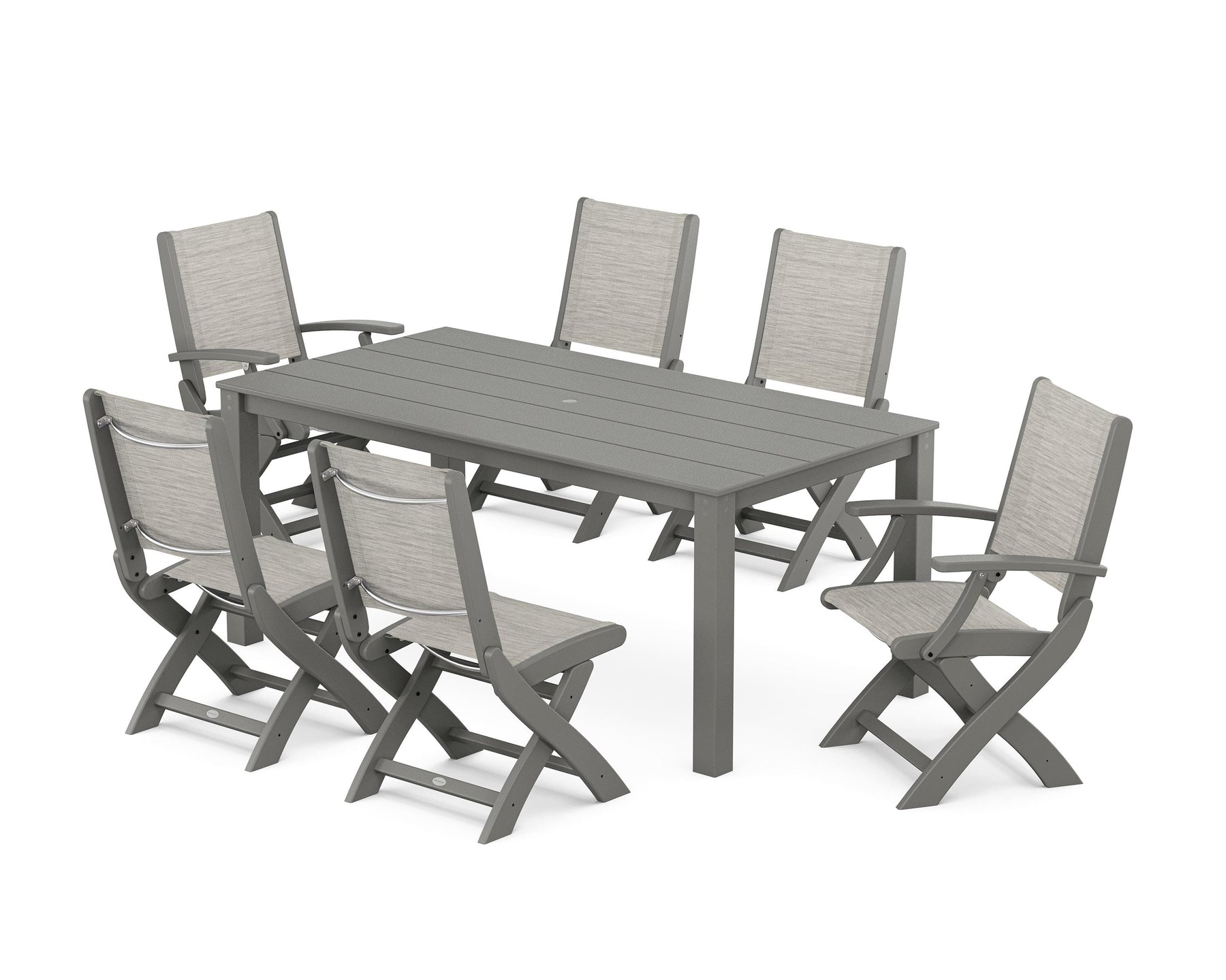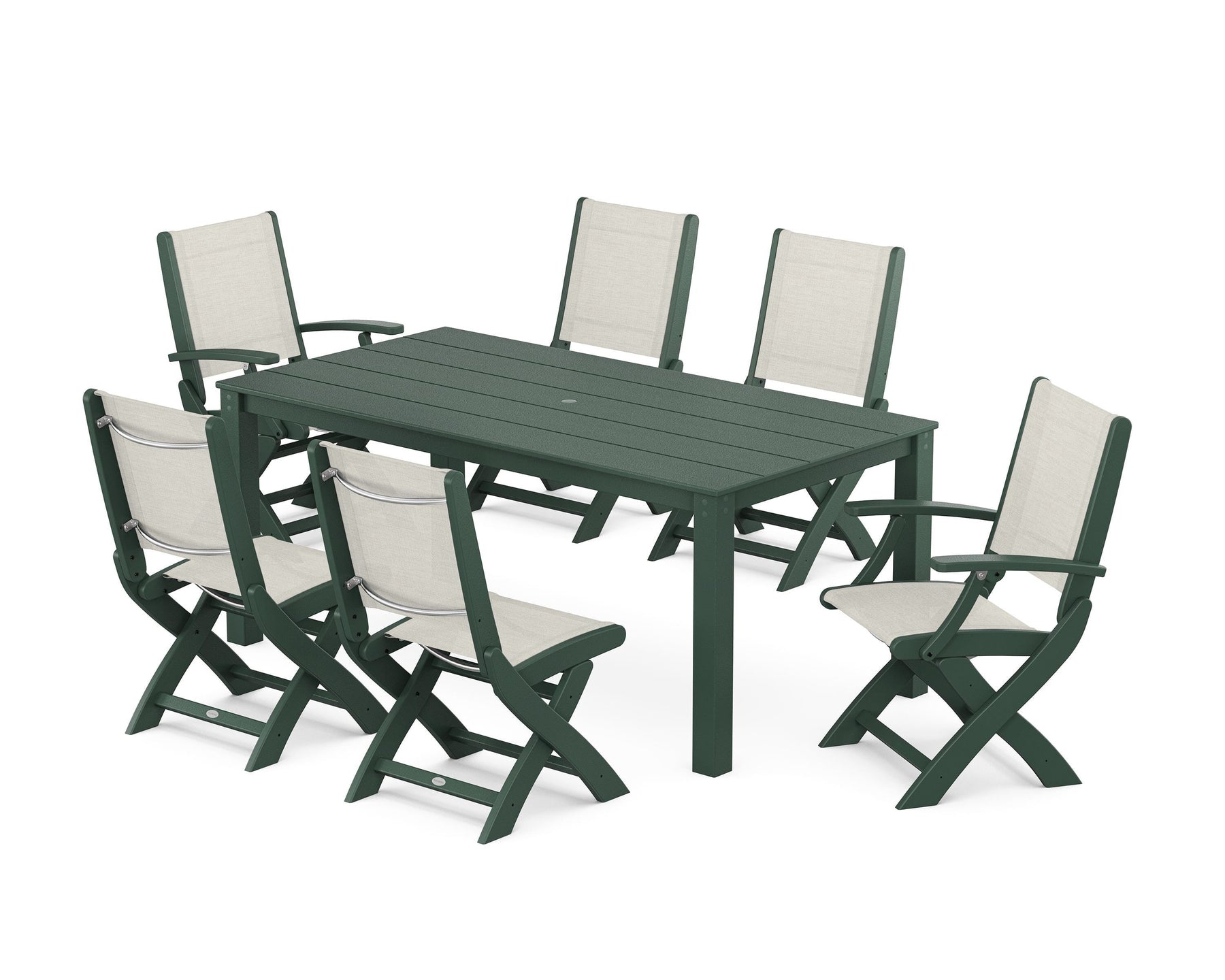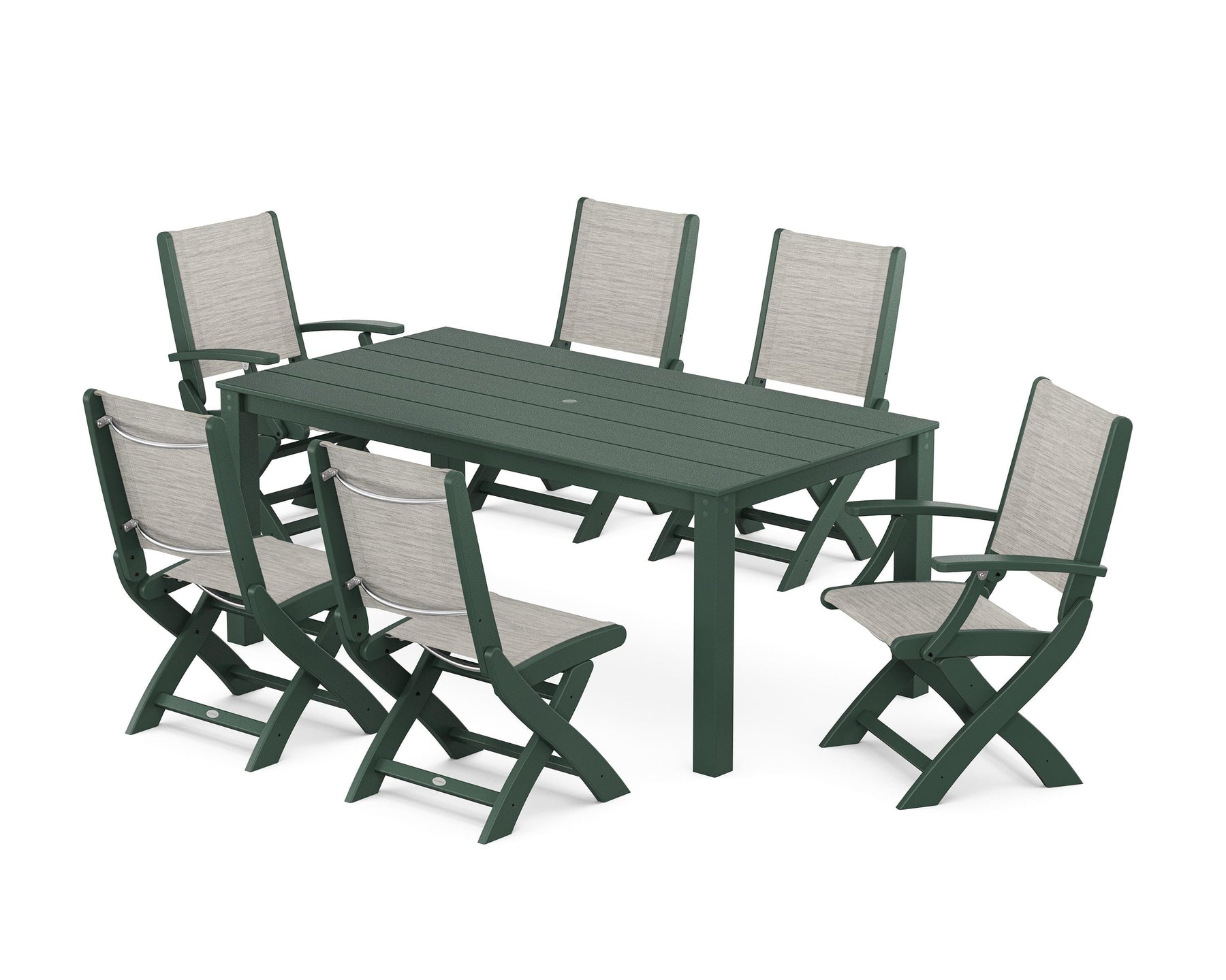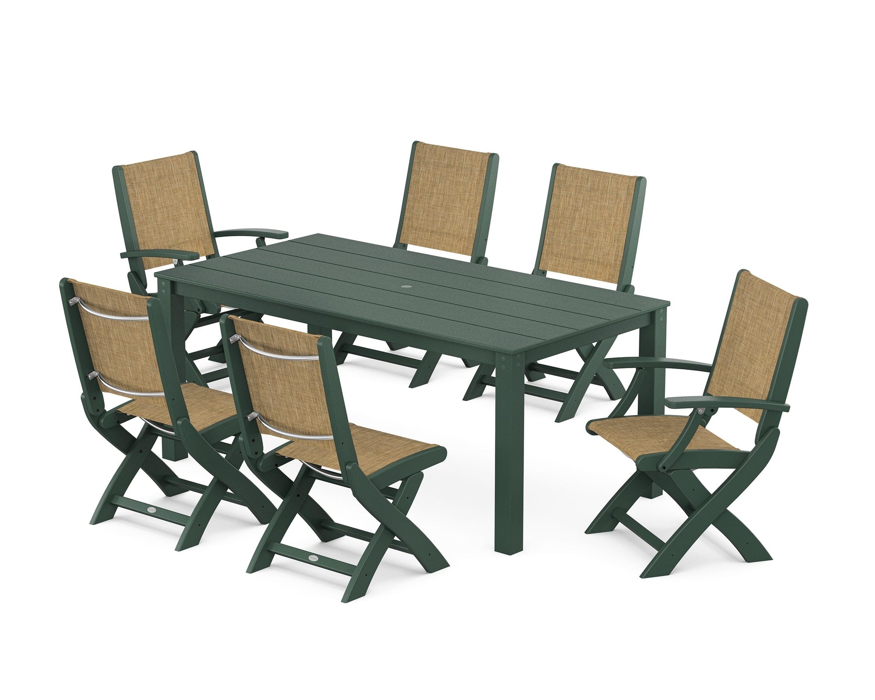 Two words can sum up the Coastal Collection: comfortable and carefree. Designed with materials that withstand all the elements, the Coastal Folding Chair 7-Piece Parsons Dining Set features durable lumber frames and all-weather sling seats with the perfect amount of bounce. Centered around a modernist dining table, this set easily and comfortably accommodates six.