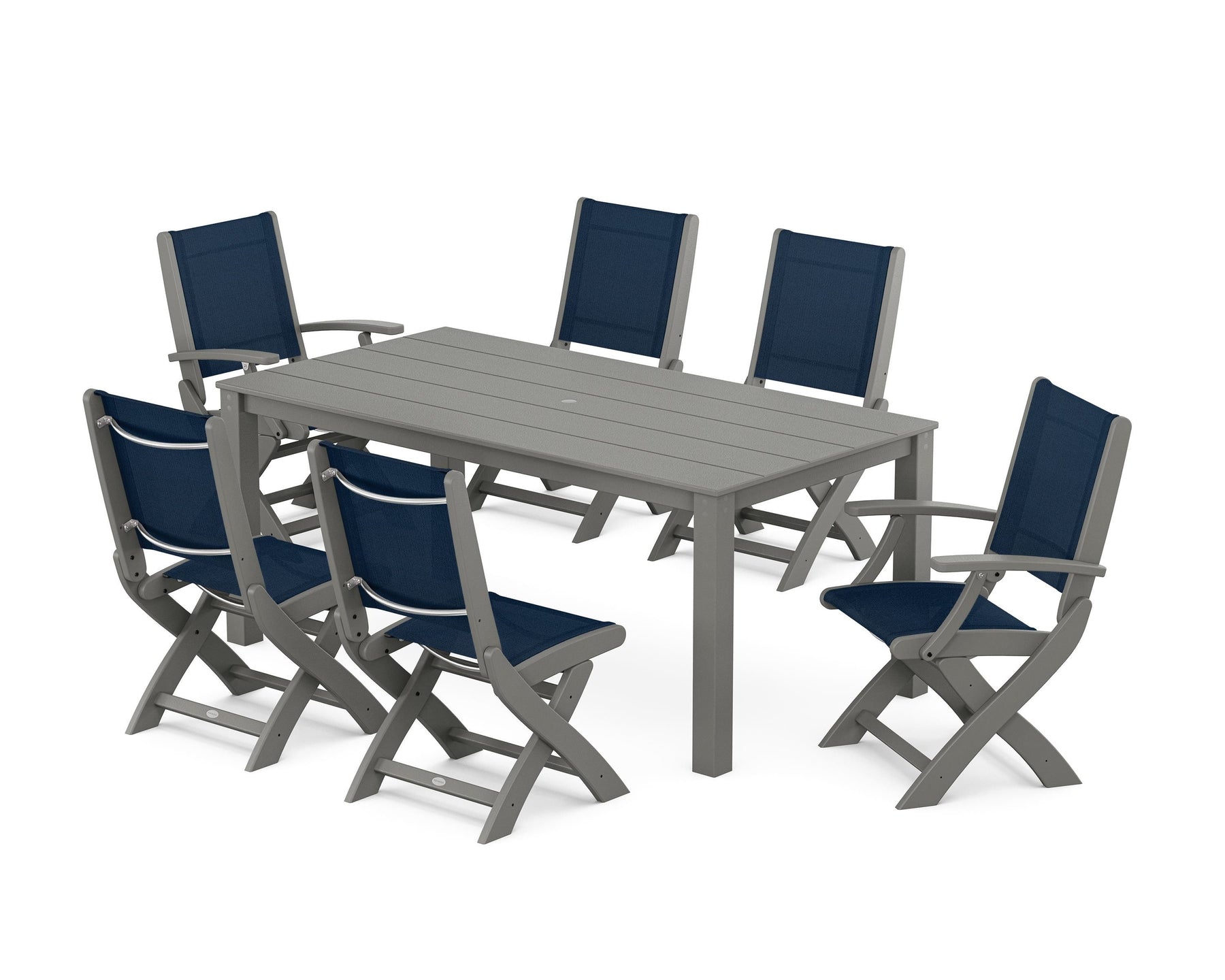 • Set includes (4) Coastal Folding Side Chairs, (2) Coastal Folding Chairs, and (1) Parsons 38" x 72" Dining Table