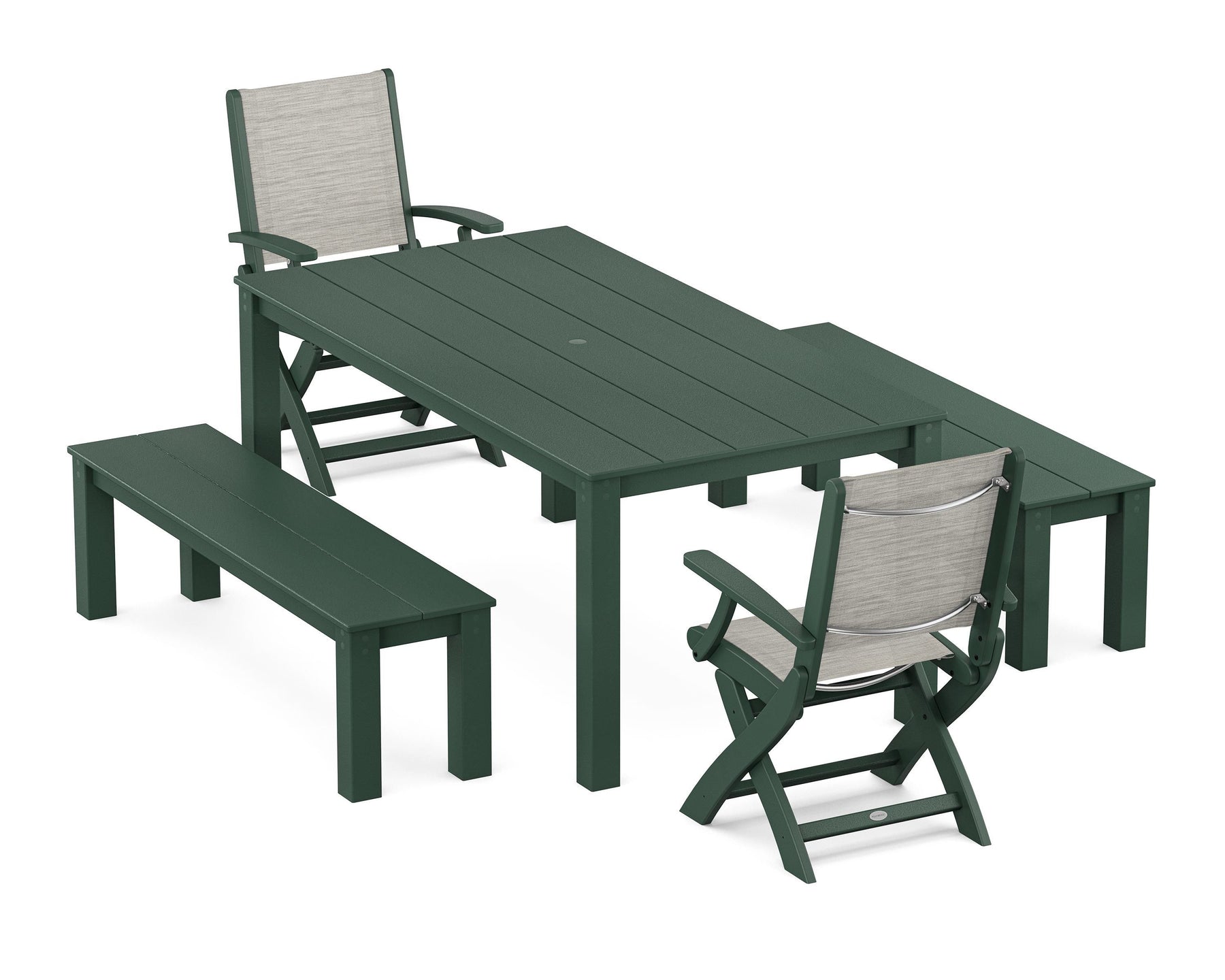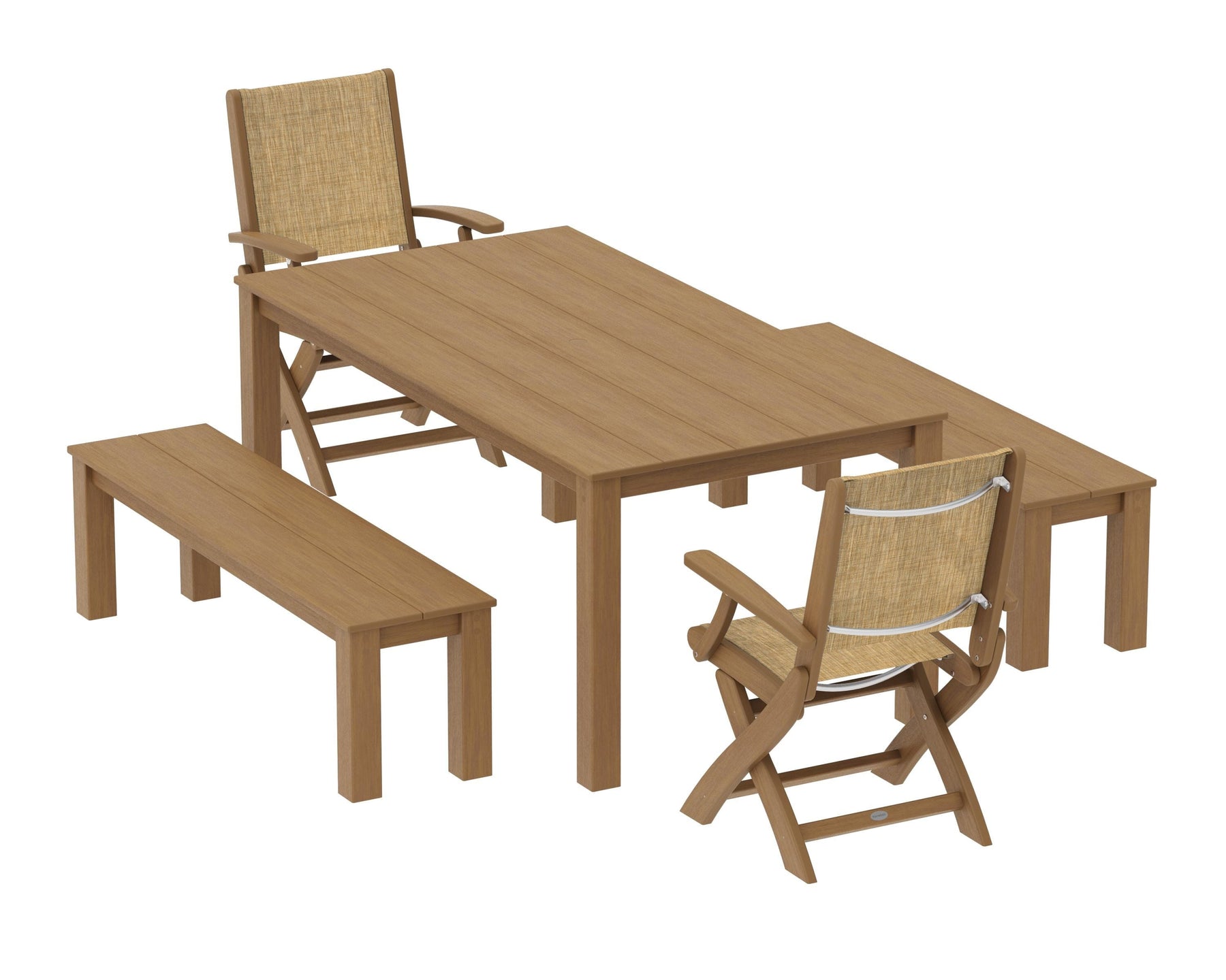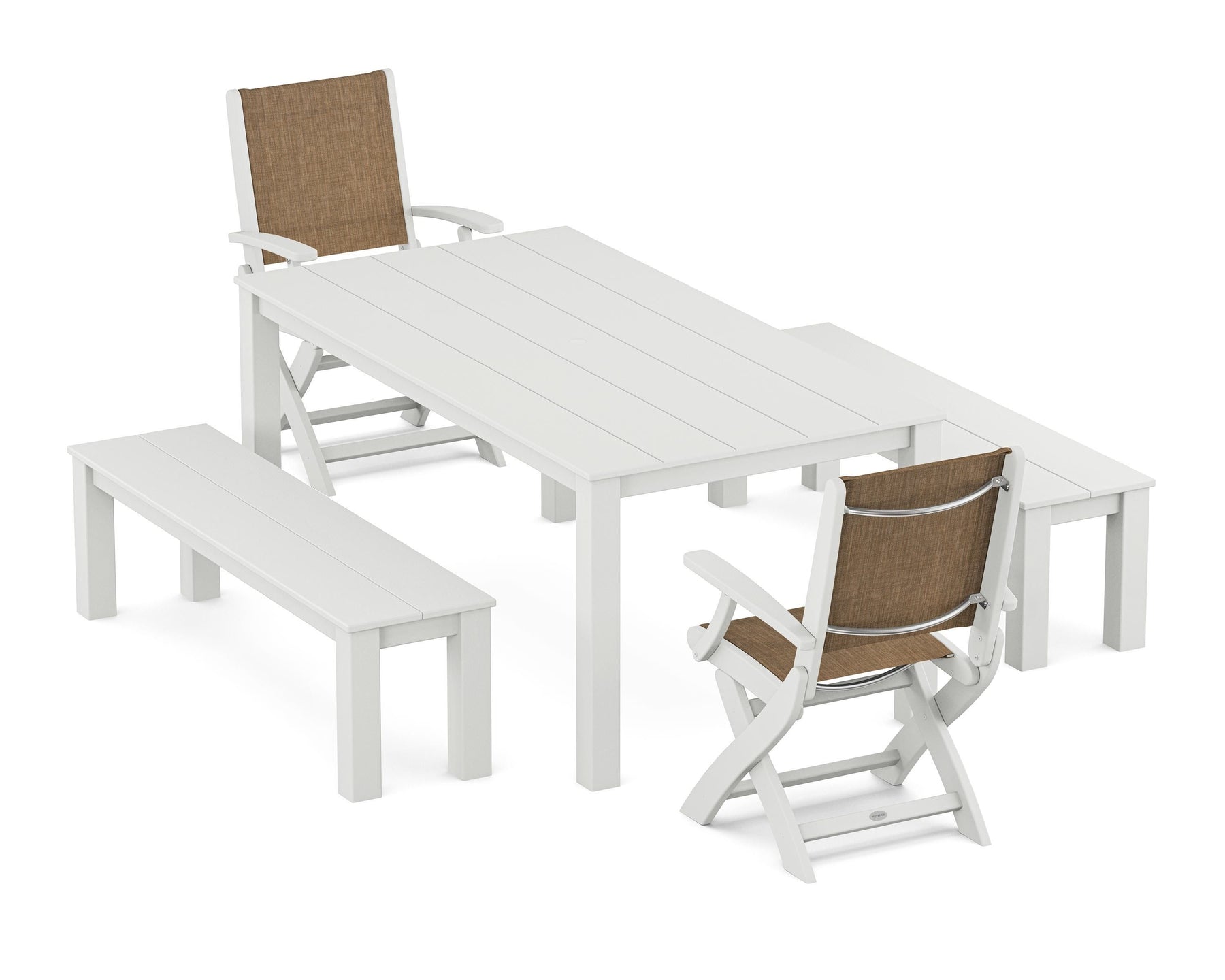 Two words can sum up the Coastal Collection: comfortable and carefree. Designed with materials that withstand all the elements, the Coastal Folding Chair 5-Piece Parsons Dining Set with Benches features durable lumber frames and all-weather sling seats with the perfect amount of bounce. Centered around a modernist dining table and matching bench, this set easily and comfortably accommodates a family or friend group.