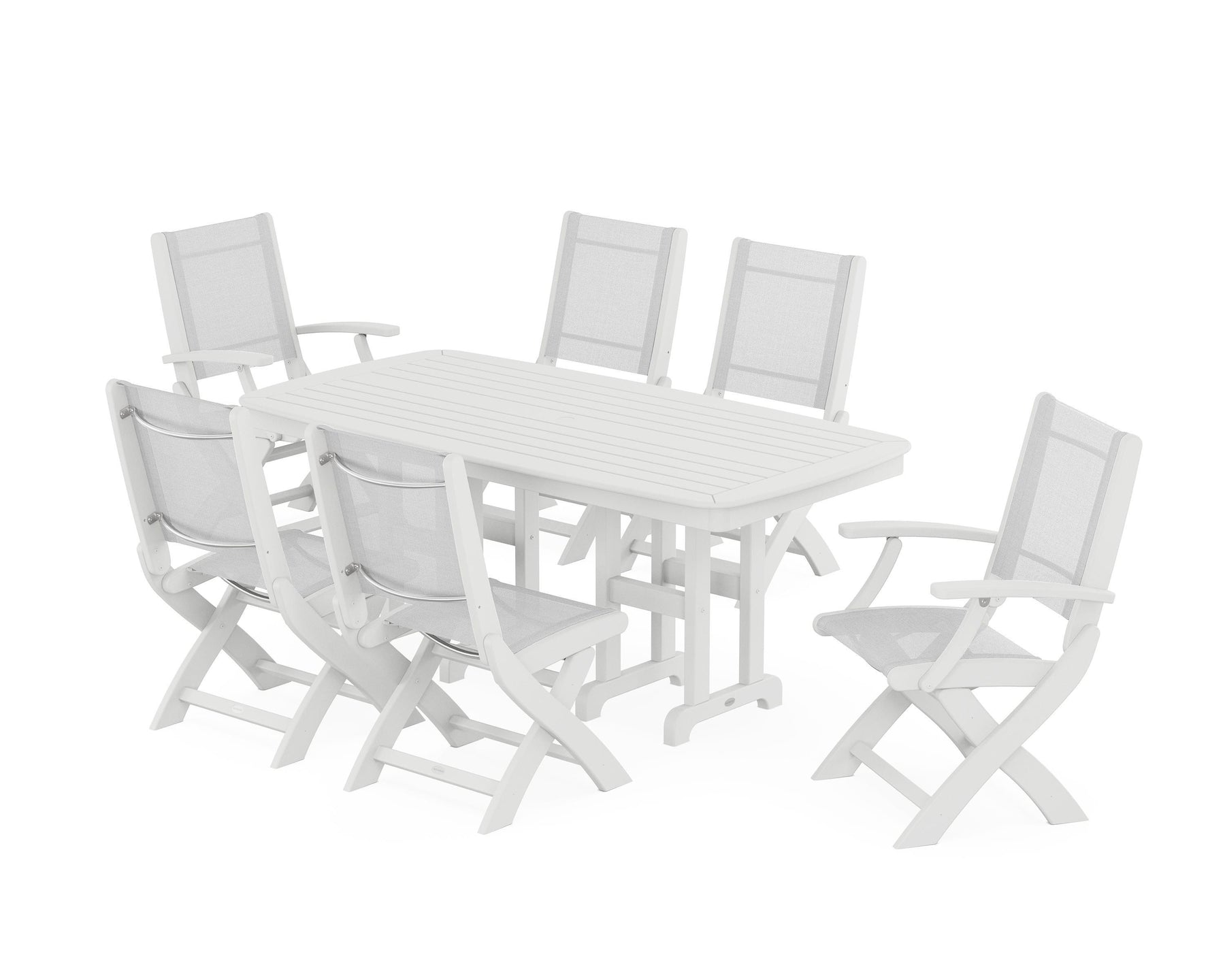 Two words can sum up the Coastal Collection: comfortable and carefree. Designed with materials that withstand all the elements, these dining chairs feature genuine POLYWOOD lumber frames and all-weather sling seats with the perfect amount of bounce. While the versatile seats work with any and all style preferences, we love the look of the Coastal 7-Piece Dining Set, which pairs four folding side chairs and two folding armchairs with a rectangle dining table.