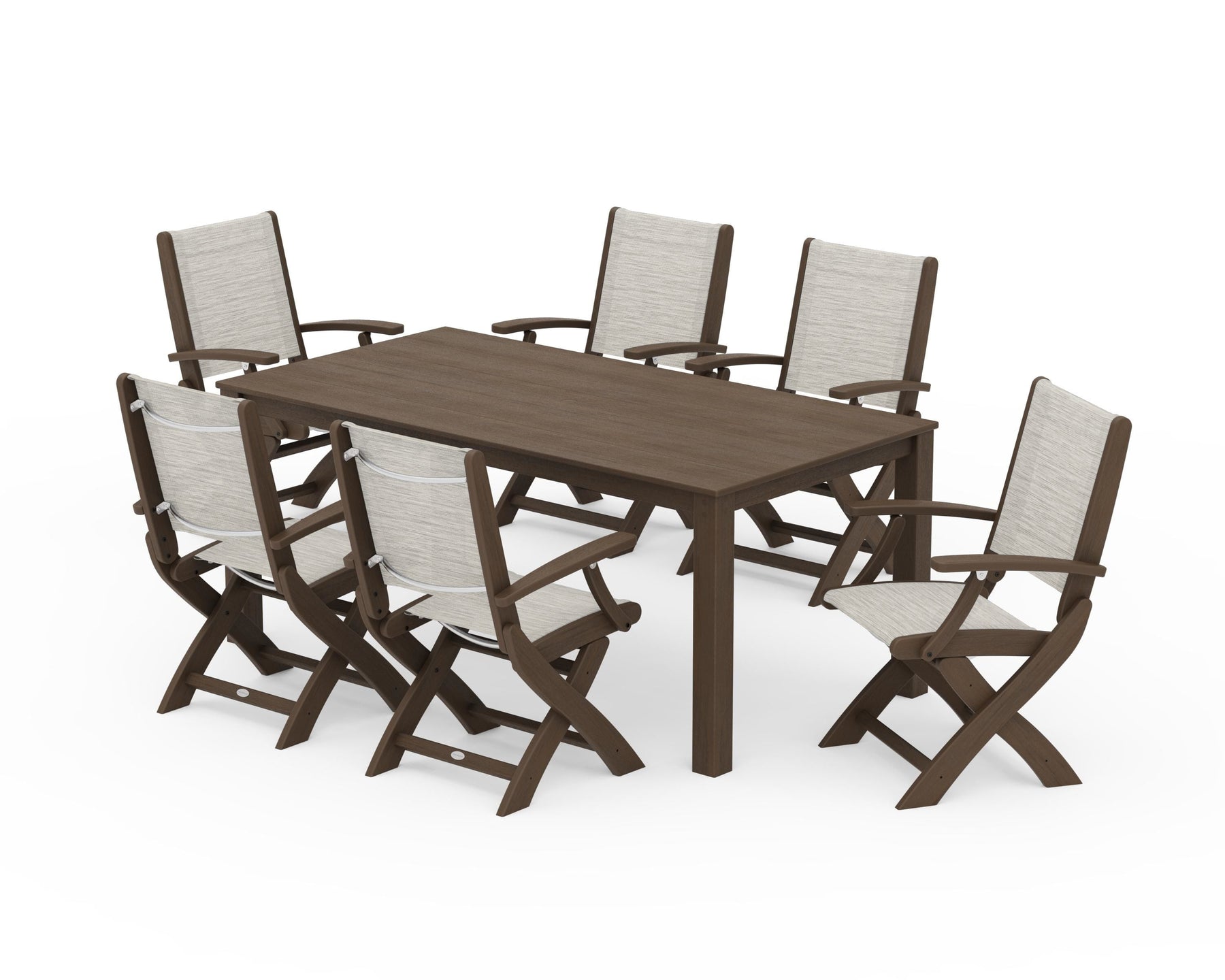 Two words can sum up the Coastal Collection: comfortable and carefree. Designed with materials that withstand all the elements, the Coastal Folding Chair 7-Piece Parsons Dining Set features durable lumber frames and all-weather sling seats with the perfect amount of bounce. Centered around a modernist dining table, this set easily and comfortably accommodates six.