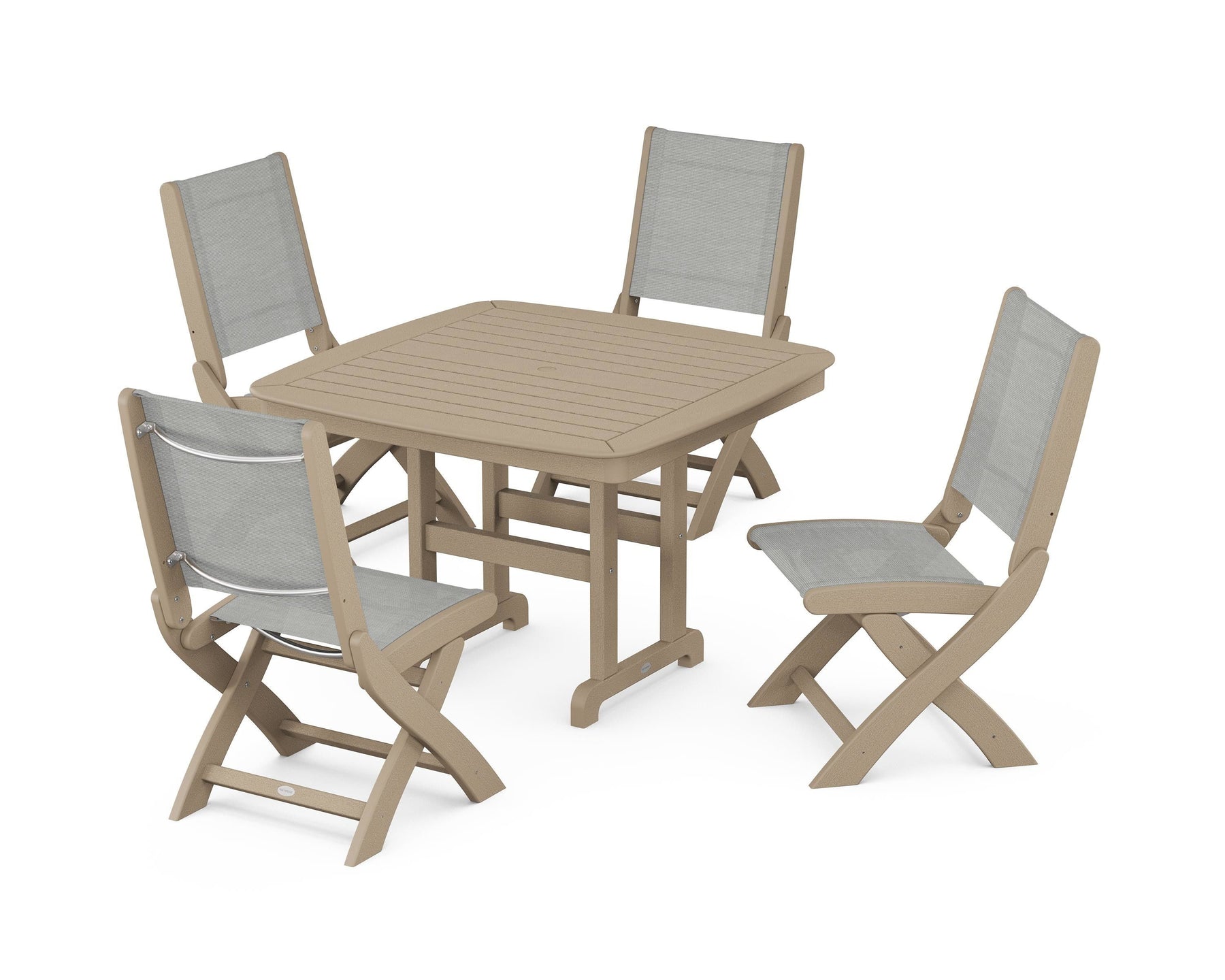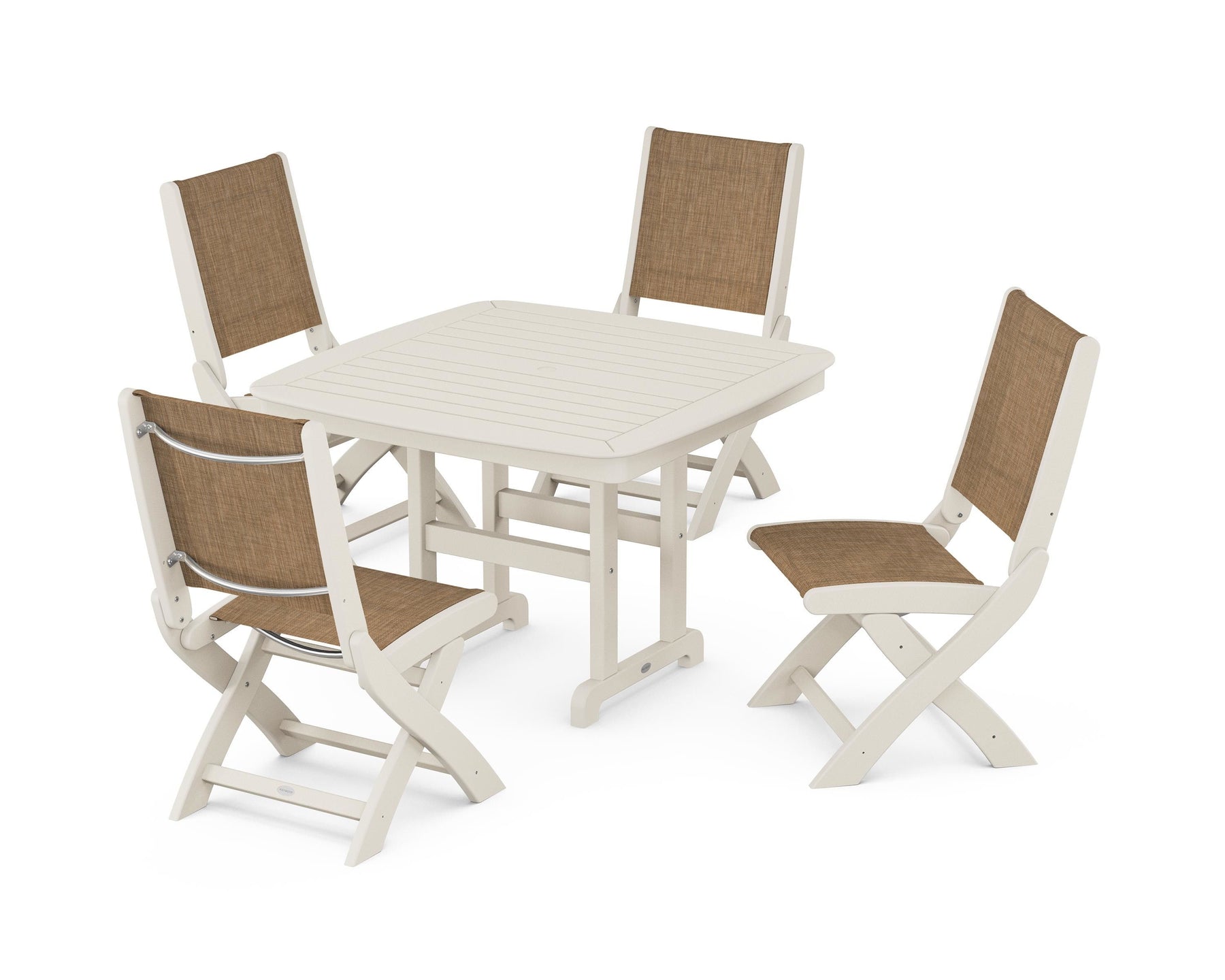 Two words sum up the Coastal Collection: comfortable and carefree. Designed with materials that withstand all the elements, the Coastal Folding Side Chair 5-Piece Dining Set features durable lumber frames and all-weather sling seats for a resort-inspired look and feel. Centered around a stylish table, this set easily and comfortably accommodates a family of four. Whenever you need extra space, simply fold the side chairs down and tuck them away.