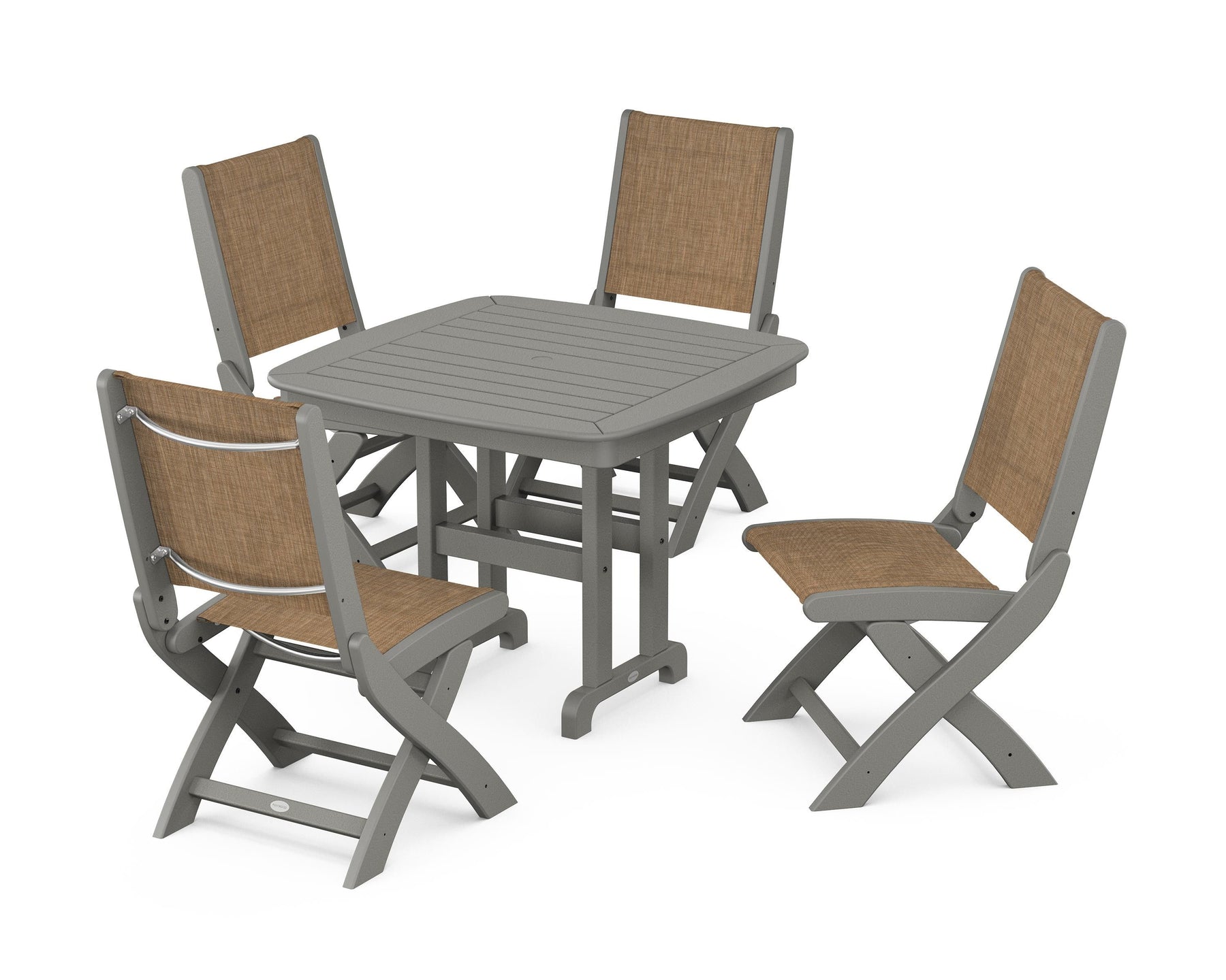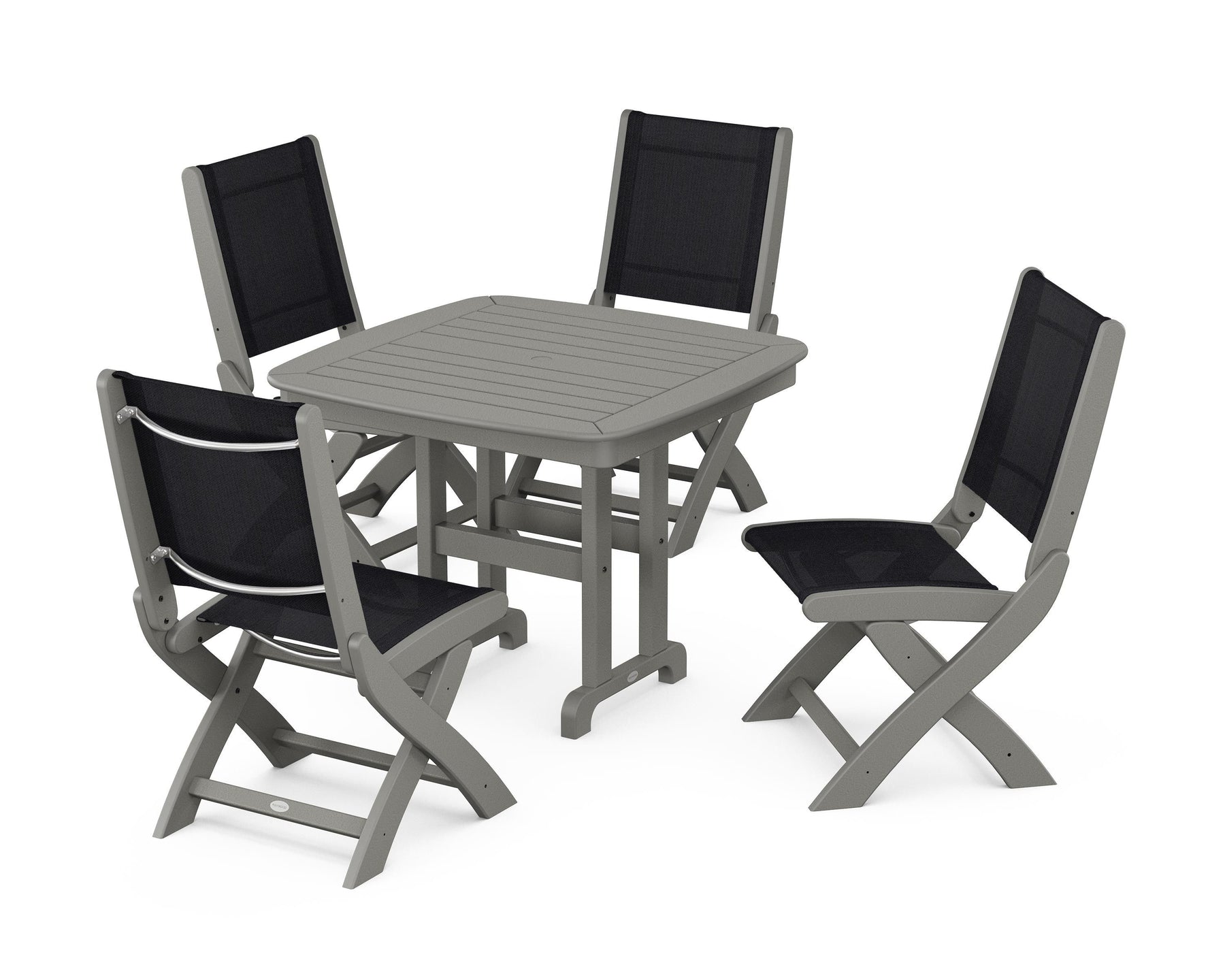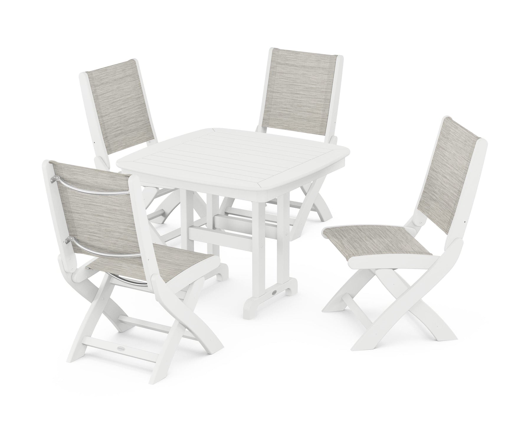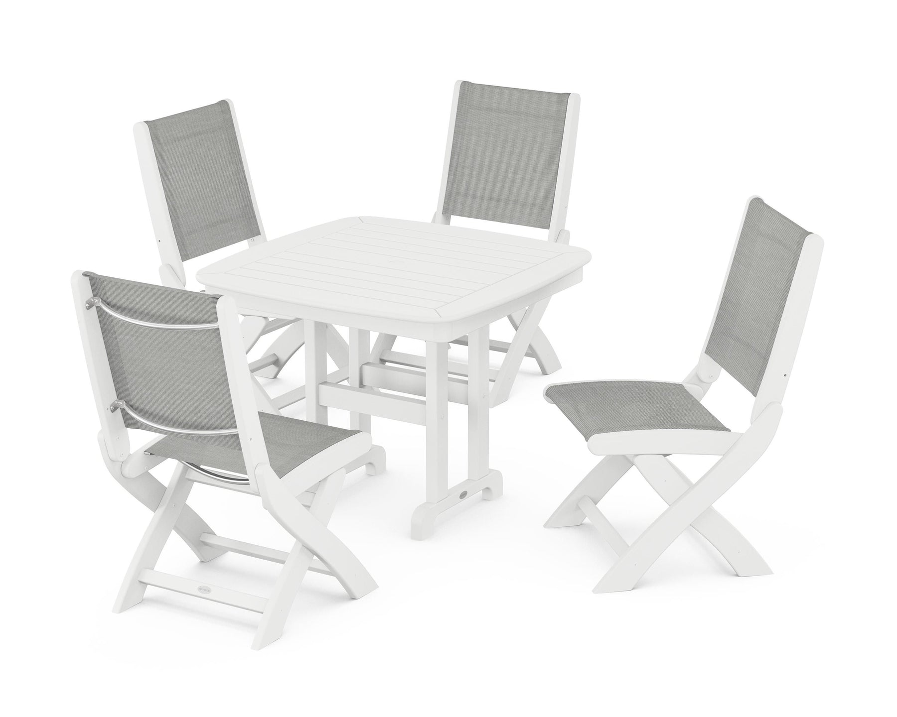 Two words can sum up the Coastal Collection: comfortable and carefree. Designed with materials that withstand all the elements, these dining chairs feature genuine POLYWOOD lumber frames and all-weather sling seats with the perfect amount of bounce. While the versatile seats work with any and all style preferences, we love the look of the Coastal Side Chair 5-Piece Dining Set, which pairs four folding side chairs with a square dining table.