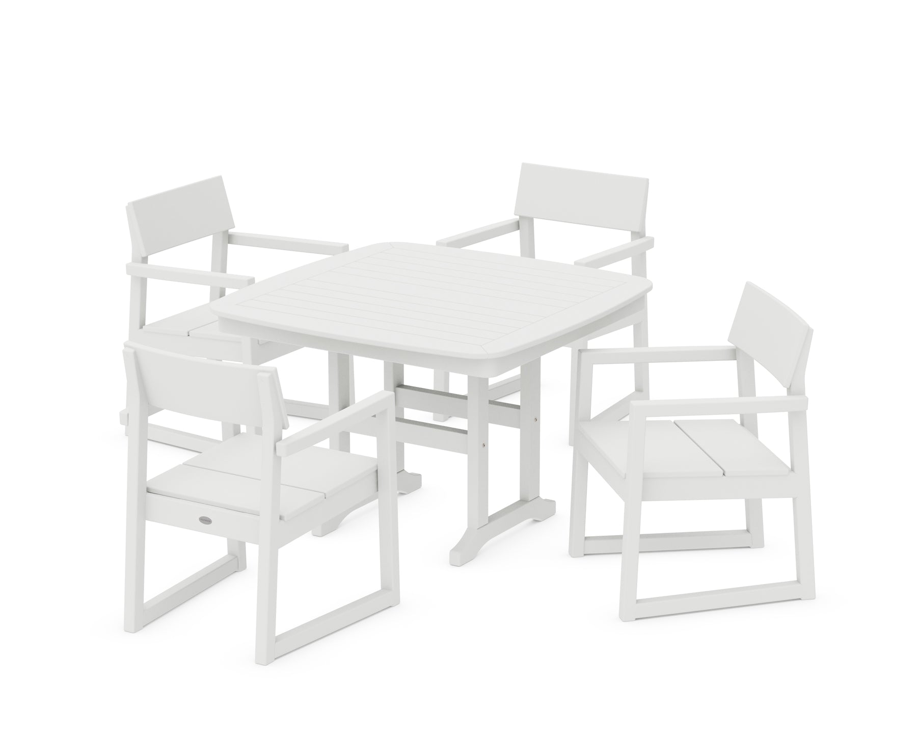 The EDGE Collection merges minimalism with sustainable design, creating all-weather furniture that leaves a lasting impression. With options sized just right for any layout, our modern outdoor dining collection seats everyone comfortably, whether you're hosting dinner on a spacious patio or an intimate balcony. The sleek EDGE 5-Piece Dining Set with Trestle Legs includes one square table and four armchairs that boast wide seats and gently contoured backrests.