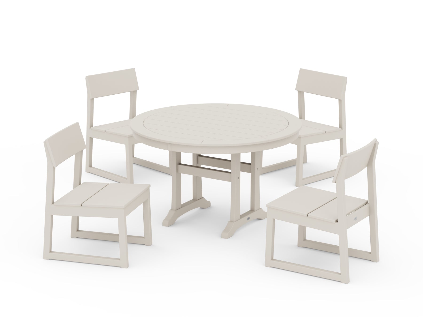 The EDGE Collection merges minimalism with sustainable design, creating all-weather furniture that leaves a lasting impression. With options sized just right for any layout, our modern outdoor dining collection seats everyone comfortably, whether you're hosting dinner on a spacious patio or an intimate balcony. The sleek EDGE Side Chair 5-Piece Round Dining Set With Trestle Legs includes one round table and four side chairs that boast wide seats and gently contoured backrests.