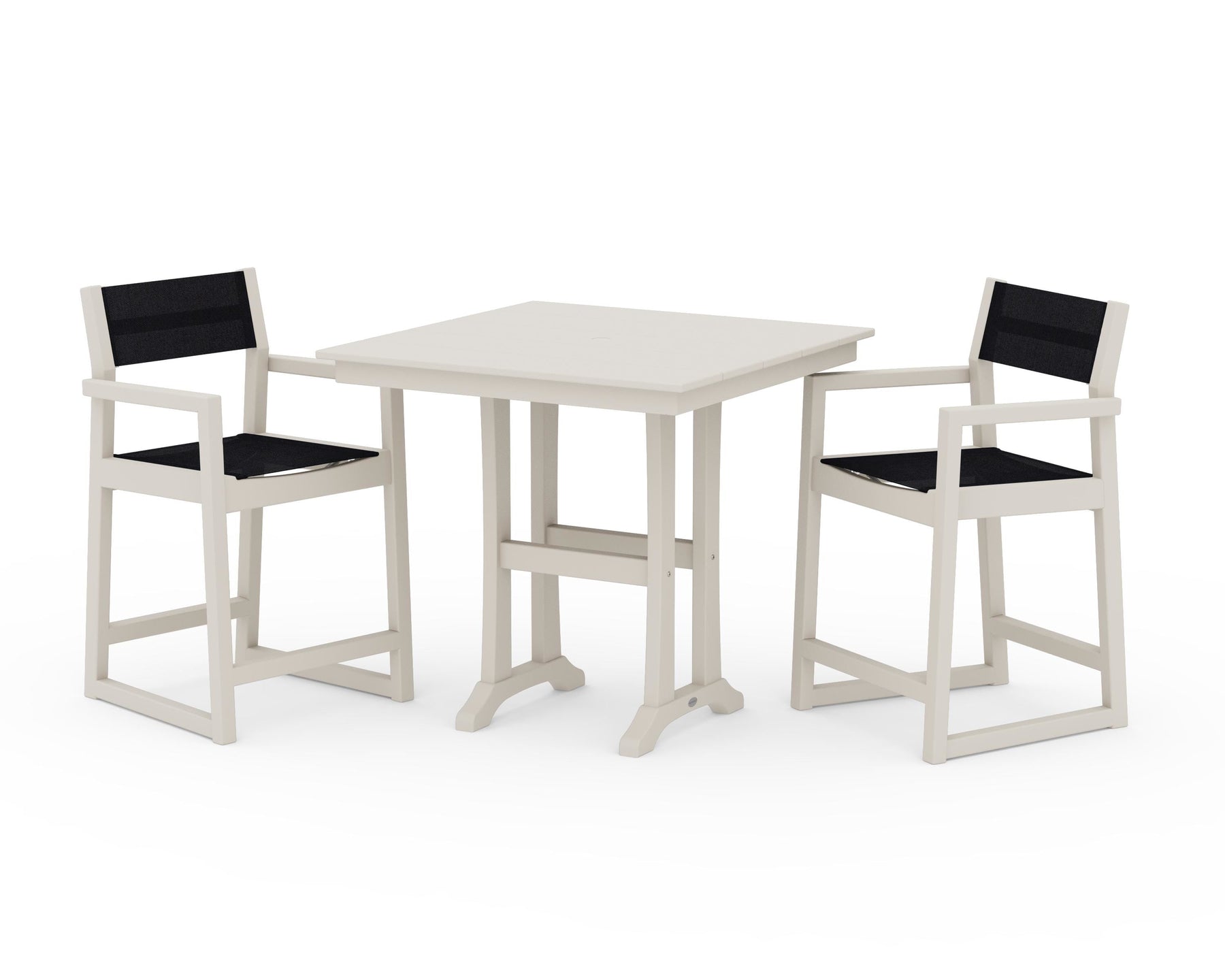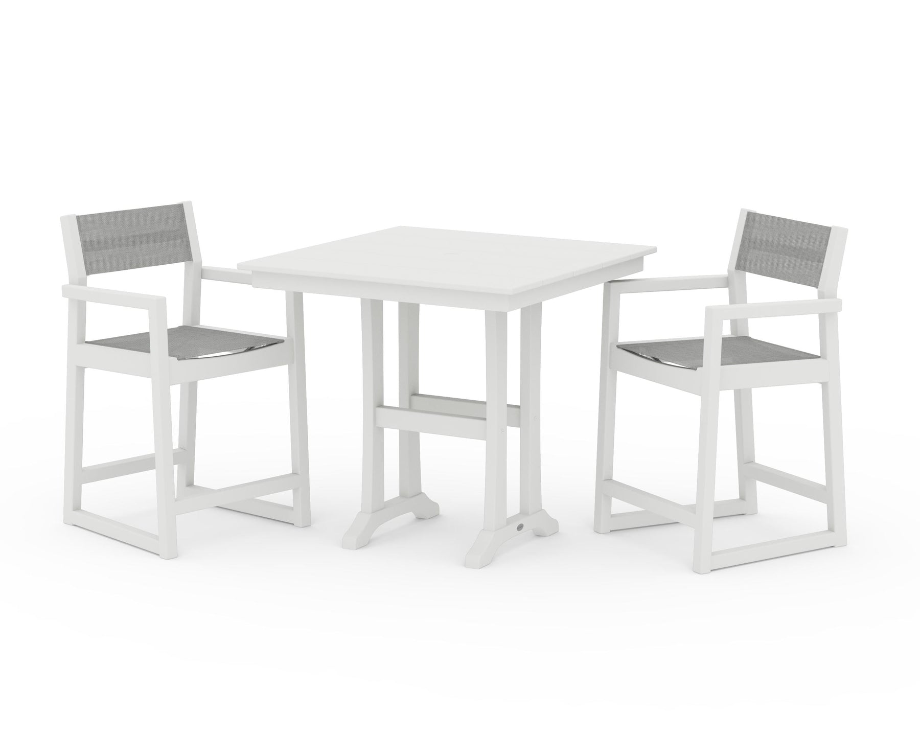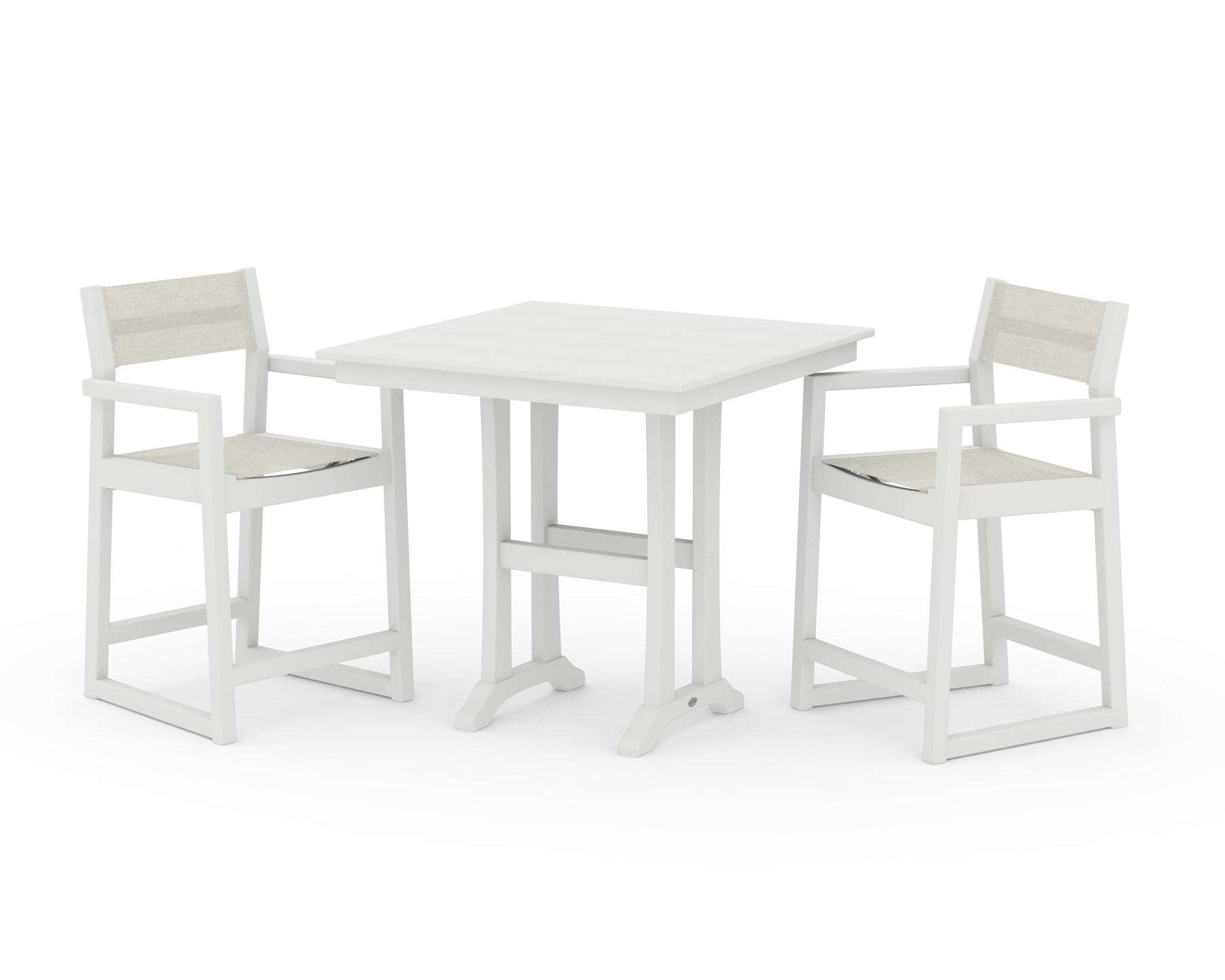 Entertain with ease and spend your evenings outside around the EDGE Sling Arm Chair 3-Piece Farmhouse Counter Set with Trestle Legs. This all-weather set is great for small spaces and features a sleek design made for the modern home. The breathable sling seating offers comfort, enduring support, and resort-inspired style.