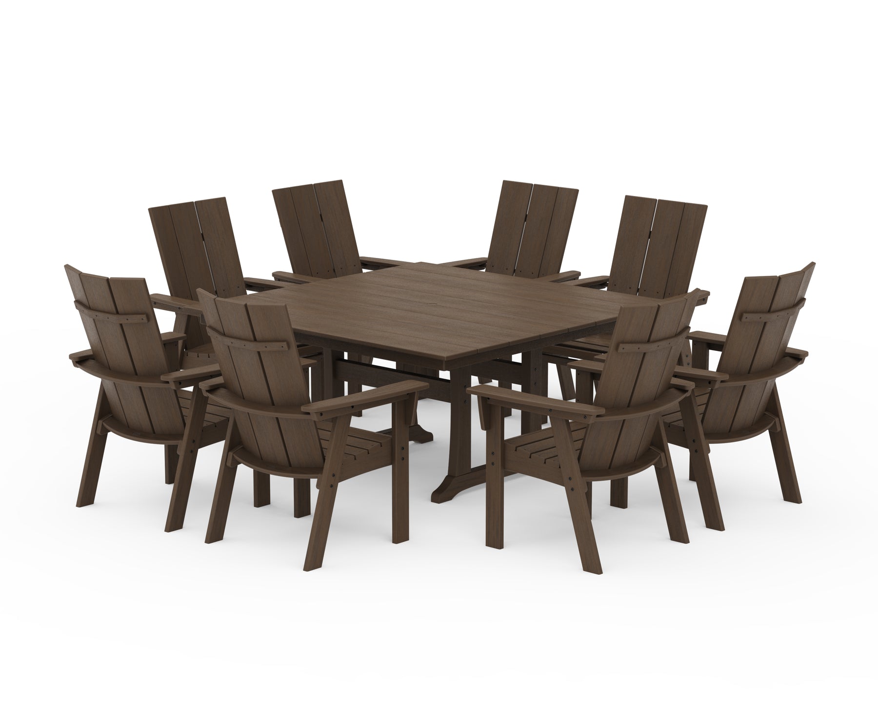 Our best-selling Modern Adirondack Collection reimagines an iconic design in clean, symmetrical lines inspired by minimalist style. The Modern Curveback Adirondack 9-Piece Dining Set with Trestle Legs offers comfortable, curved-back seating for eight guests around a spacious table. Fire up the grill, invite the neighbors, and savor more moments together—this party-ready set serves as the perfect backdrop for outdoor entertaining.