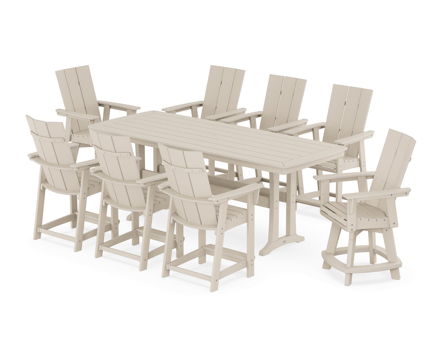 • Set includes (1) Nautical Trestle 39" x 97" Counter Table, (6) Modern Curveback Adirondack Counter Chairs, and (2) Modern Curveback Adirondack Swivel Counter Chairs