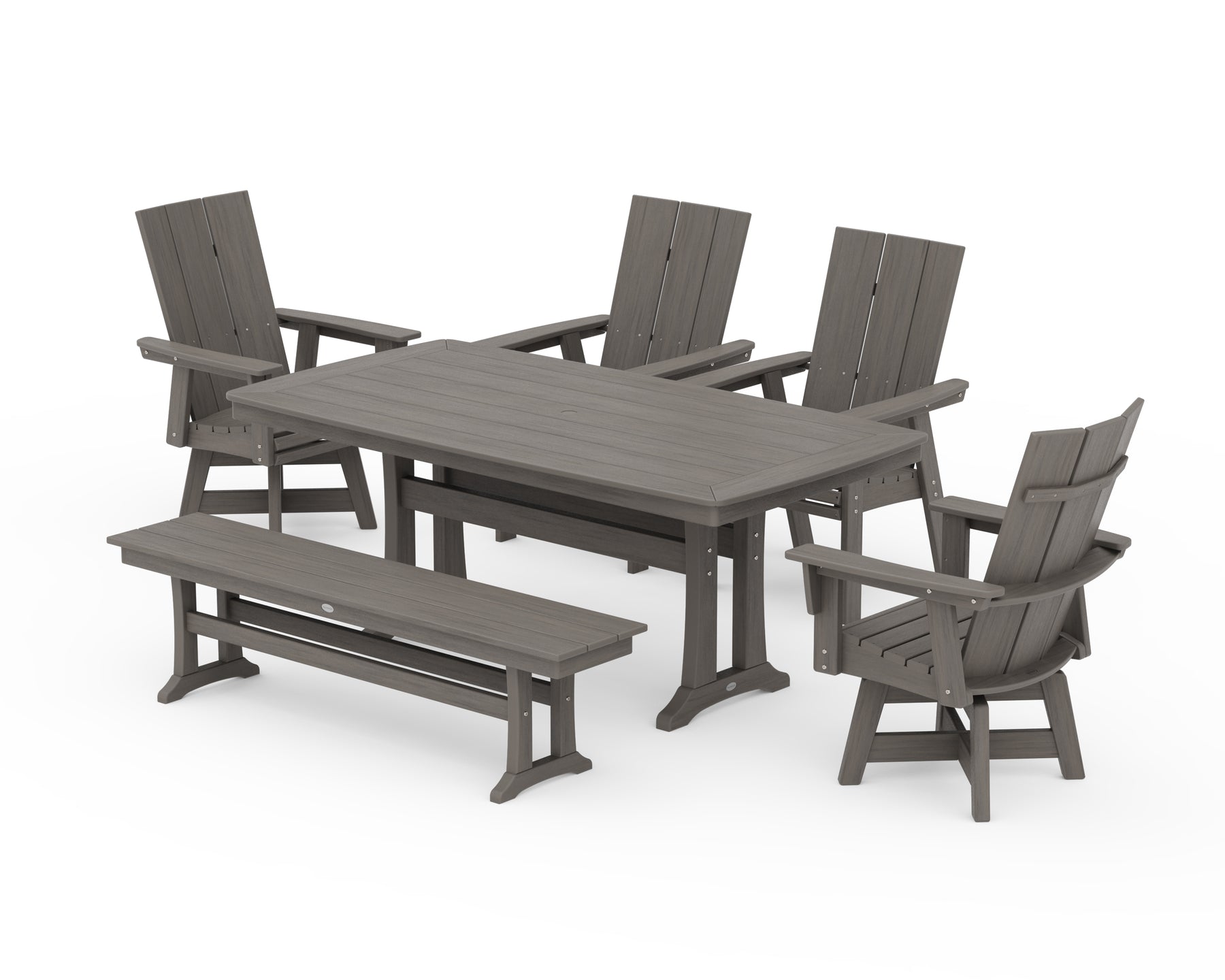 POLYWOOD® Modern Curveback Adirondack Swivel Chair 6-Piece Dining Set with Trestle Legs and Bench