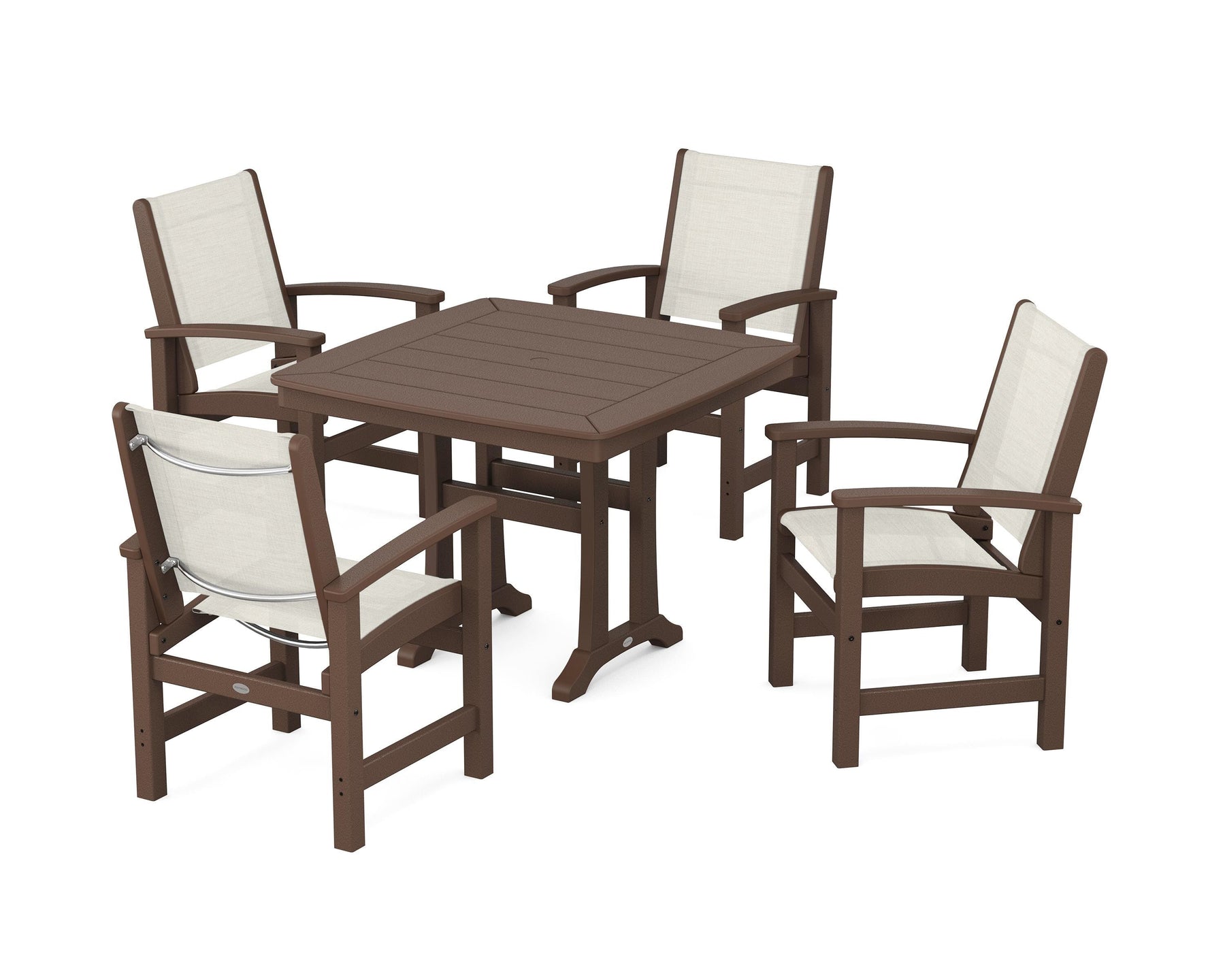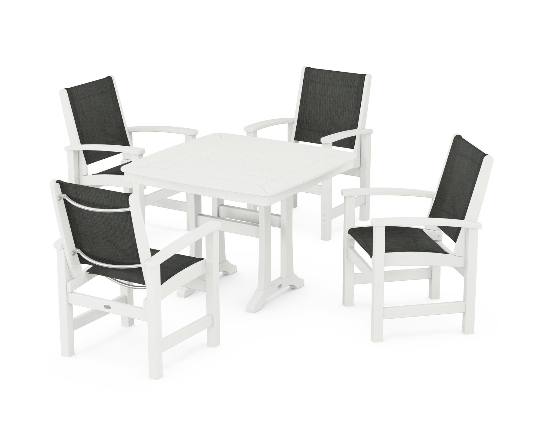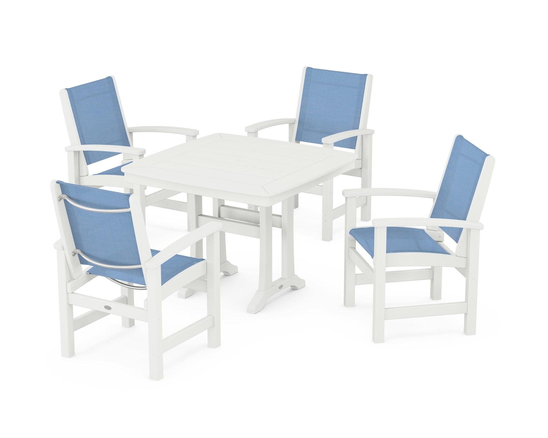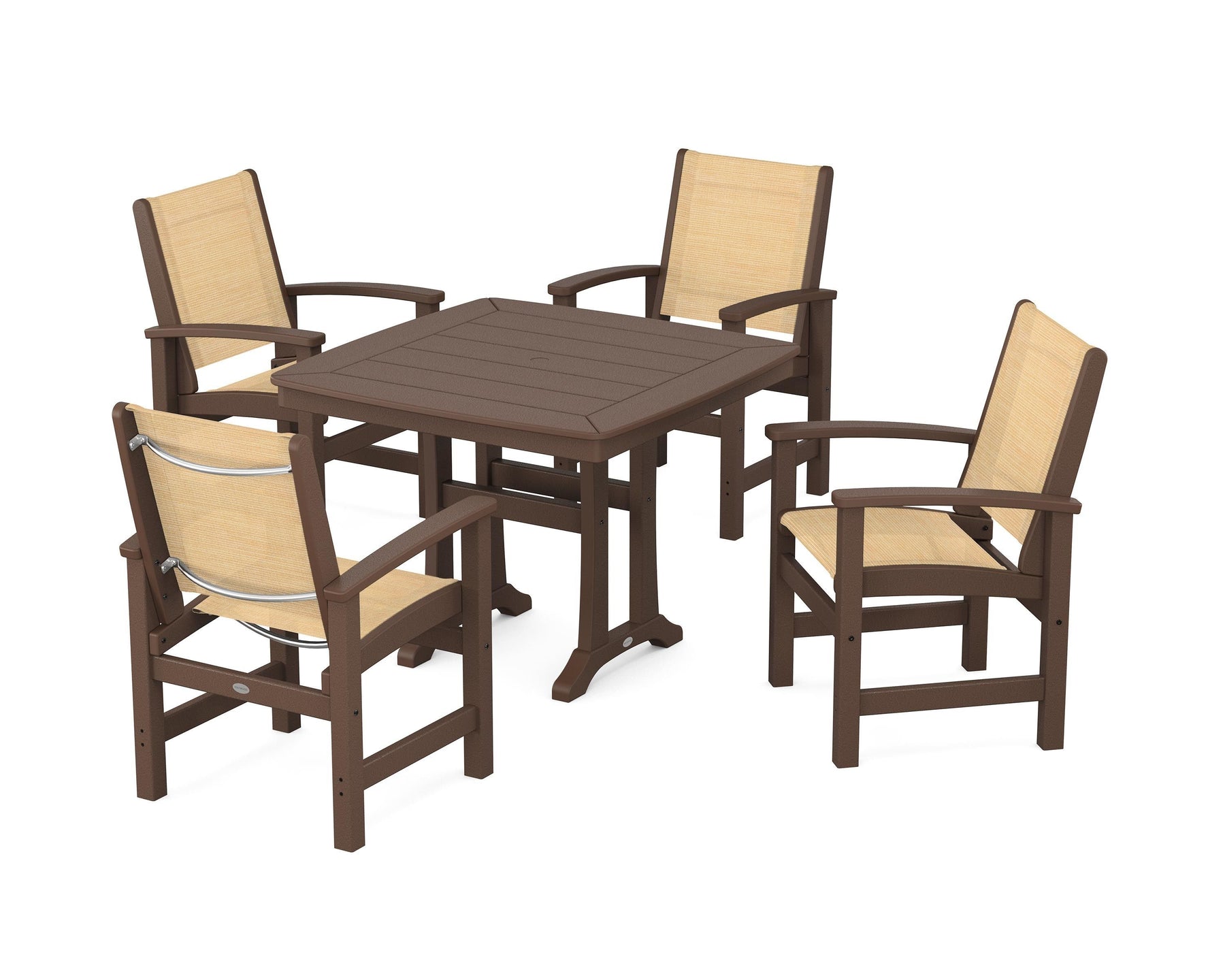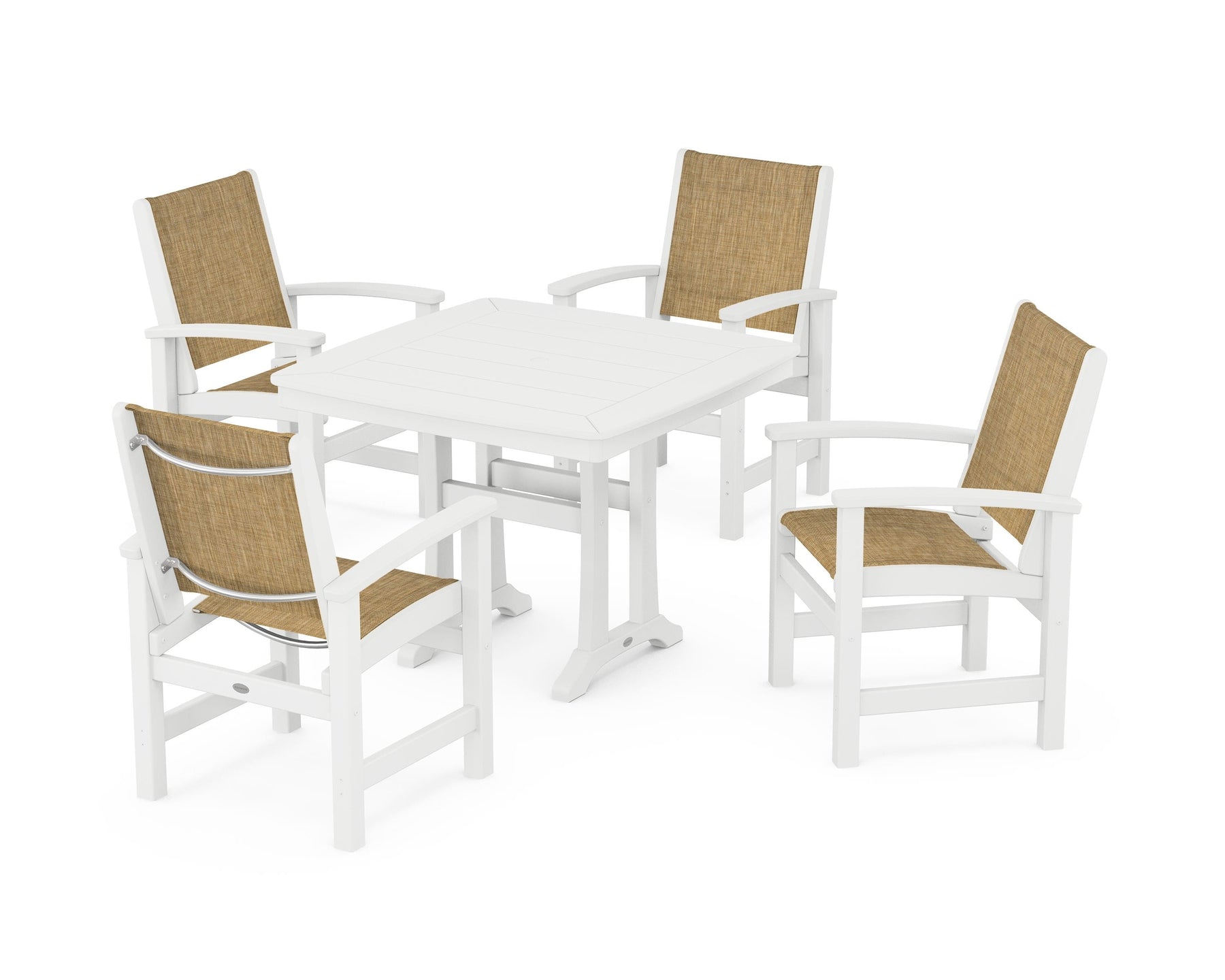 Two words sum up the Coastal Collection: comfortable and carefree. Designed with materials that withstand all the elements, the Coastal 5-Piece Dining Set features durable lumber frames and all-weather sling seats for a resort-inspired look and feel. Centered around a stylish table, this set easily and comfortably accommodates a family of four.