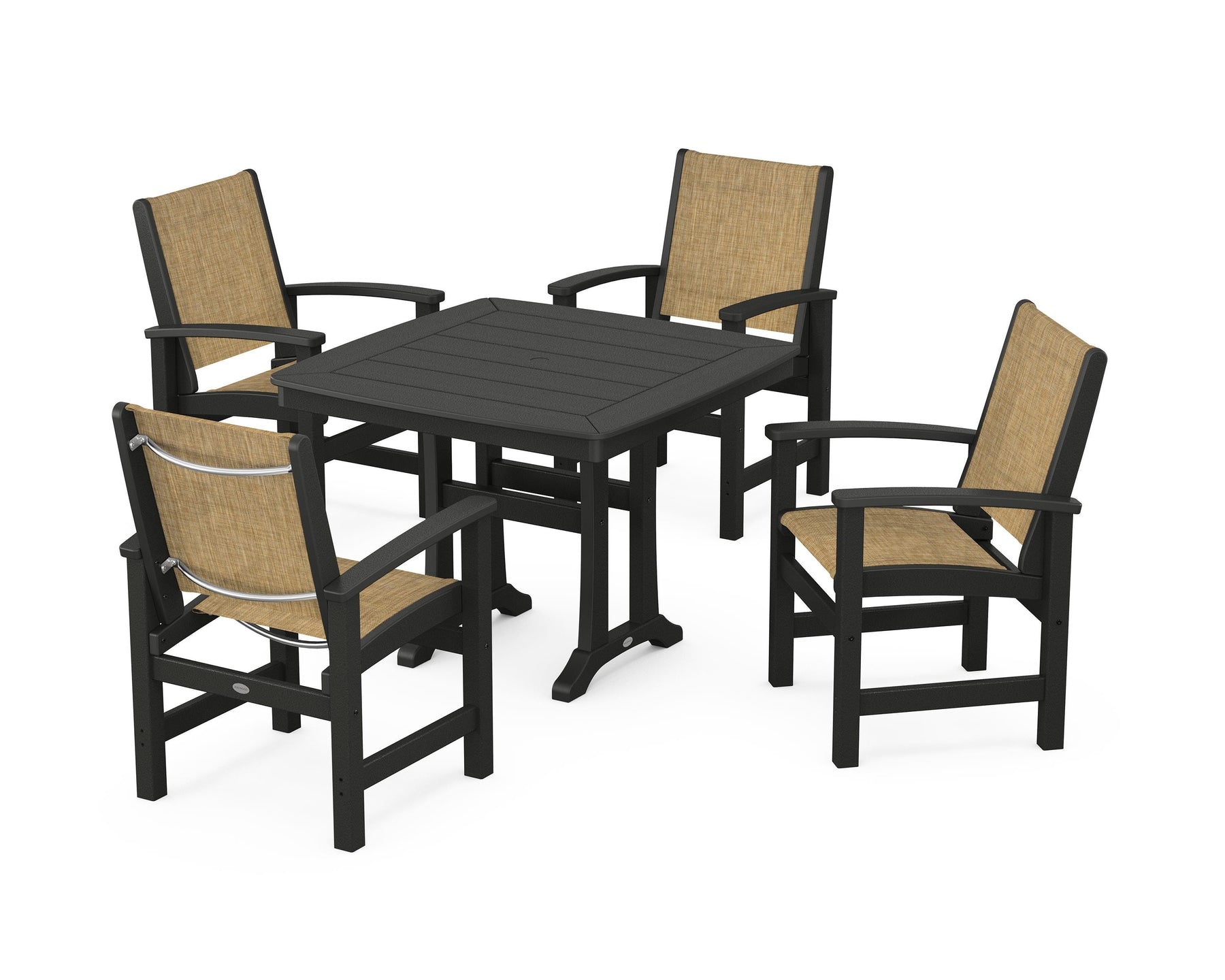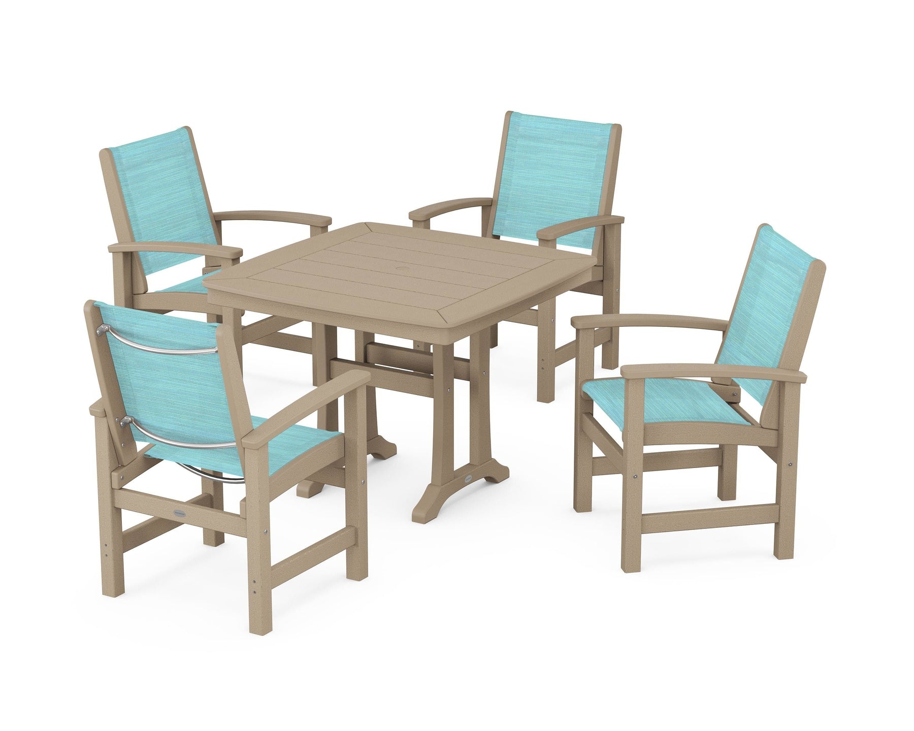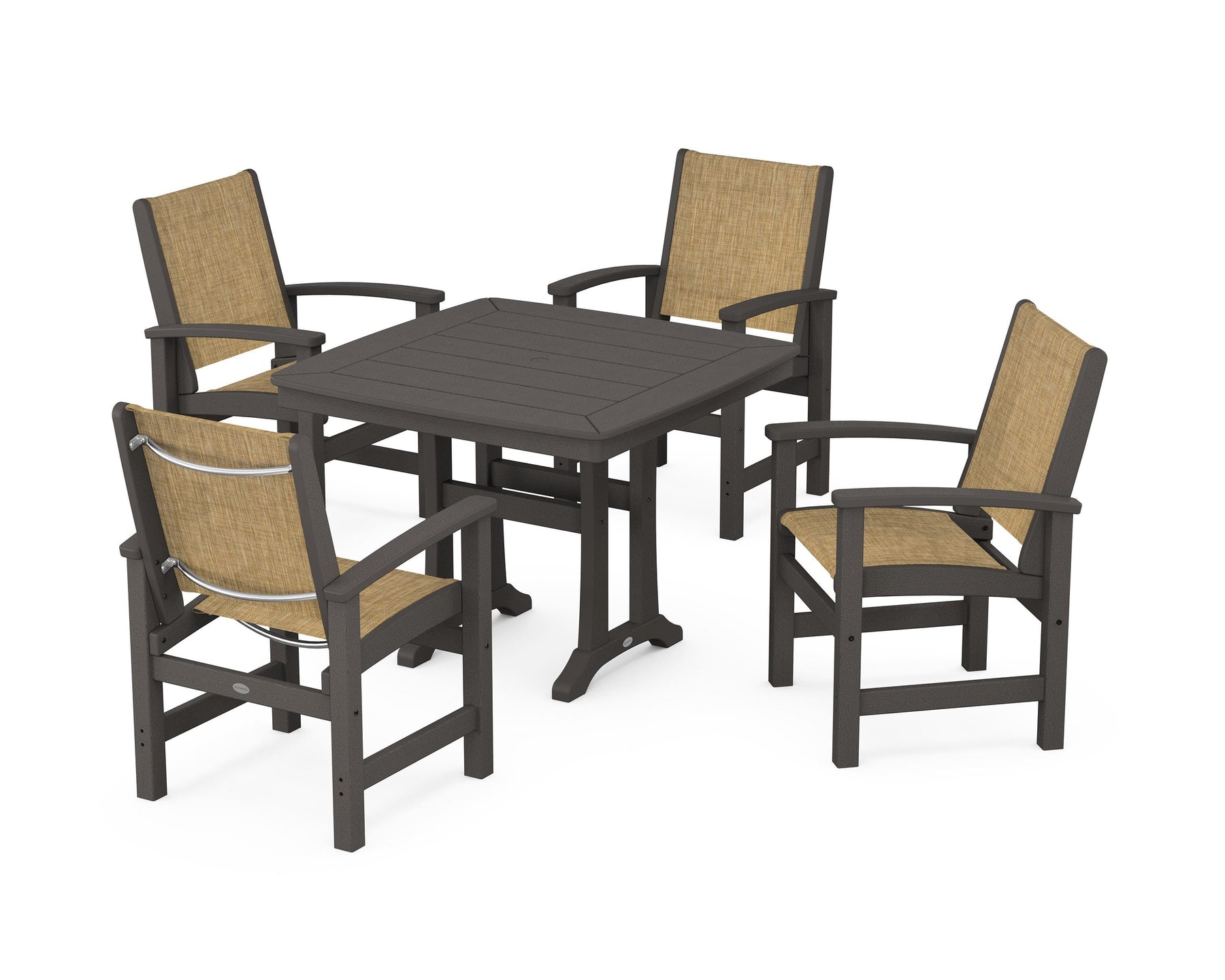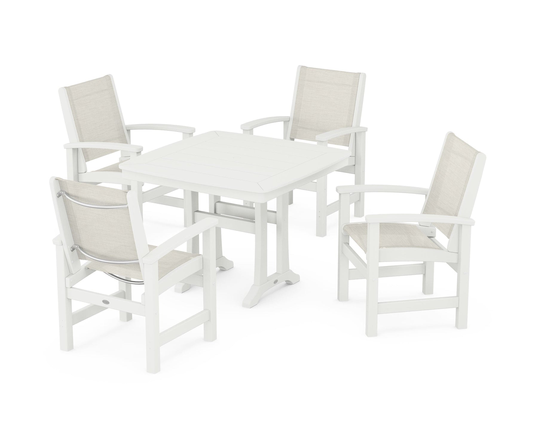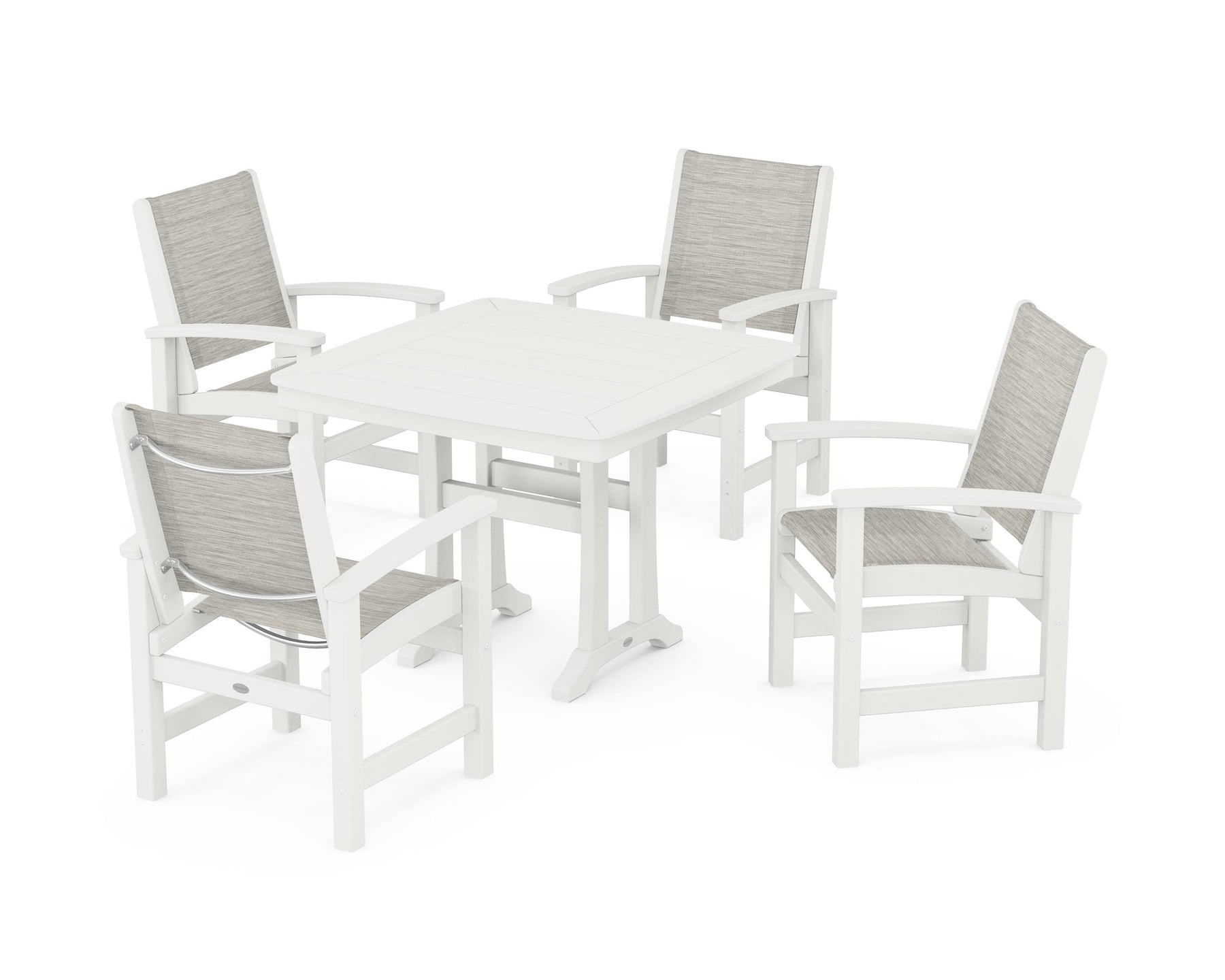 Two words sum up the Coastal Collection: comfortable and carefree. Designed with materials that withstand all the elements, the Coastal 5-Piece Dining Set features durable lumber frames and all-weather sling seats for a resort-inspired look and feel. Centered around a stylish table, this set easily and comfortably accommodates a family of four.