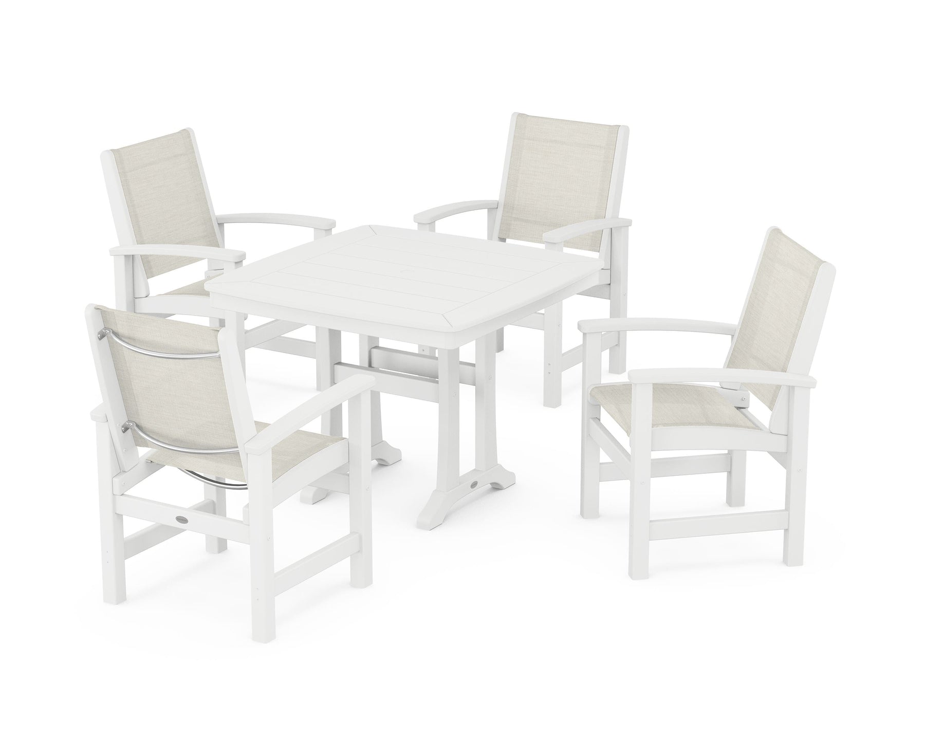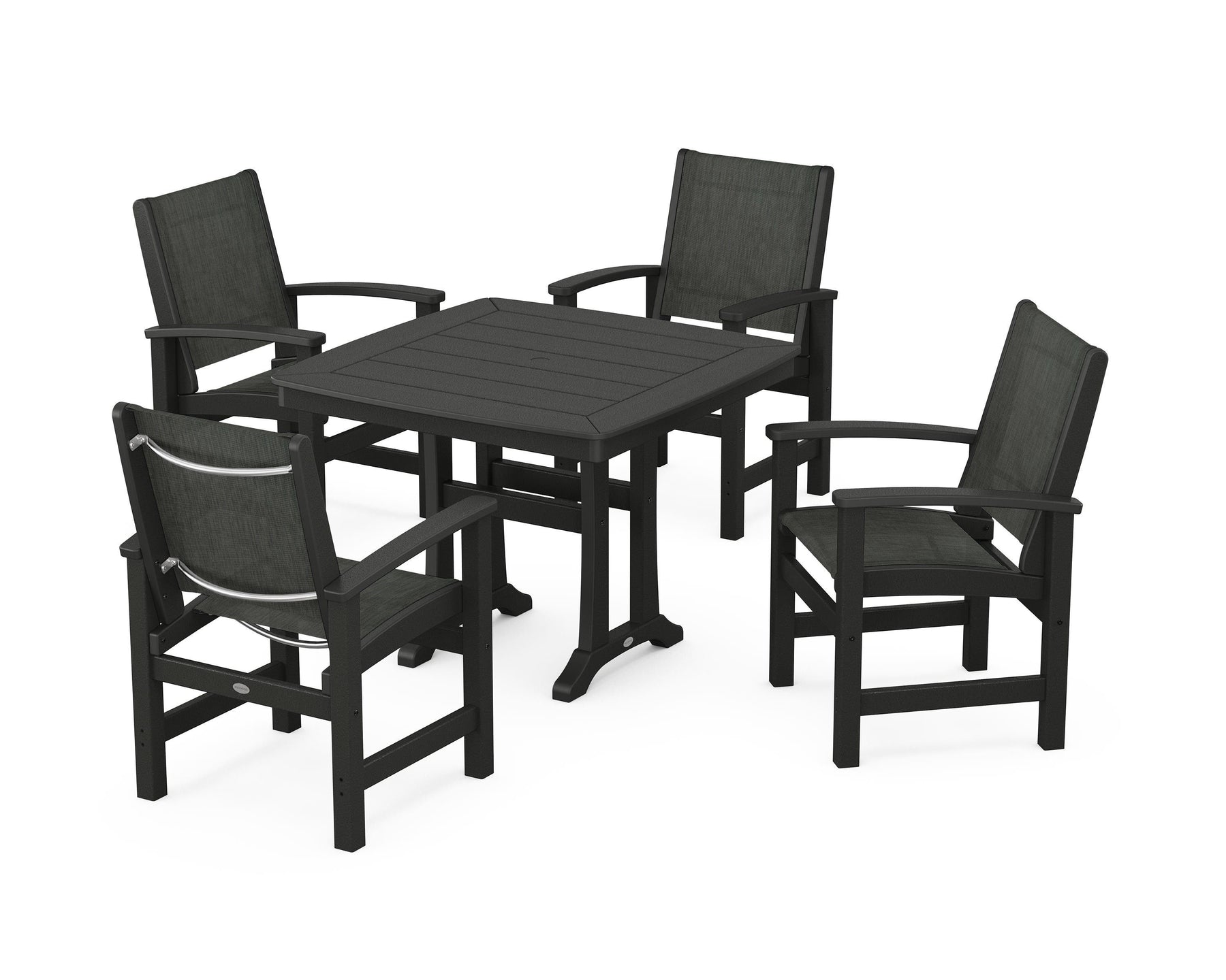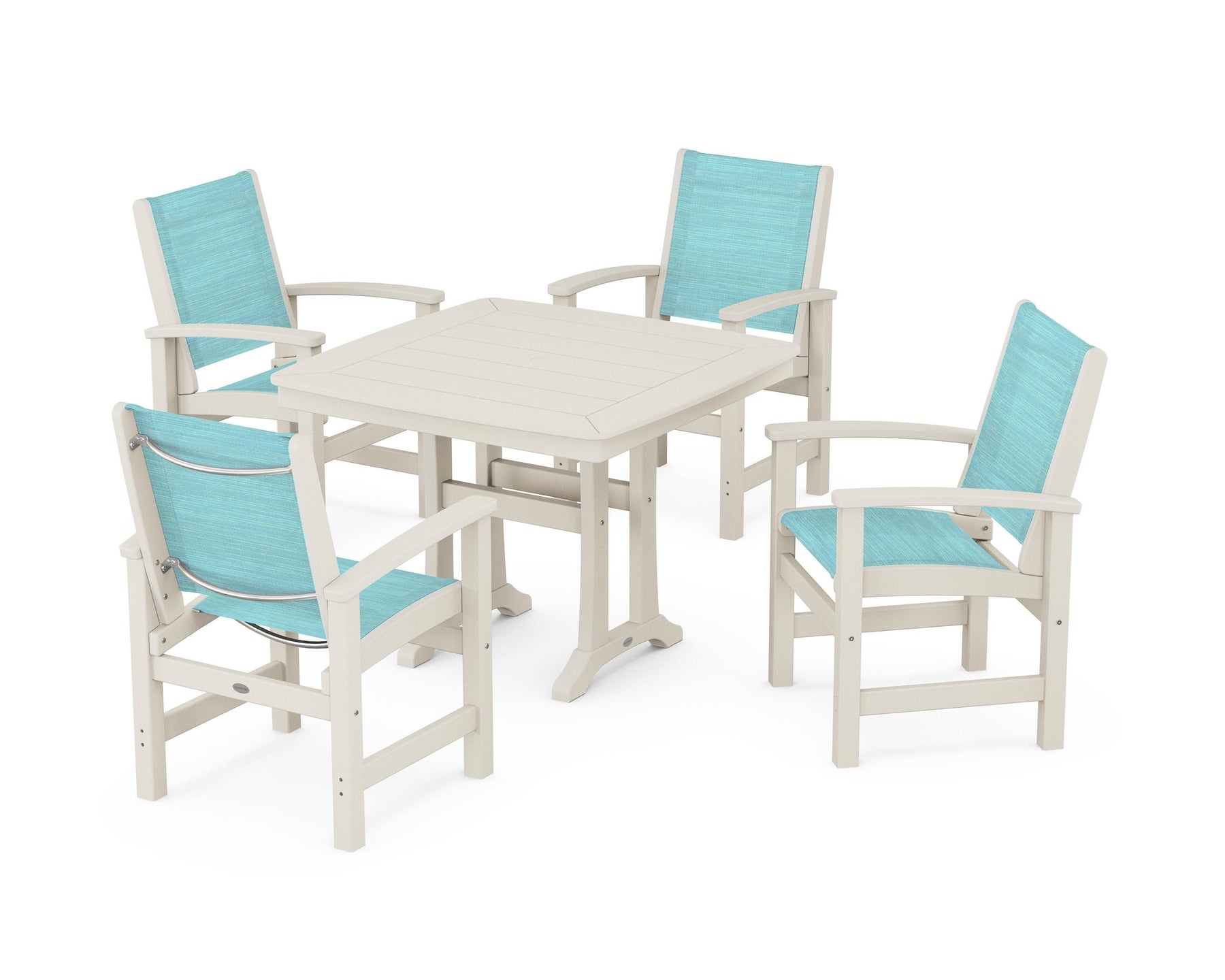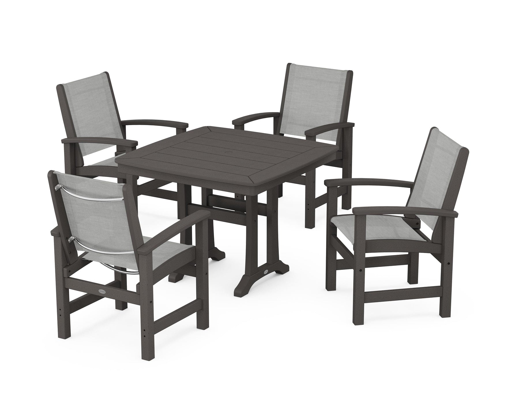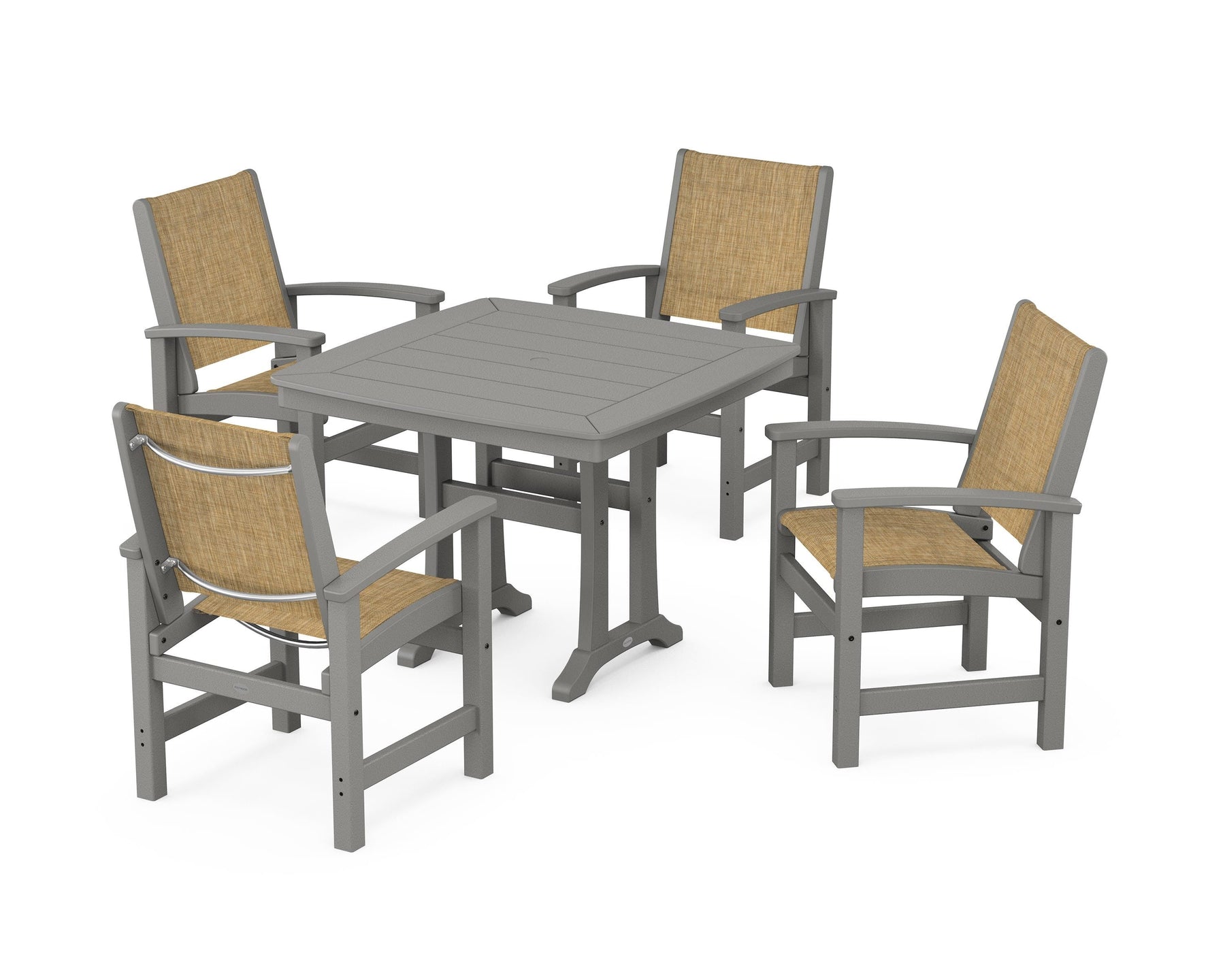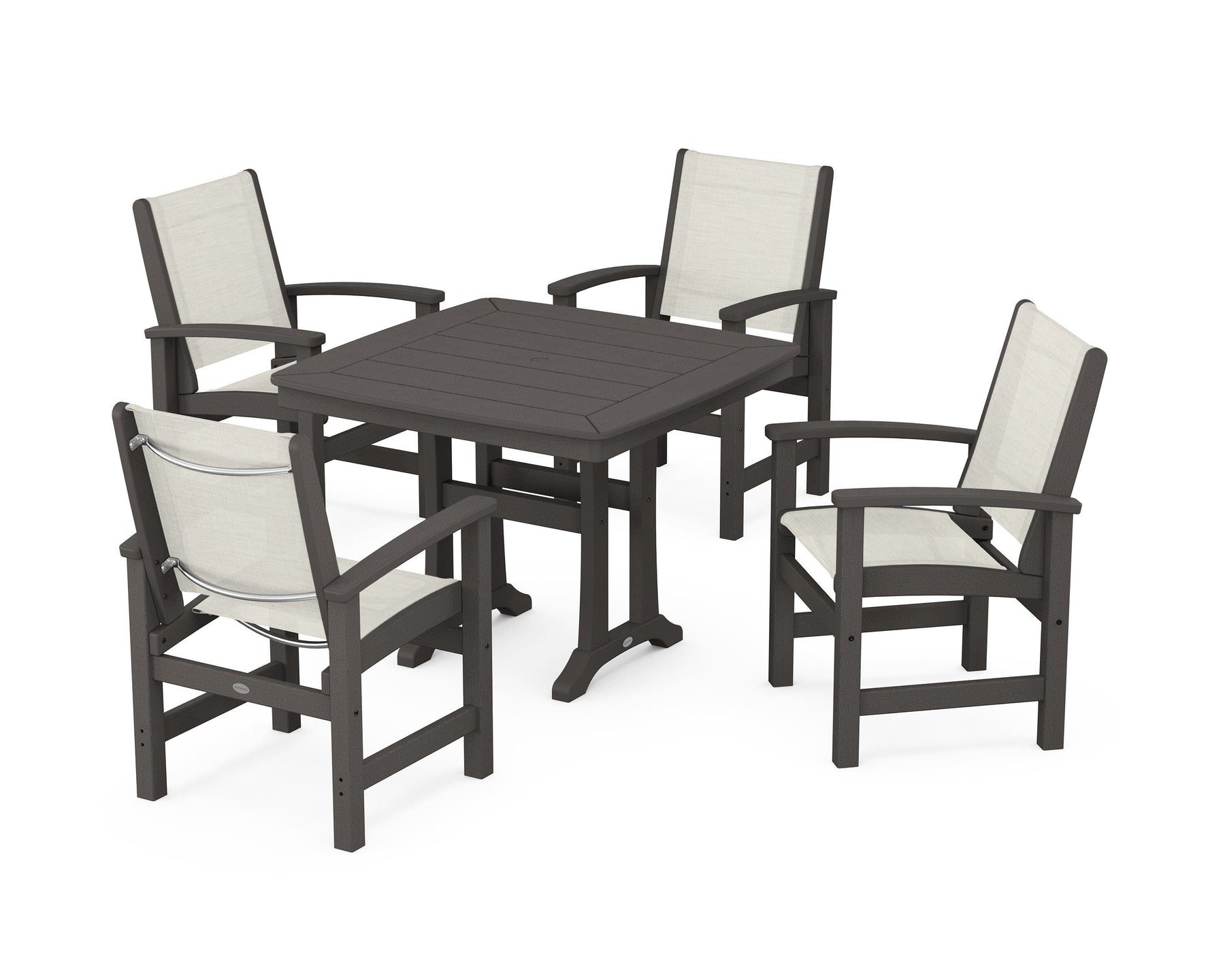 Two words sum up the Coastal Collection: comfortable and carefree. Designed with materials that withstand all the elements, the Coastal 5-Piece Dining Set features durable lumber frames and all-weather sling seats for a resort-inspired look and feel. Centered around a stylish table, this set easily and comfortably accommodates a family of four.