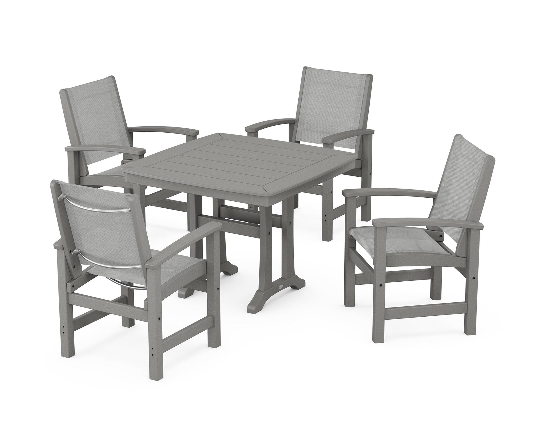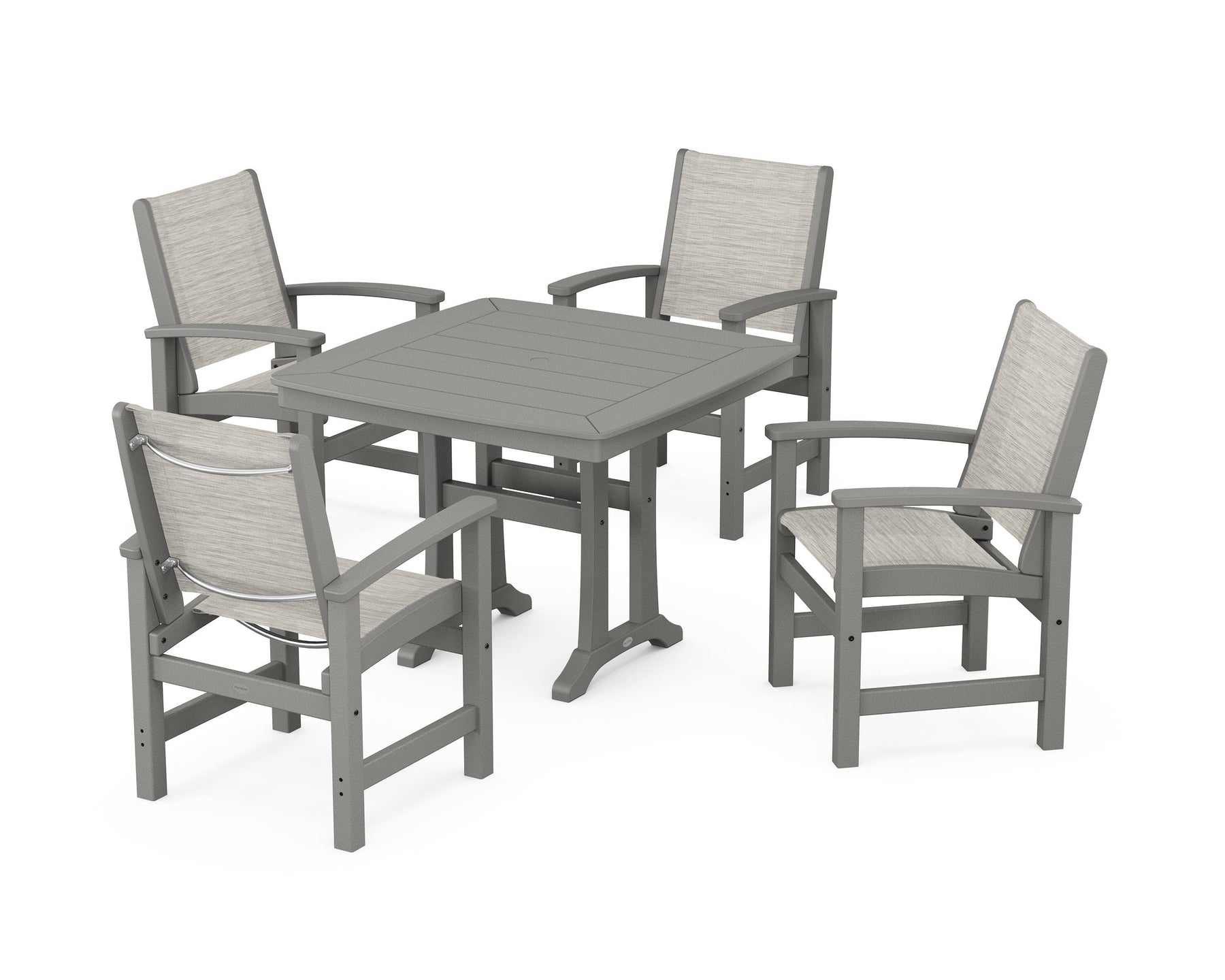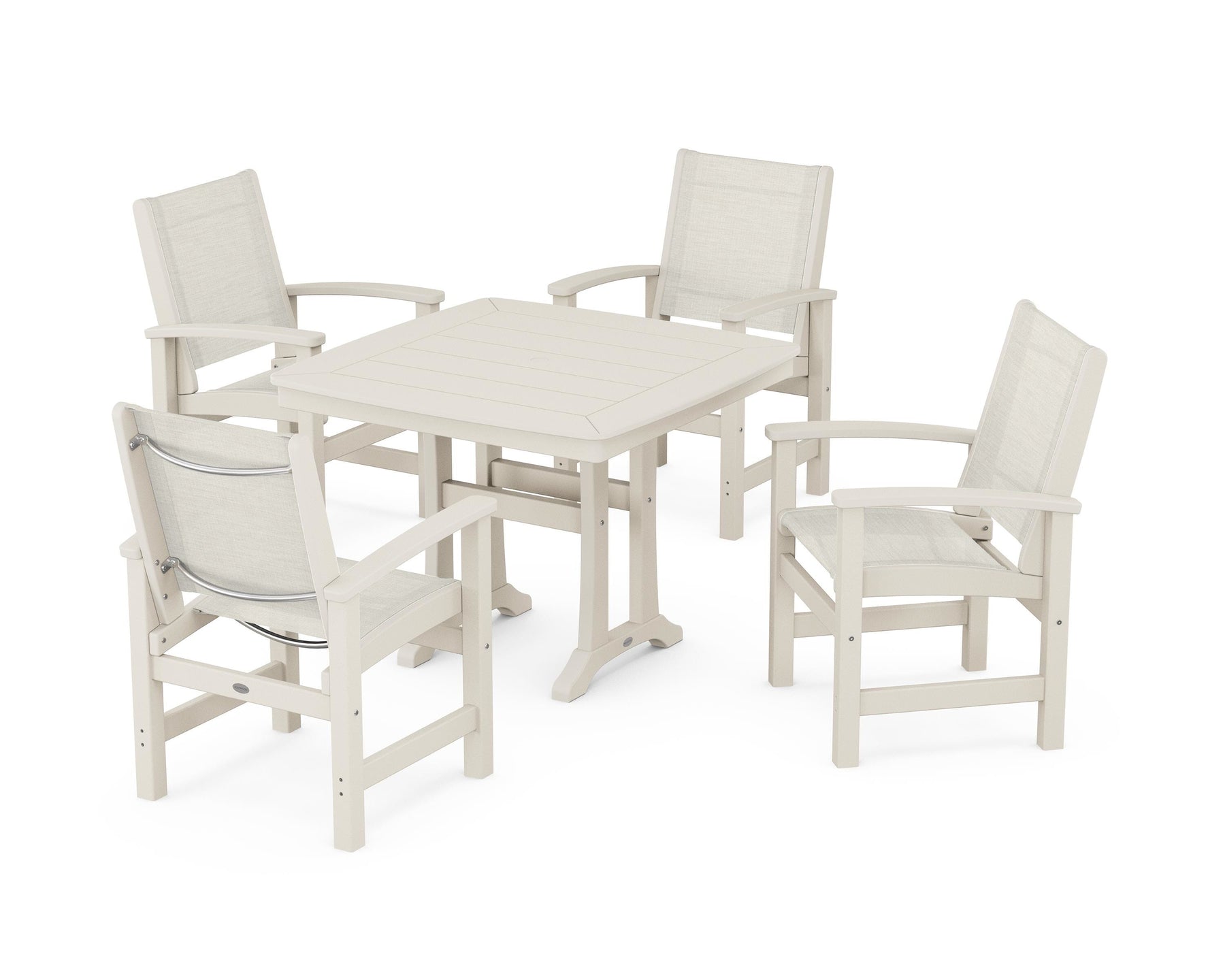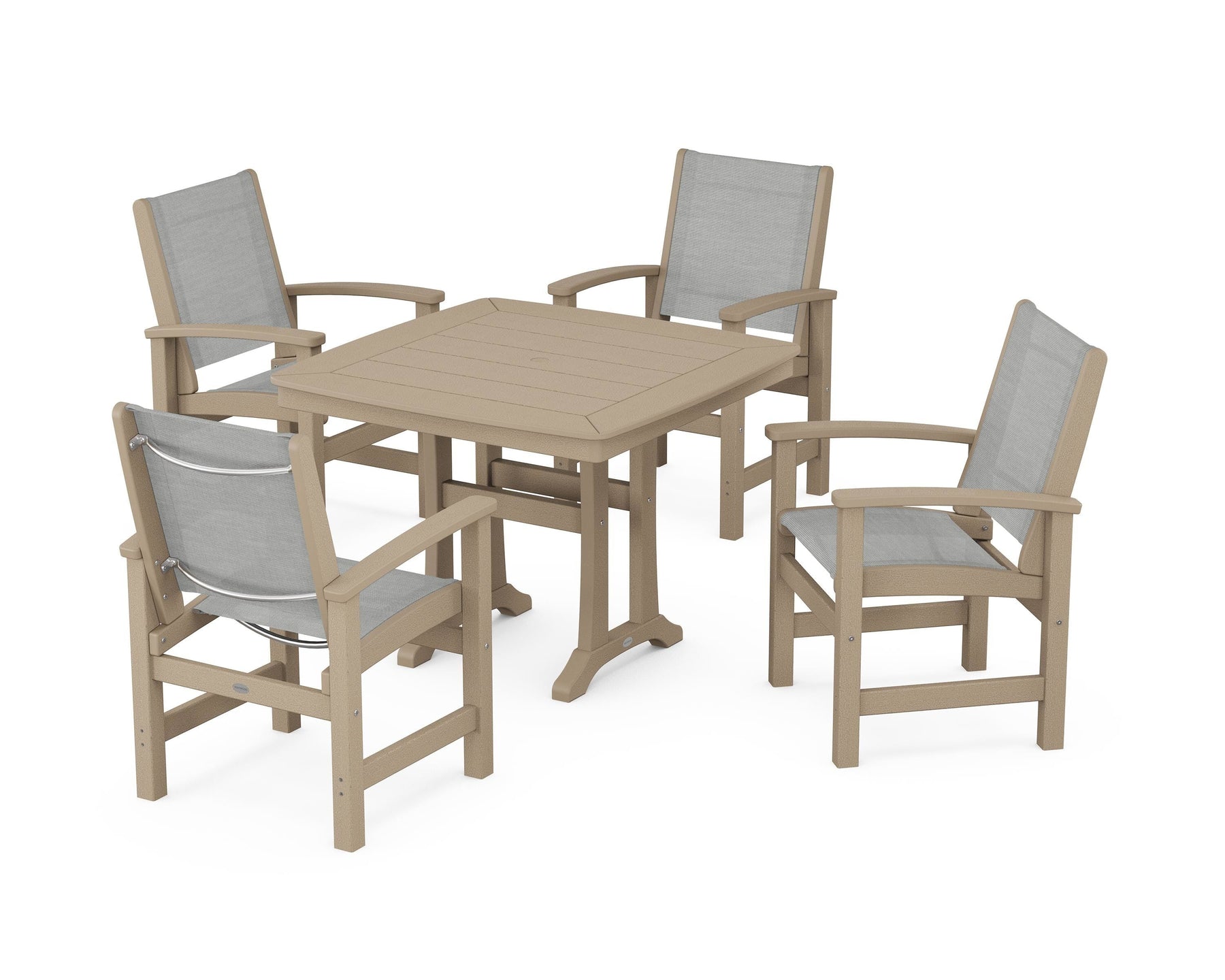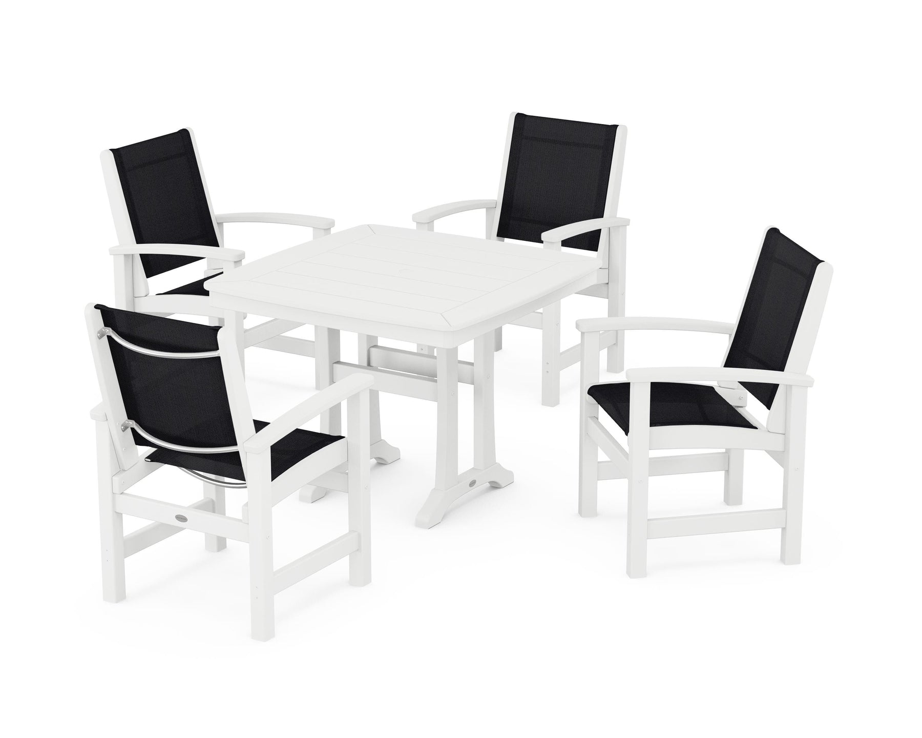 Two words sum up the Coastal Collection: comfortable and carefree. Designed with materials that withstand all the elements, the Coastal 5-Piece Dining Set features durable lumber frames and all-weather sling seats for a resort-inspired look and feel. Centered around a stylish table, this set easily and comfortably accommodates a family of four.