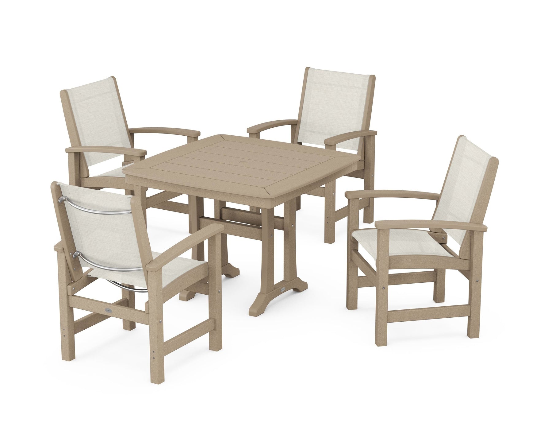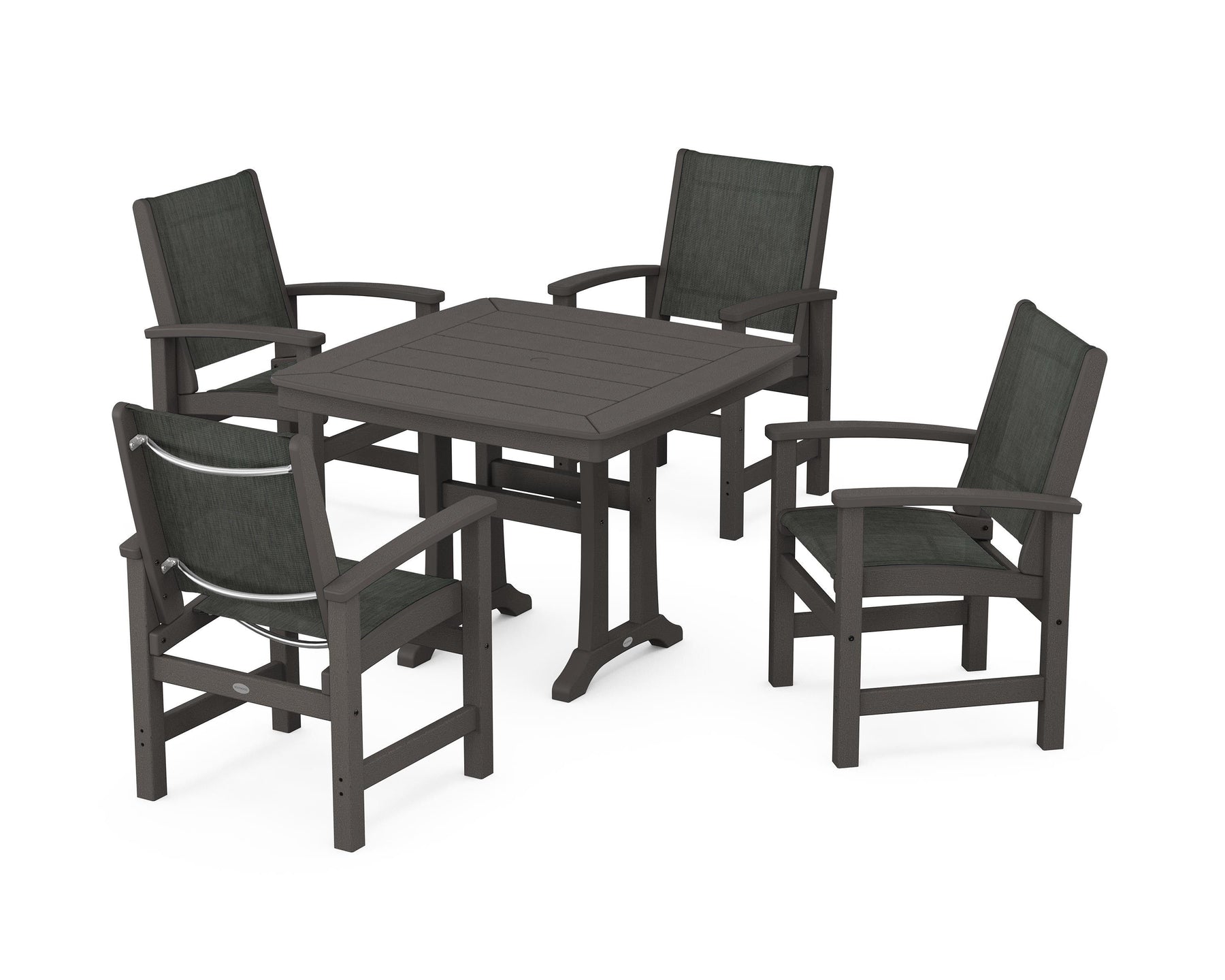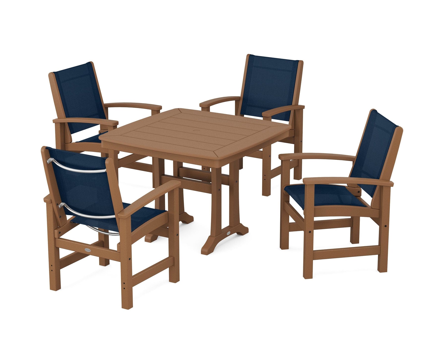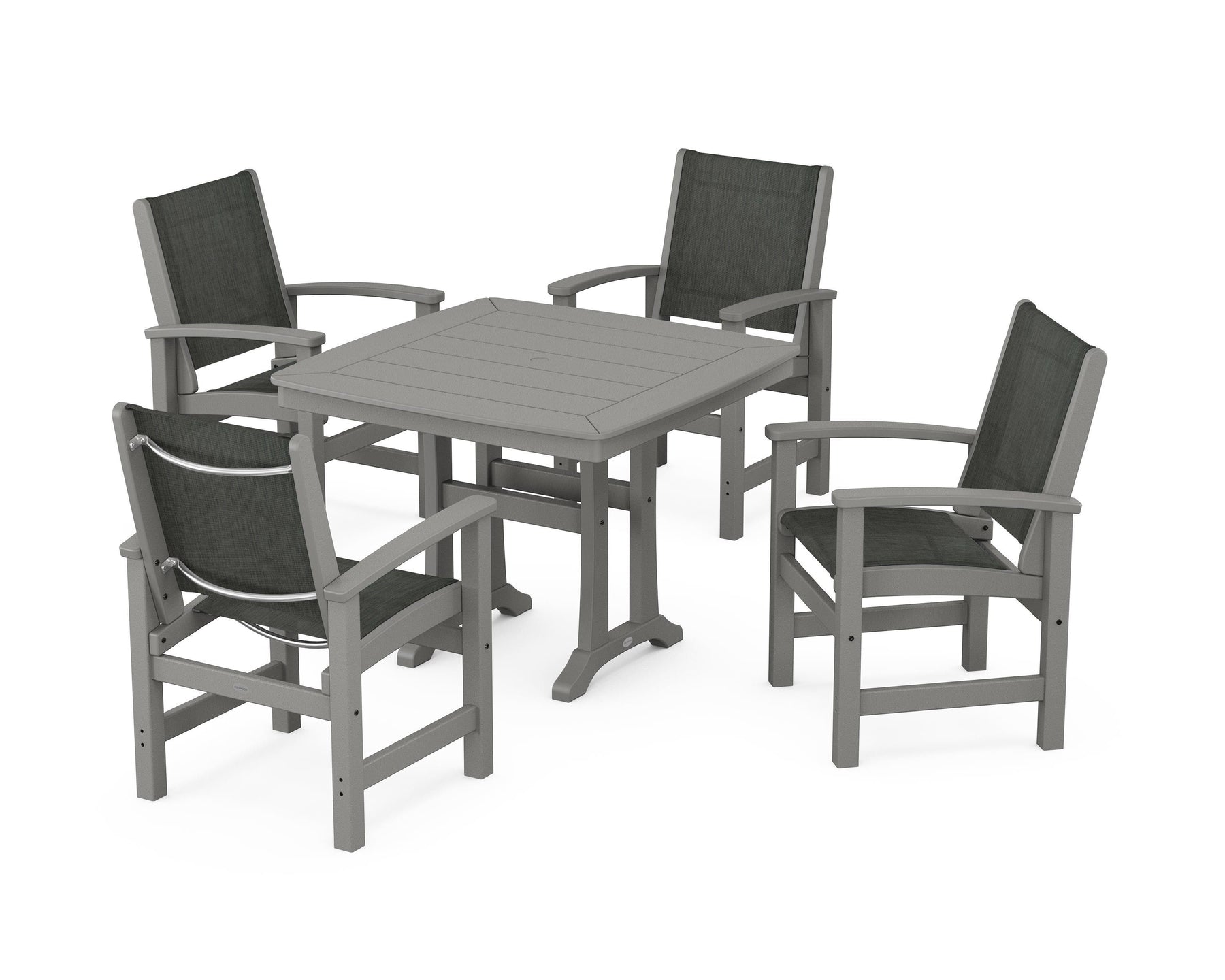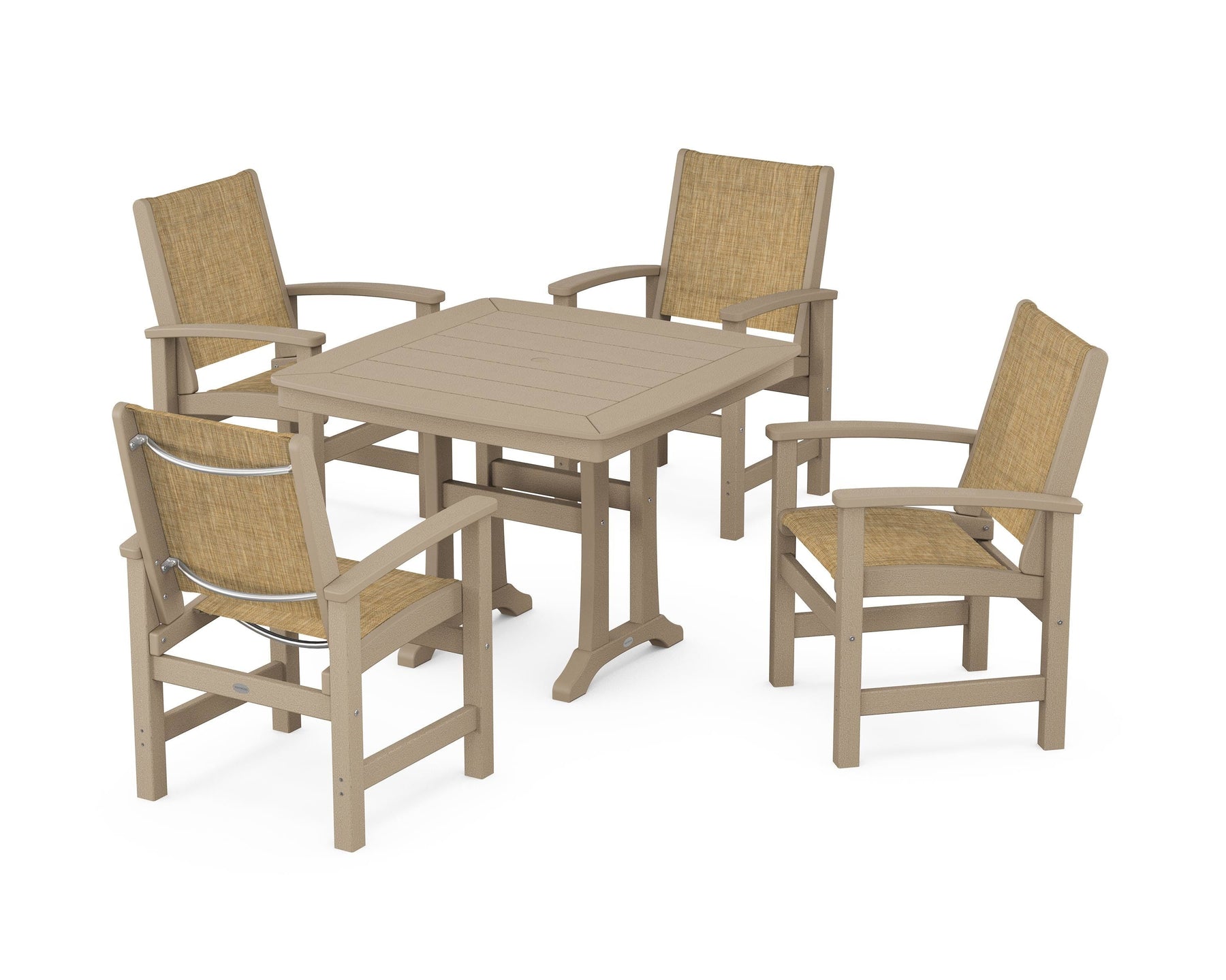 Two words sum up the Coastal Collection: comfortable and carefree. Designed with materials that withstand all the elements, the Coastal 5-Piece Dining Set features durable lumber frames and all-weather sling seats for a resort-inspired look and feel. Centered around a stylish table, this set easily and comfortably accommodates a family of four.