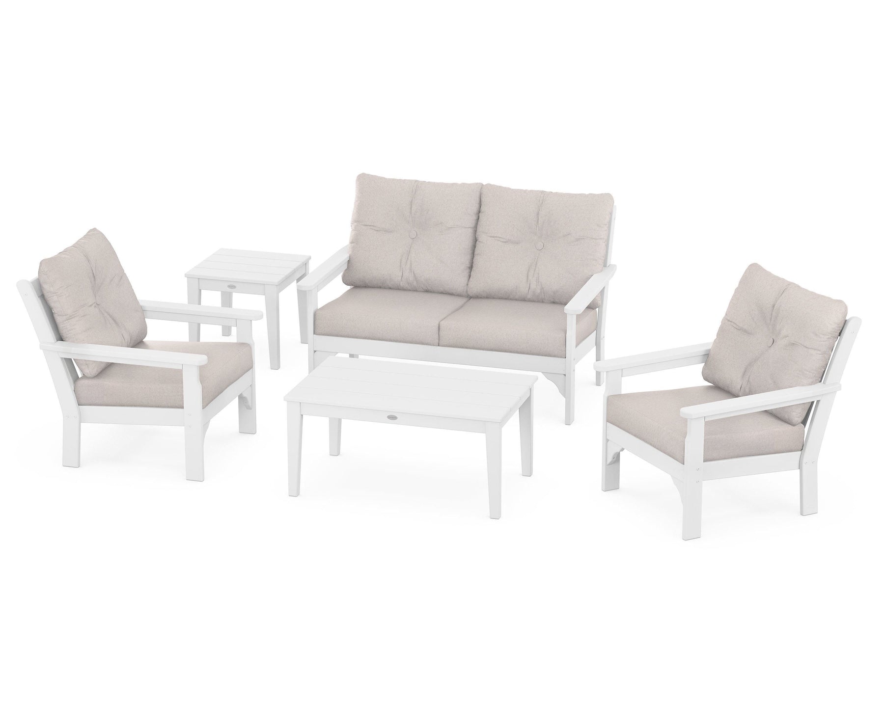 The Vineyard 5-Piece Deep Seating Set seats up to four and will create a cozy living room feel on your porch or patio. Complete with supportive seat cushions and soft buttoned back pillows covered in durable performance fabric, this low-maintenance set also provides space for snacks and drinks on the roomy end table and coffee table. The POLYWOOD® Vineyard Collection captures a charming, traditional design that can be dressed up or down to fit with a variety of outdoor styles.