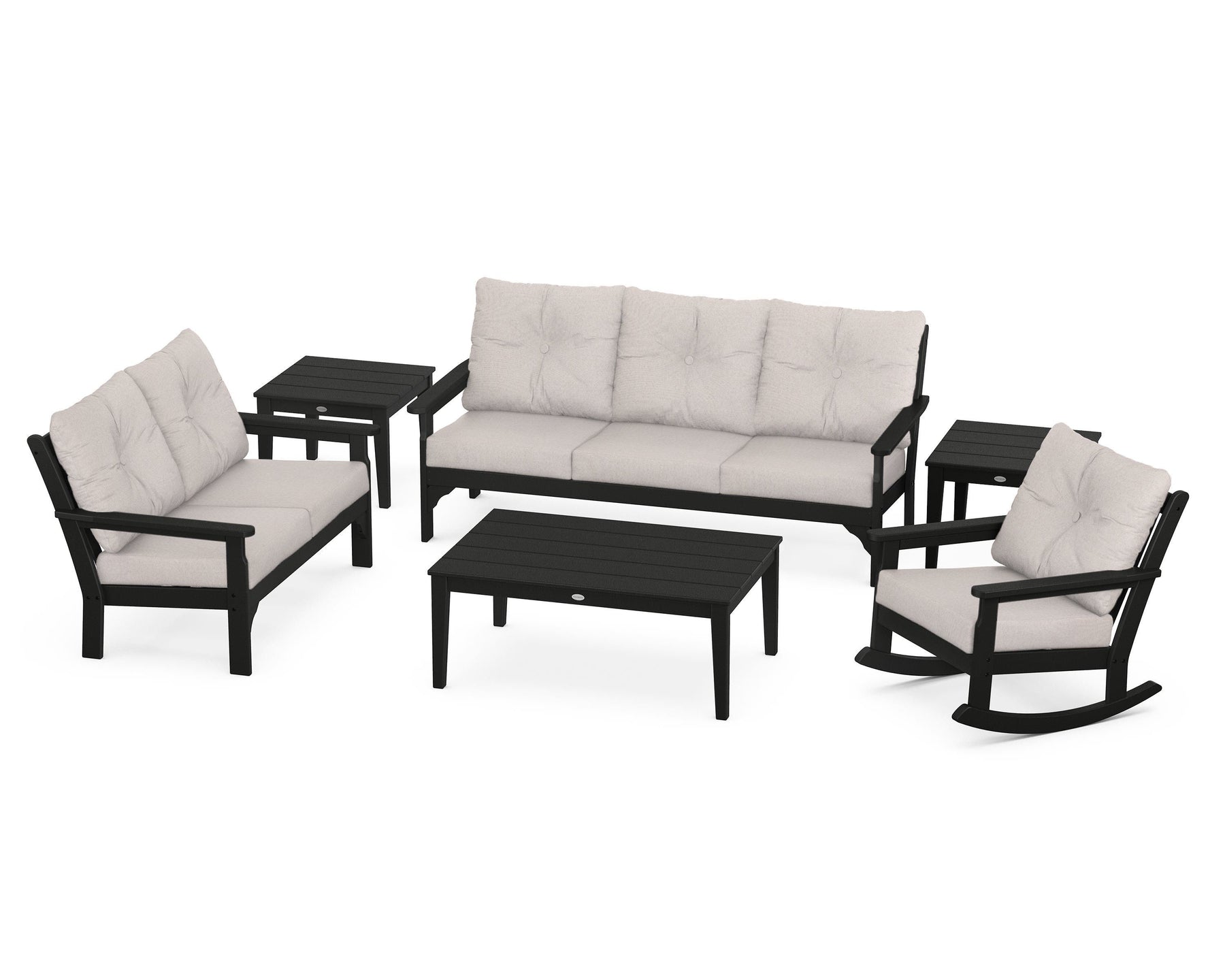 • Includes (1) Vineyard Deep Seating Rocking Chair, (1) Vineyard Deep Seating Loveseat, (1) Vineyard Deep Seating Sofa, (1) Newport 28" x 42" Coffee Table, and (2) Newport 22" End Tables