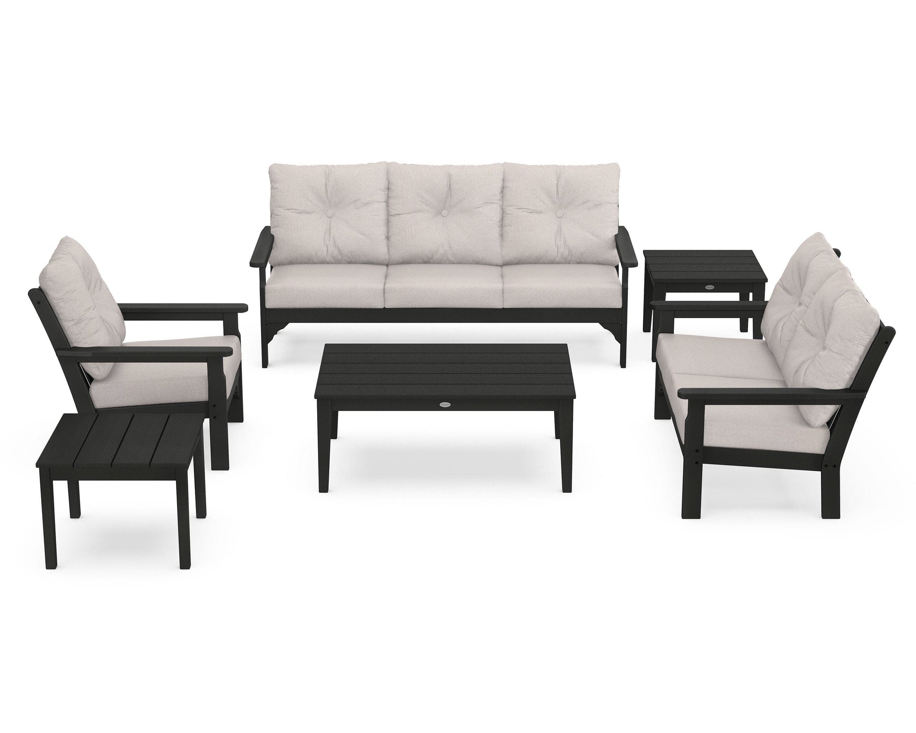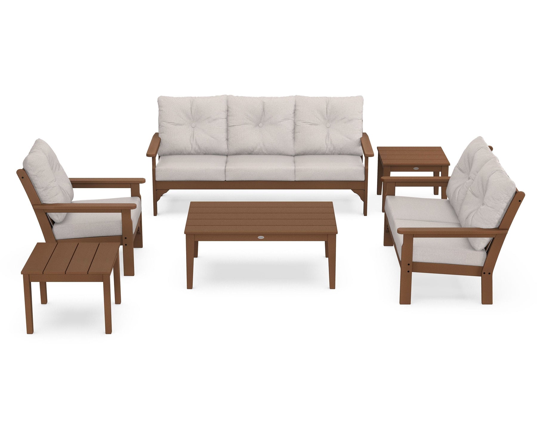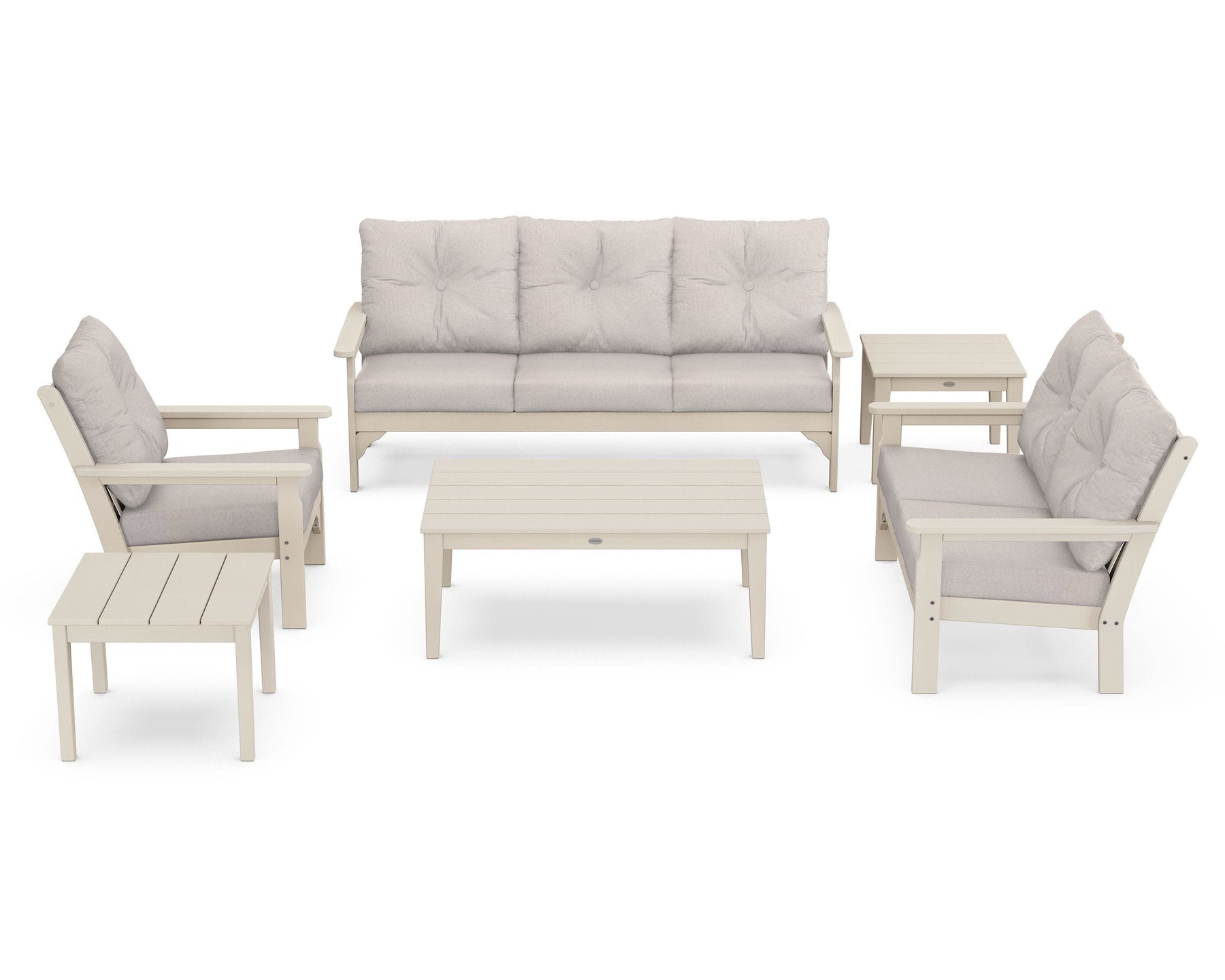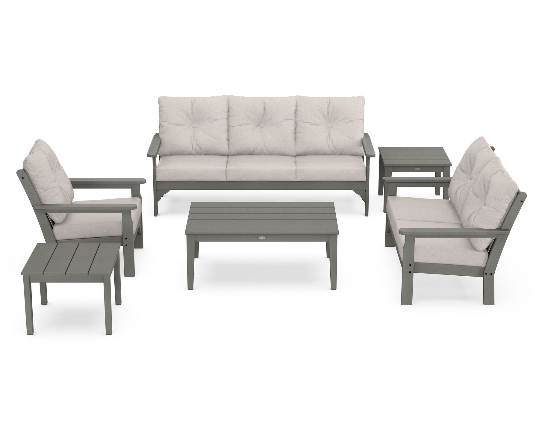 The Vineyard 6-Piece Deep Seating Set seats up to six and will create a cozy living room feel on your patio or porch with supportive seat cushions and soft buttoned back pillows. With coordinating end tables and coffee table you’ll have plenty of space to rest a few snacks and drinks. The POLYWOOD® Vineyard Collection captures a charming, traditional design that can be dressed up or down to fit with a variety of outdoor styles.