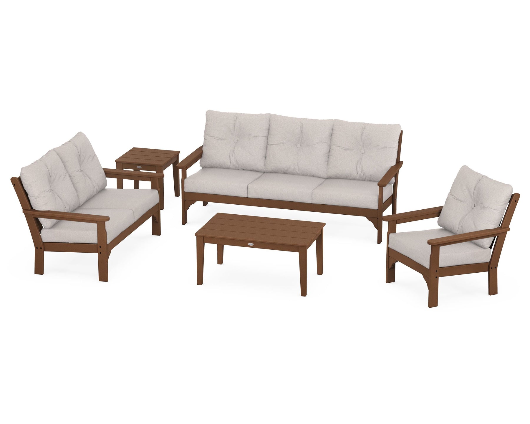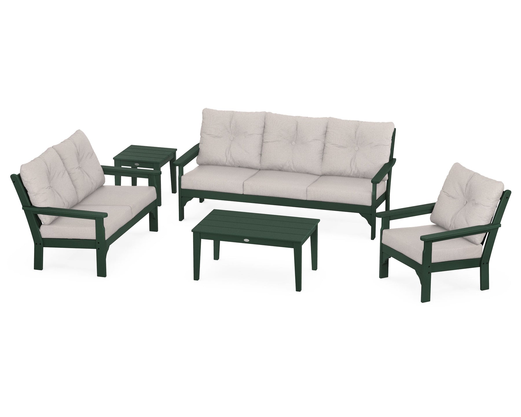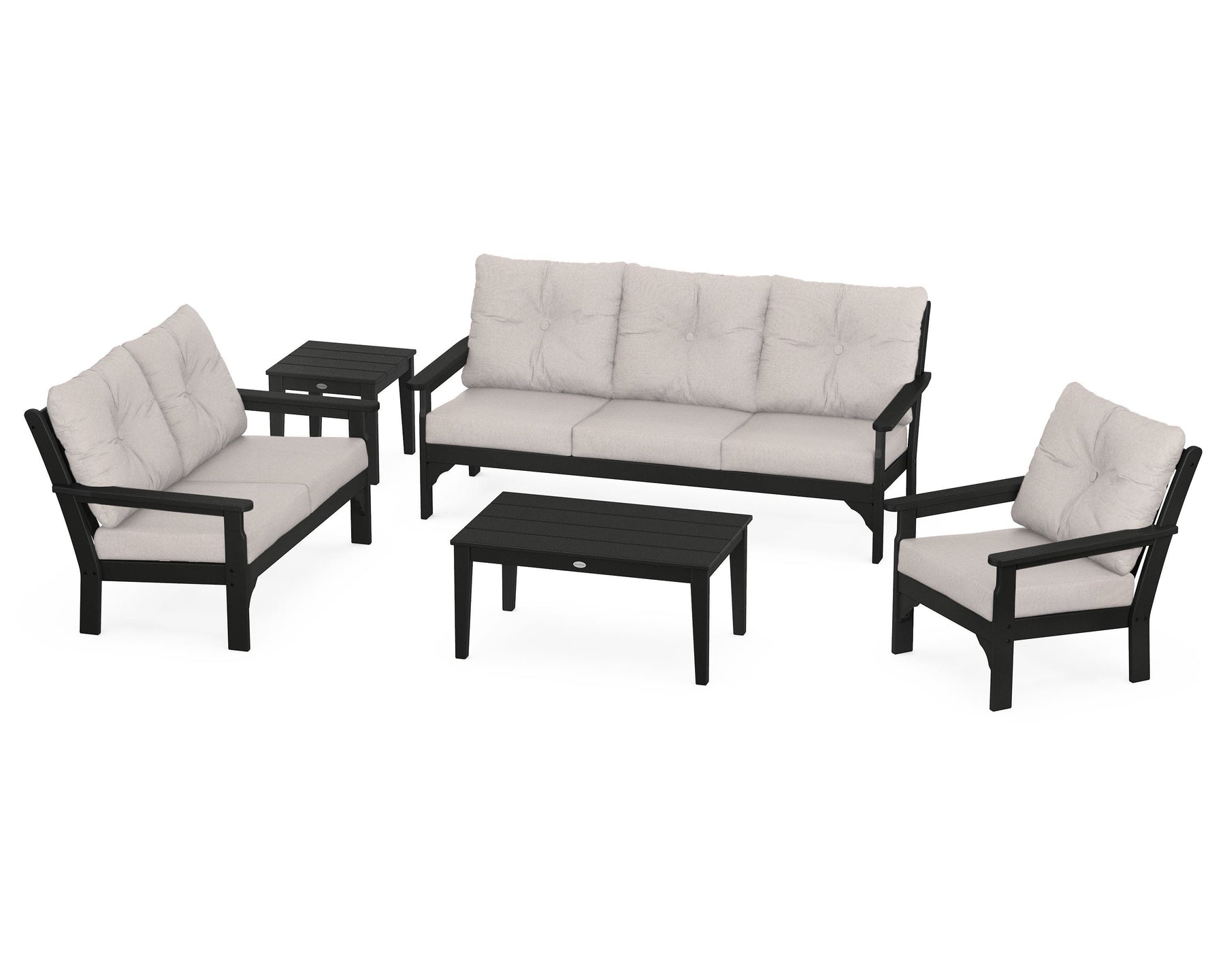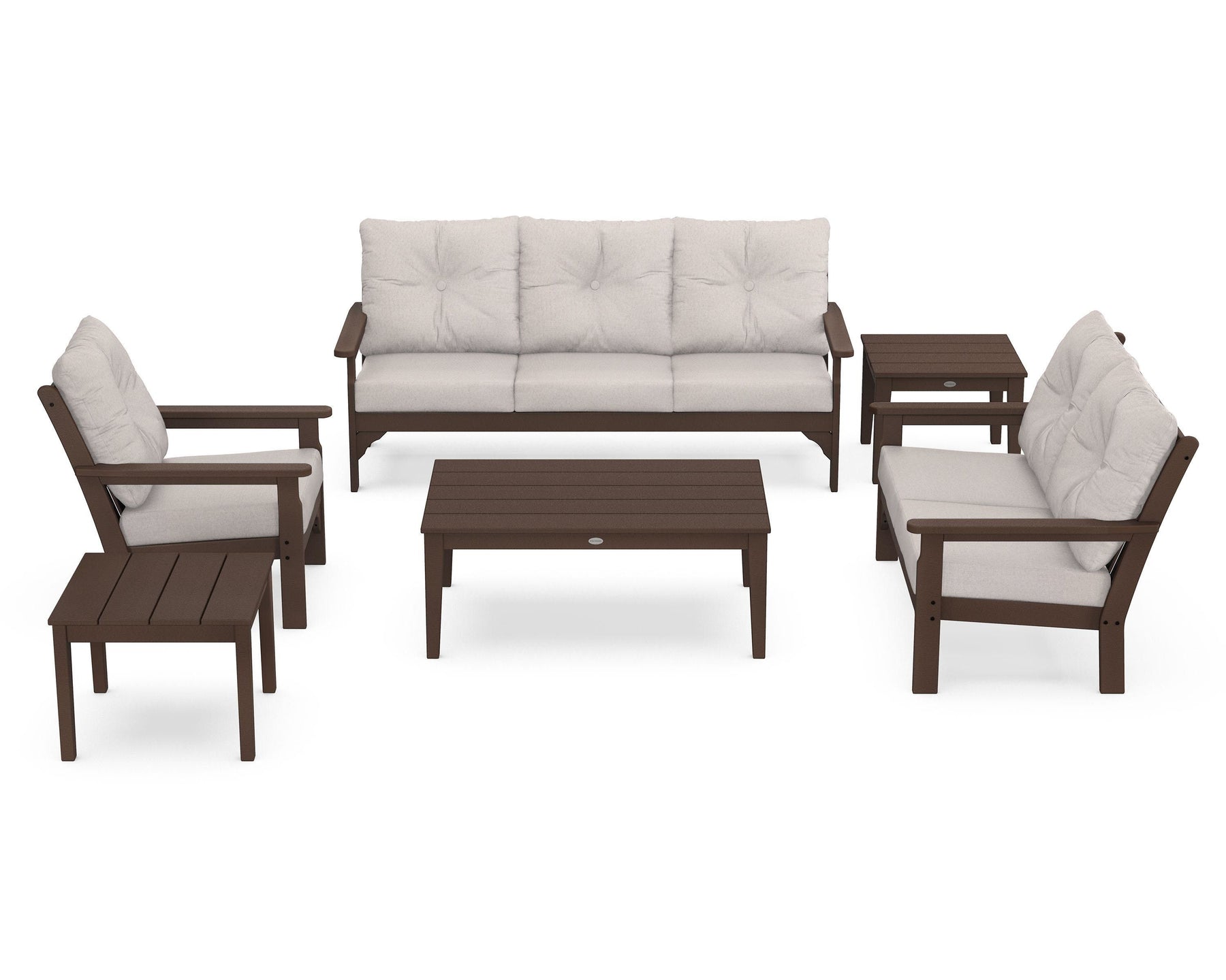 The Vineyard 6-Piece Deep Seating Set seats up to six and will create a cozy living room feel on your patio or porch with supportive seat cushions and soft buttoned back pillows. With coordinating end tables and coffee table you’ll have plenty of space to rest a few snacks and drinks. The POLYWOOD® Vineyard Collection captures a charming, traditional design that can be dressed up or down to fit with a variety of outdoor styles.