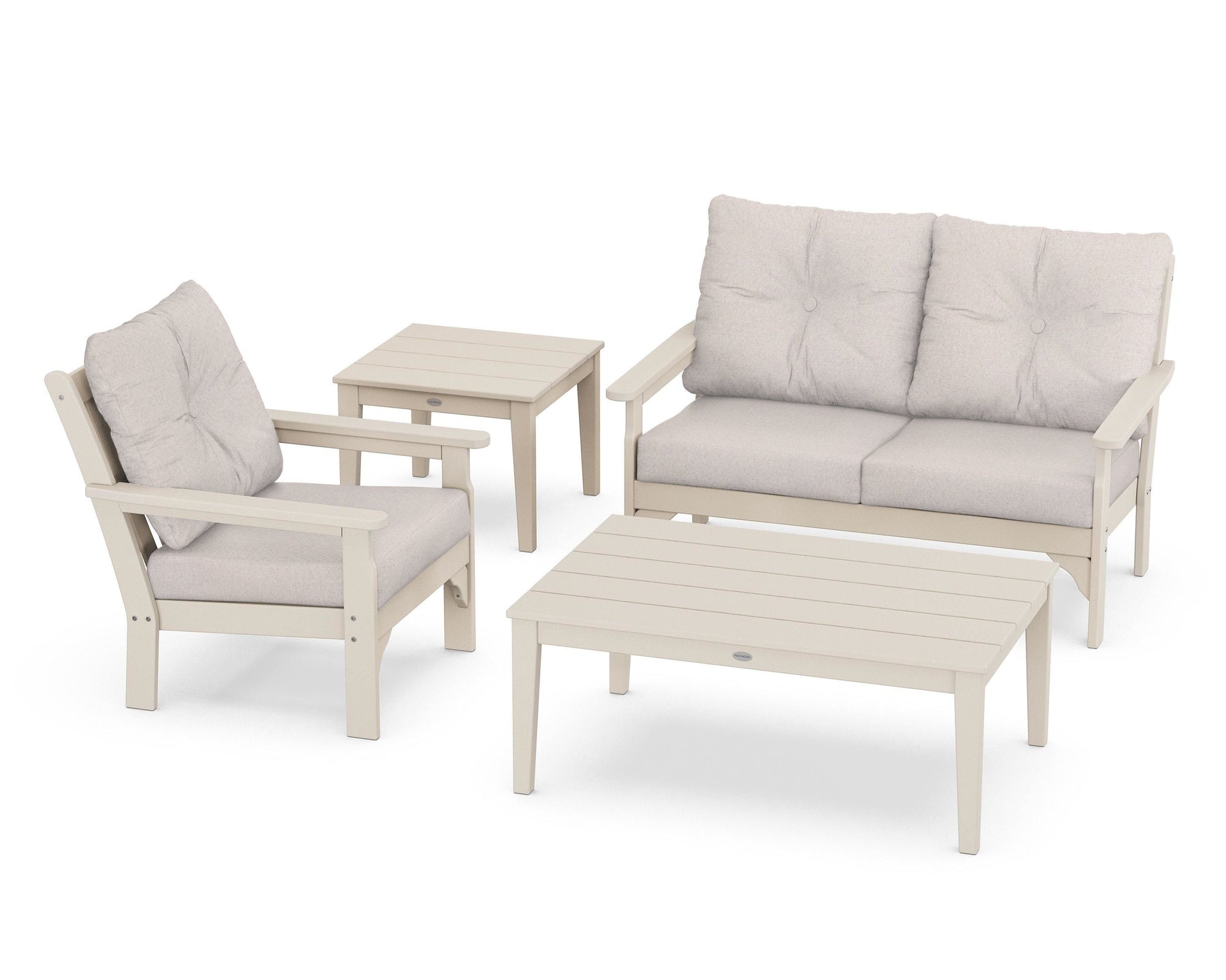 Bring extra comfort and relaxation to your outdoor space with the Vineyard 4-Piece Deep Seating Set. This attractive set seats up to four, and can be the perfect spot to host your next game night or enjoy your morning cup of coffee. The seat and back cushions are covered in soft, durable all-weather performance fabric and the table and seating frames are made from genuine POLYWOOD lumber, making this entire set easy to maintain and resistant to weather and other harsh environmental factors.