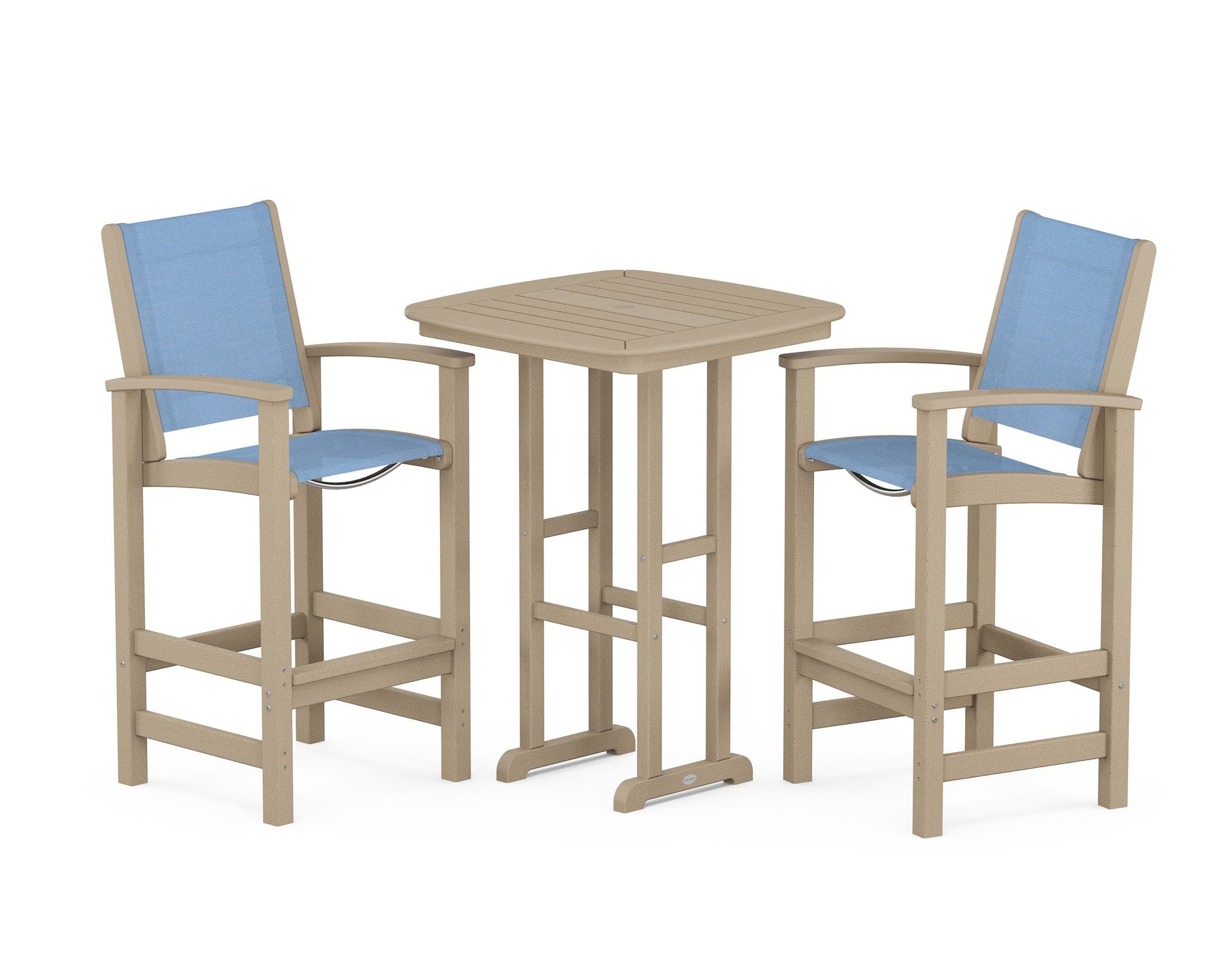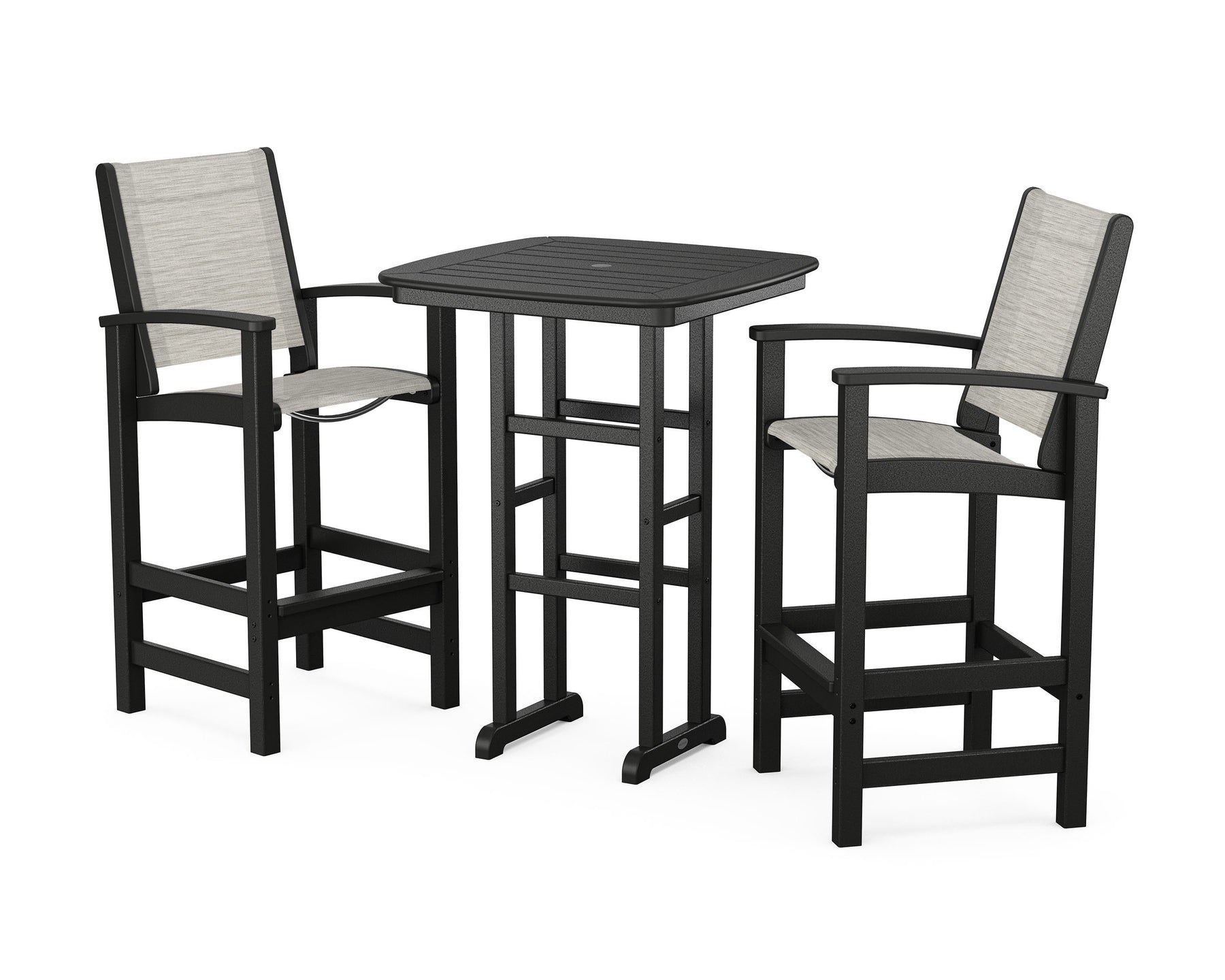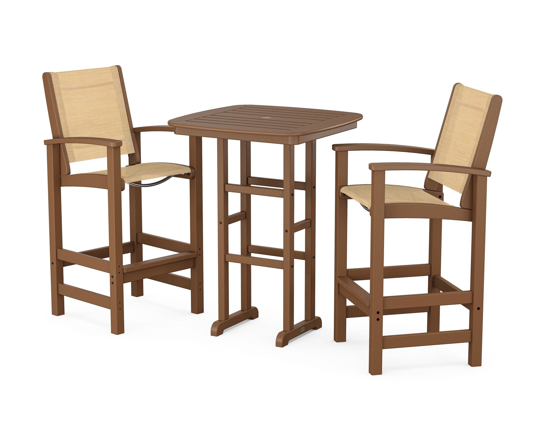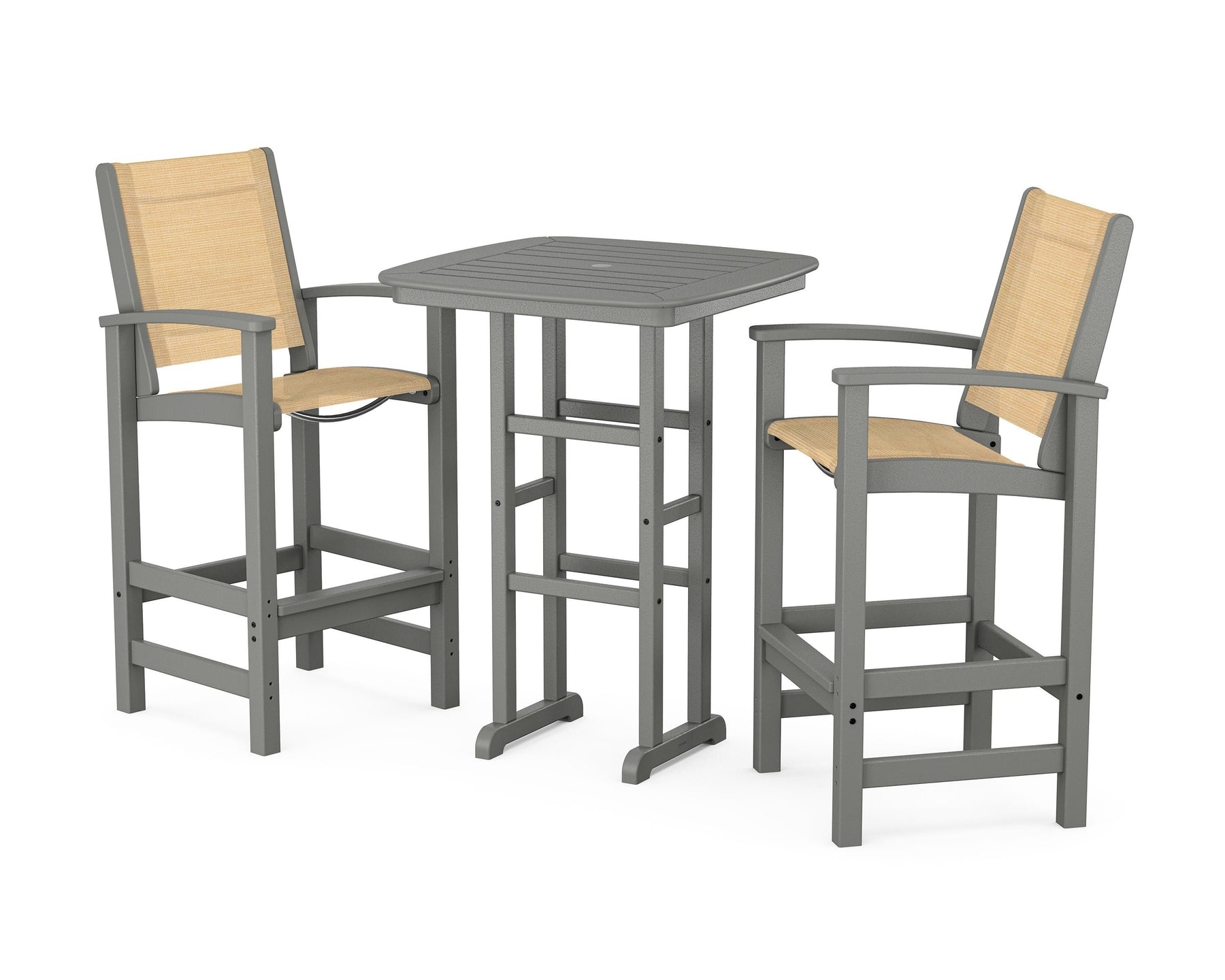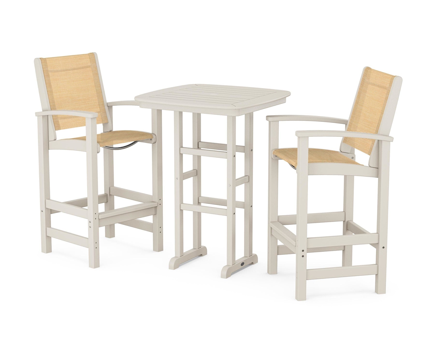 Two words can sum up the Coastal Collection: comfortable and carefree. Designed with materials that withstand all the elements, the Coastal 3-Piece Bar Set features durable lumber frames and all-weather sling seats for resort-inspired style. Centered around a bar-height table, this set comfortably accommodates two.