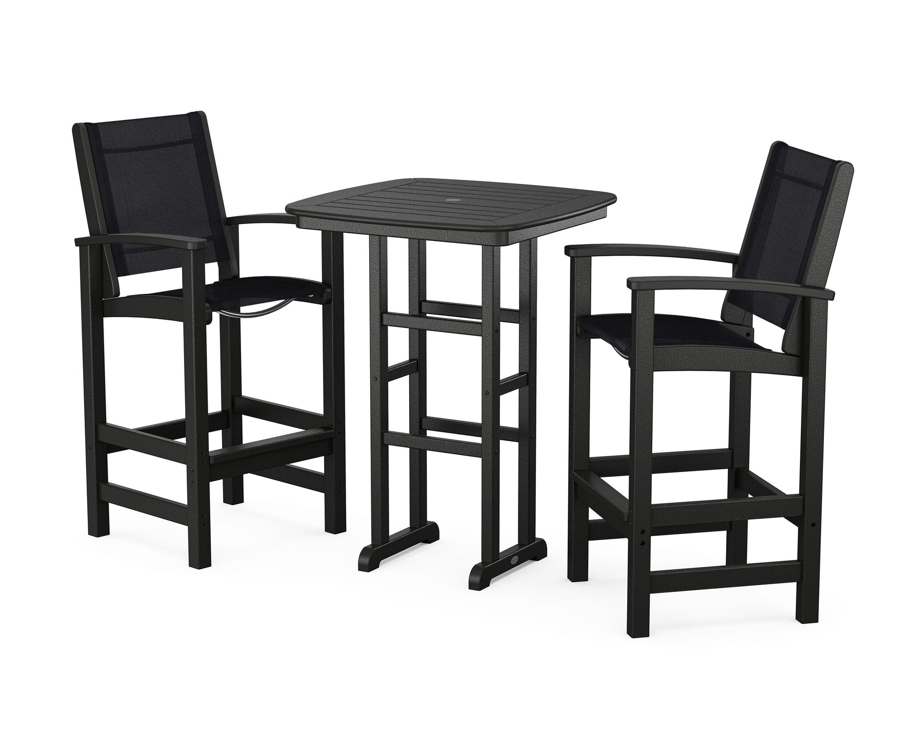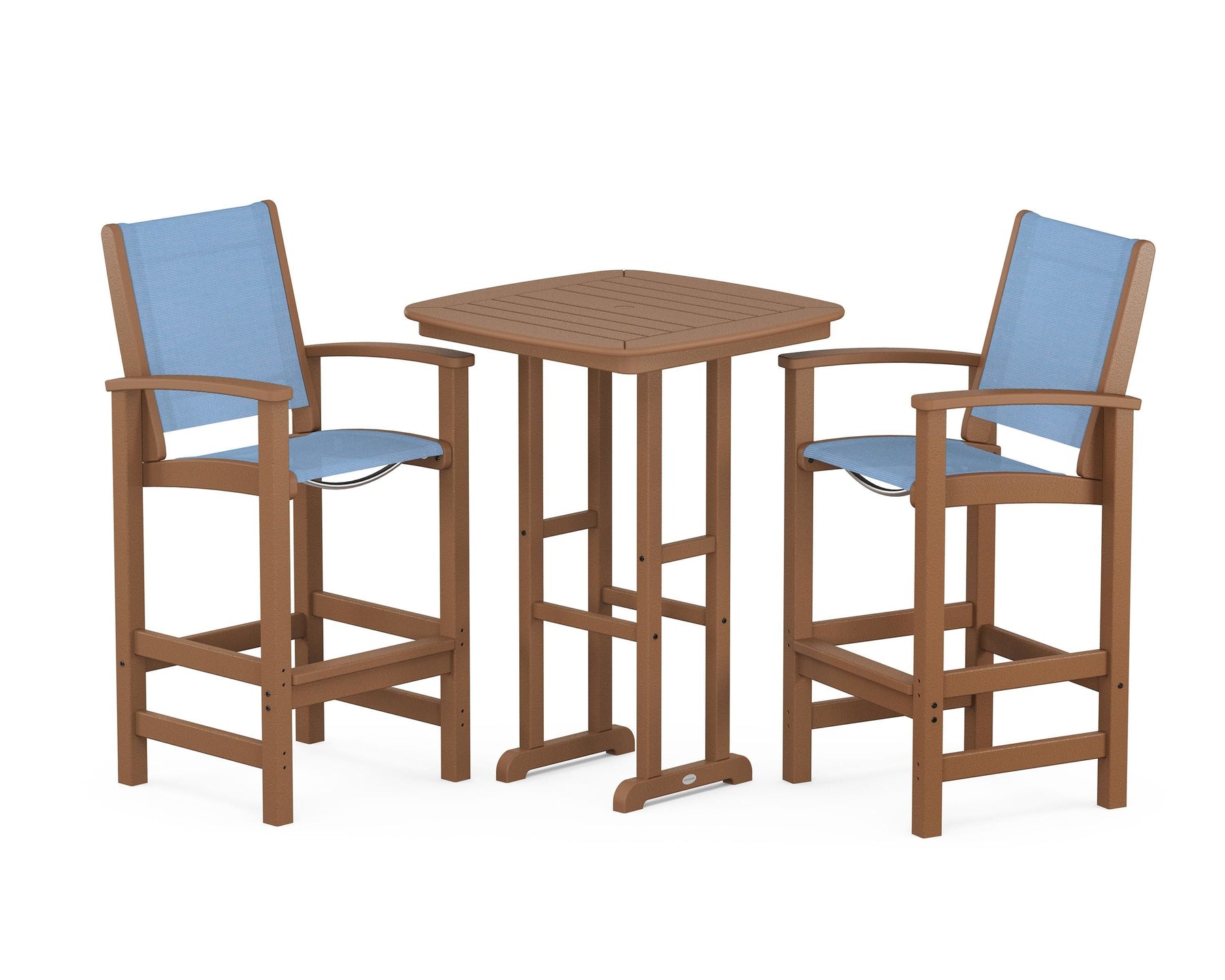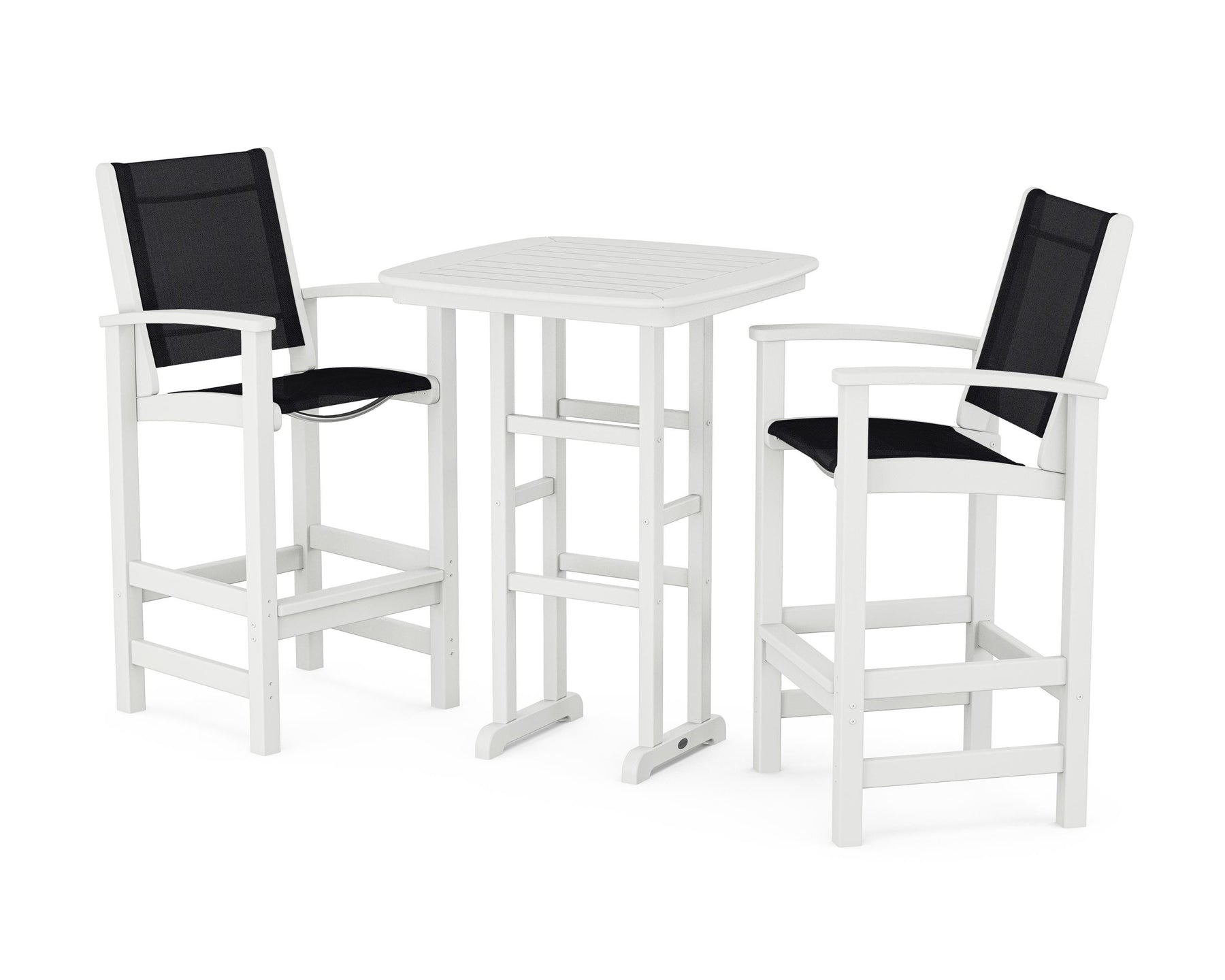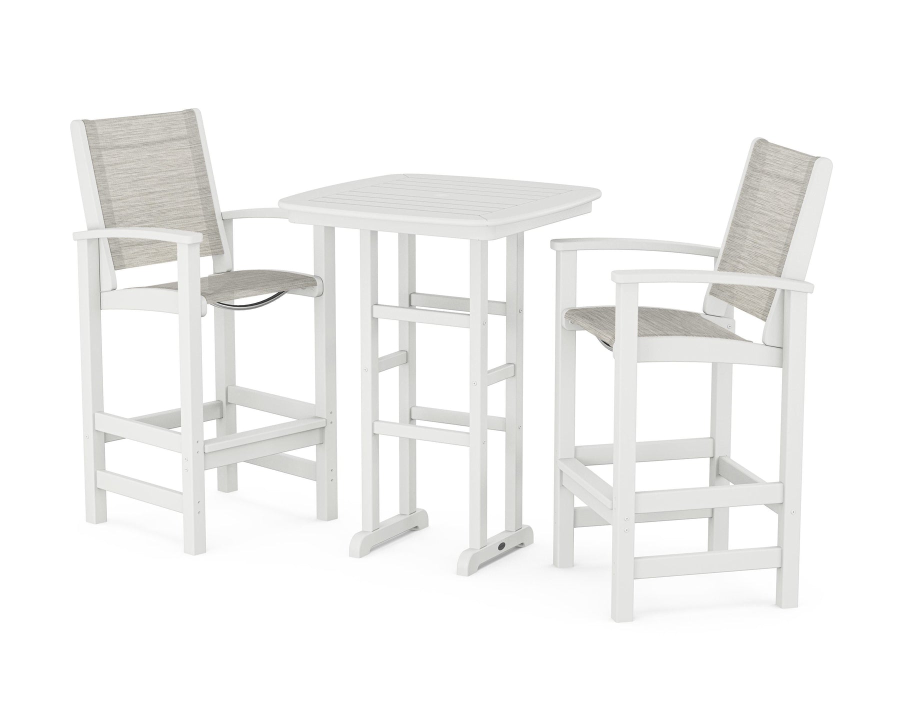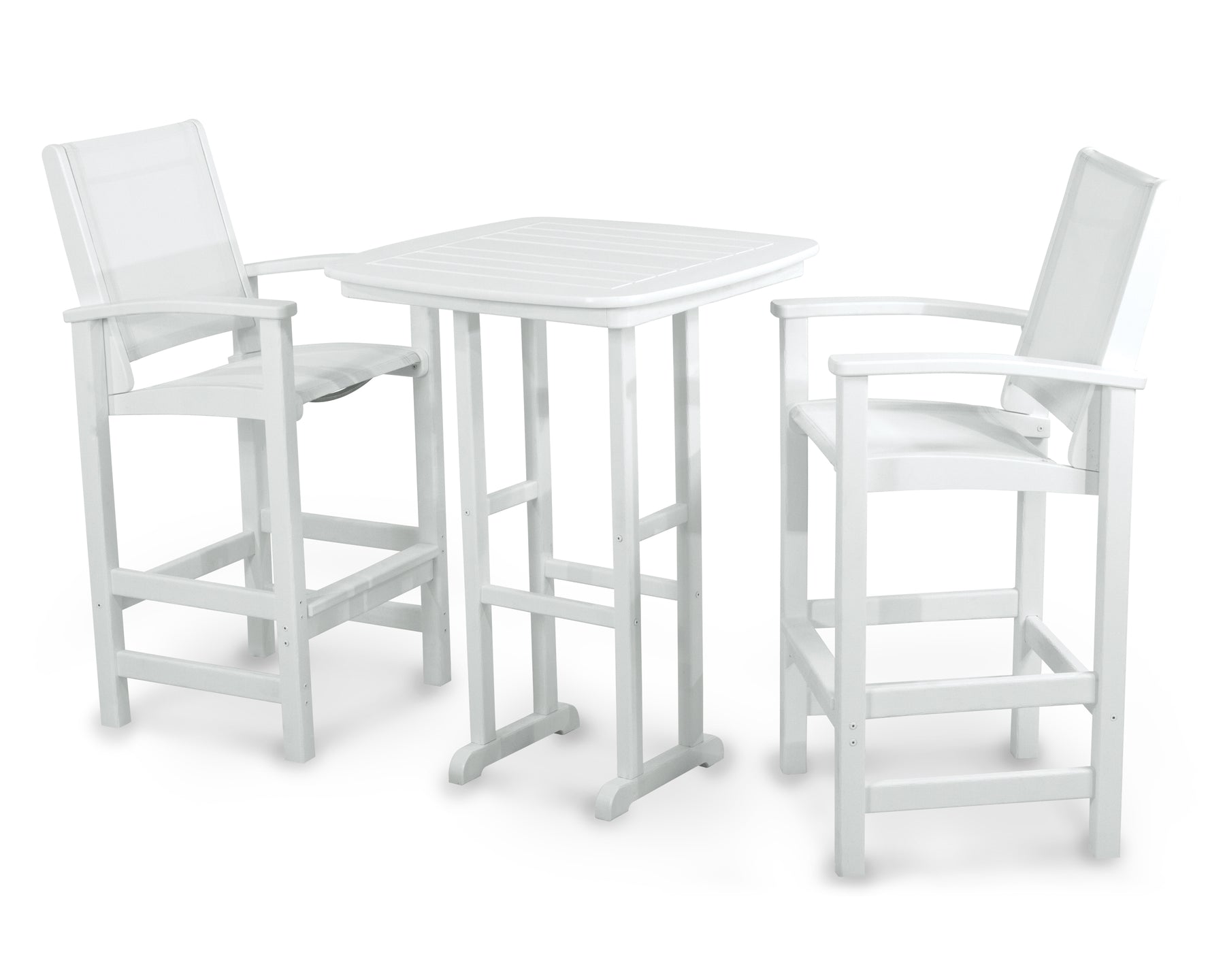 Two words can sum up the Coastal Collection: comfortable and carefree. Designed with materials that withstand all the elements, the Coastal 3-Piece Bar Set features durable lumber frames and all-weather sling seats for resort-inspired style. Centered around a bar-height table, this set comfortably accommodates two.