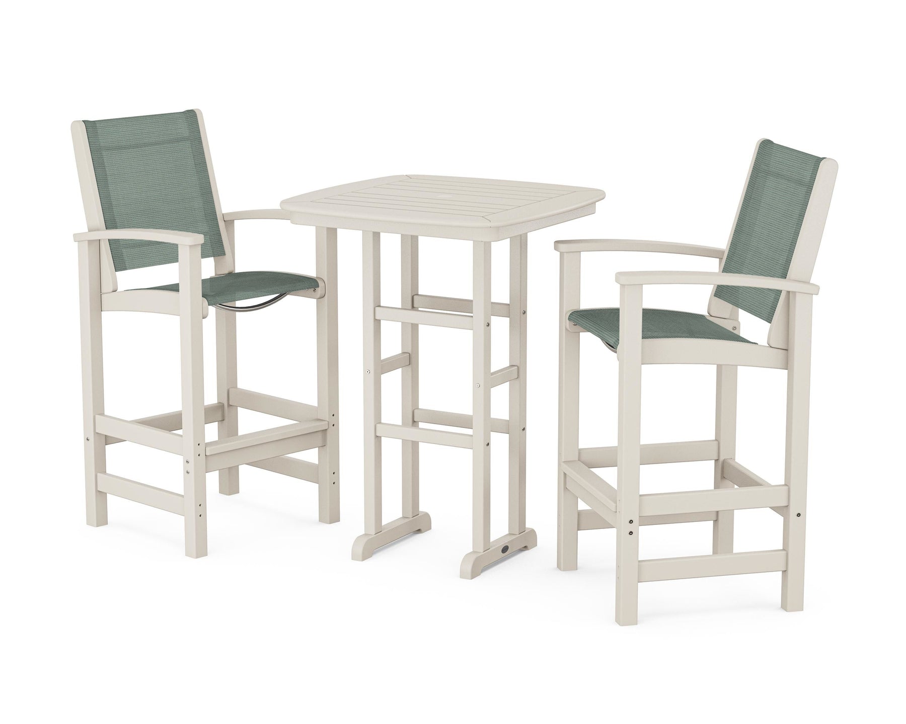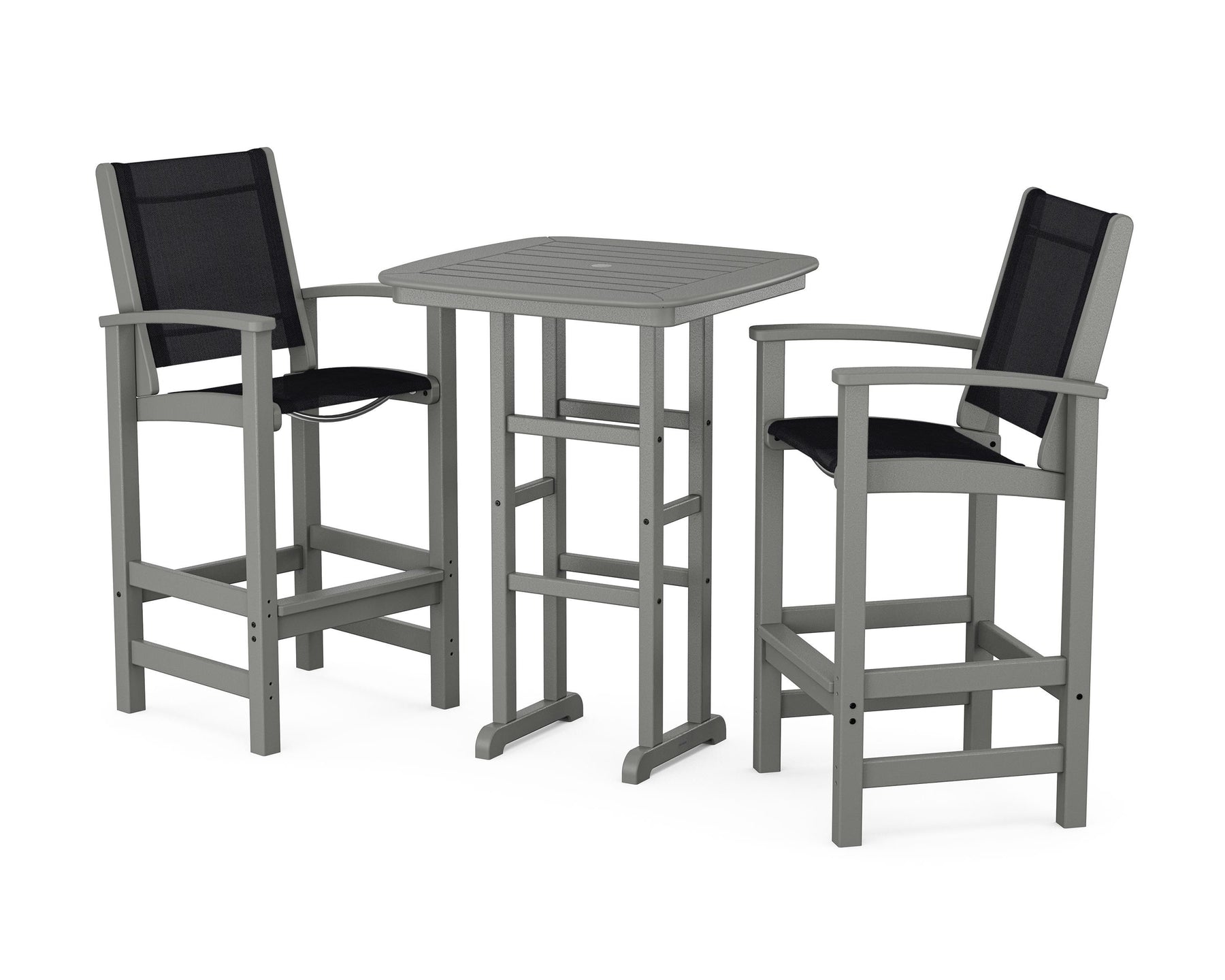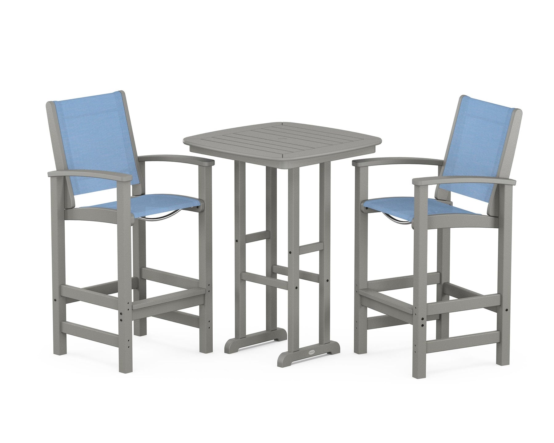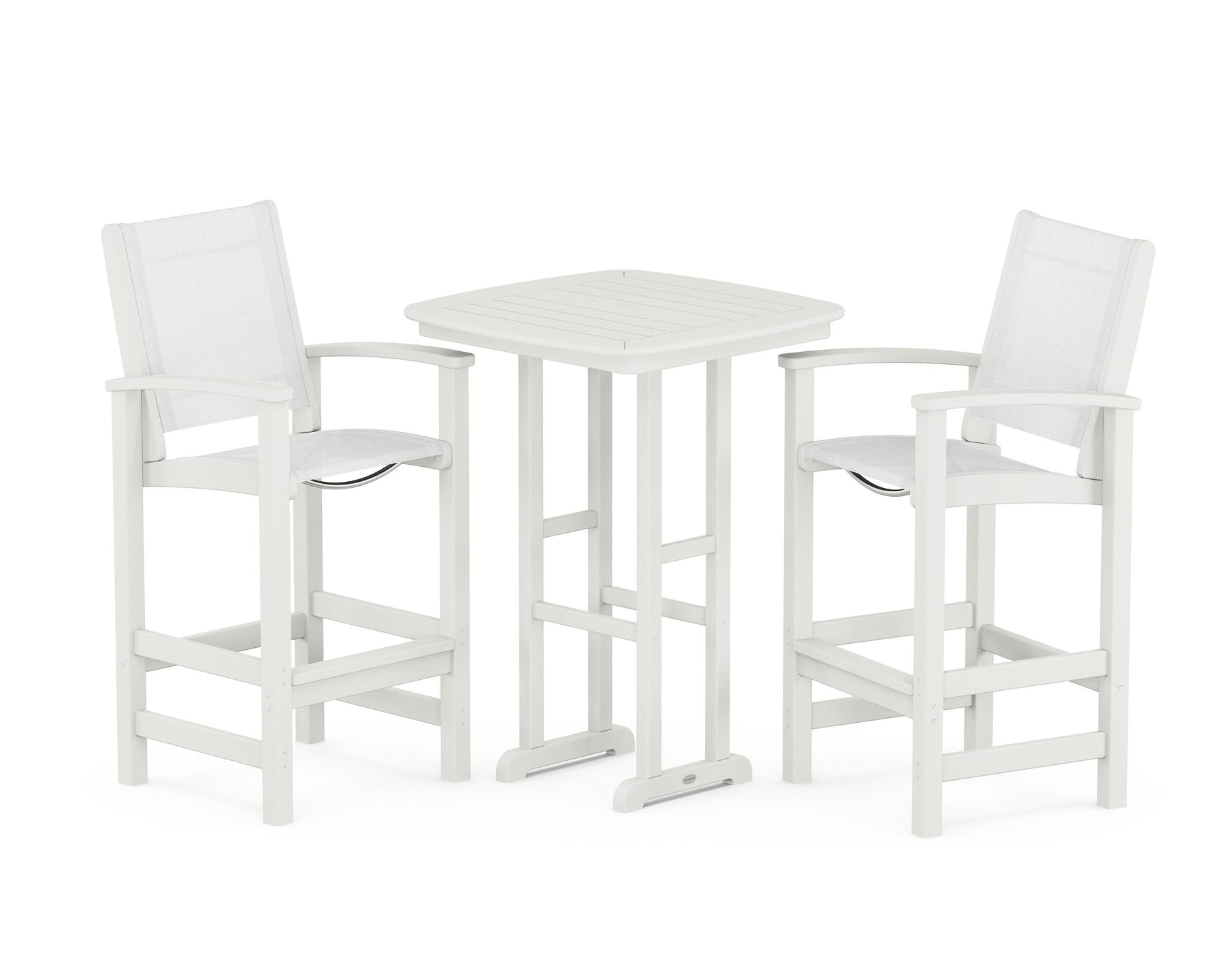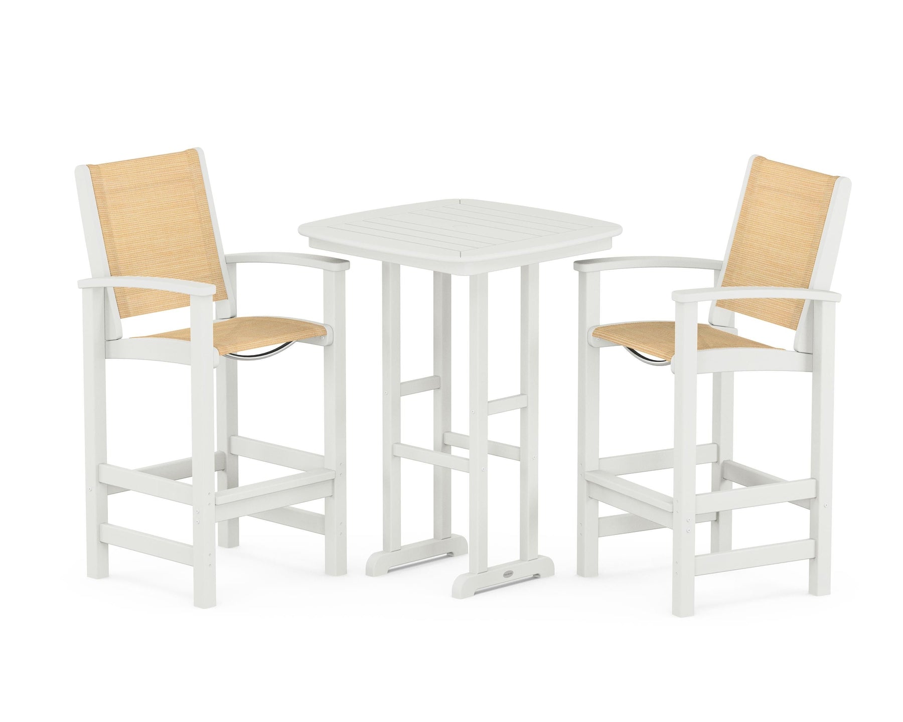 Two words can sum up the Coastal Collection: comfortable and carefree. Designed with materials that withstand all the elements, the Coastal 3-Piece Bar Set features durable lumber frames and all-weather sling seats for resort-inspired style. Centered around a bar-height table, this set comfortably accommodates two.