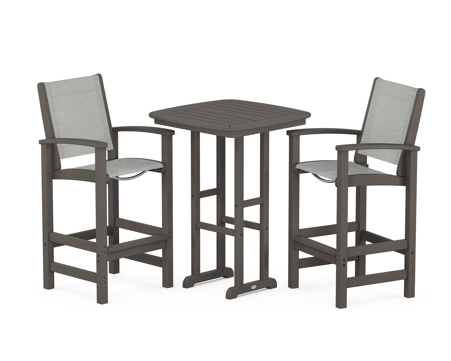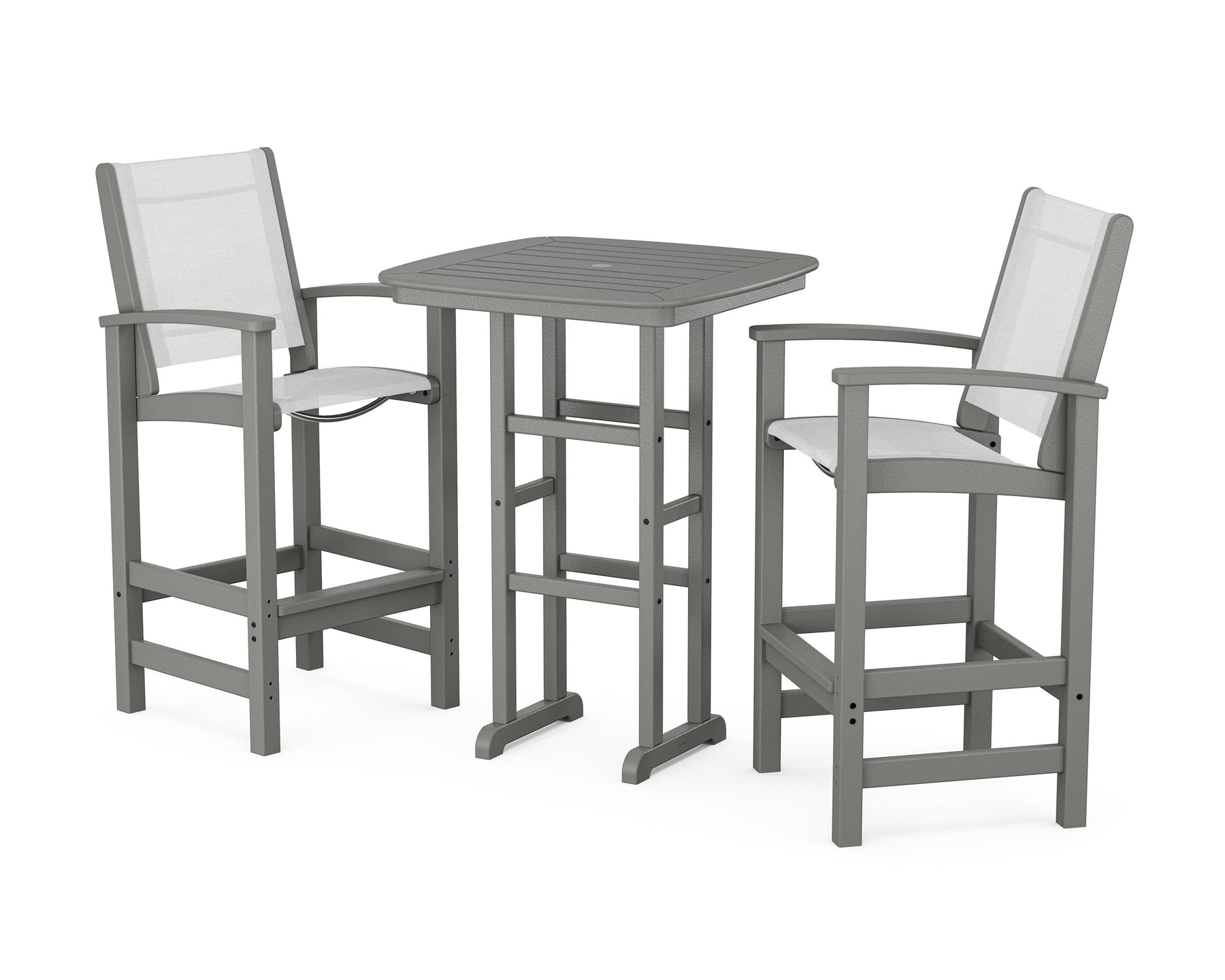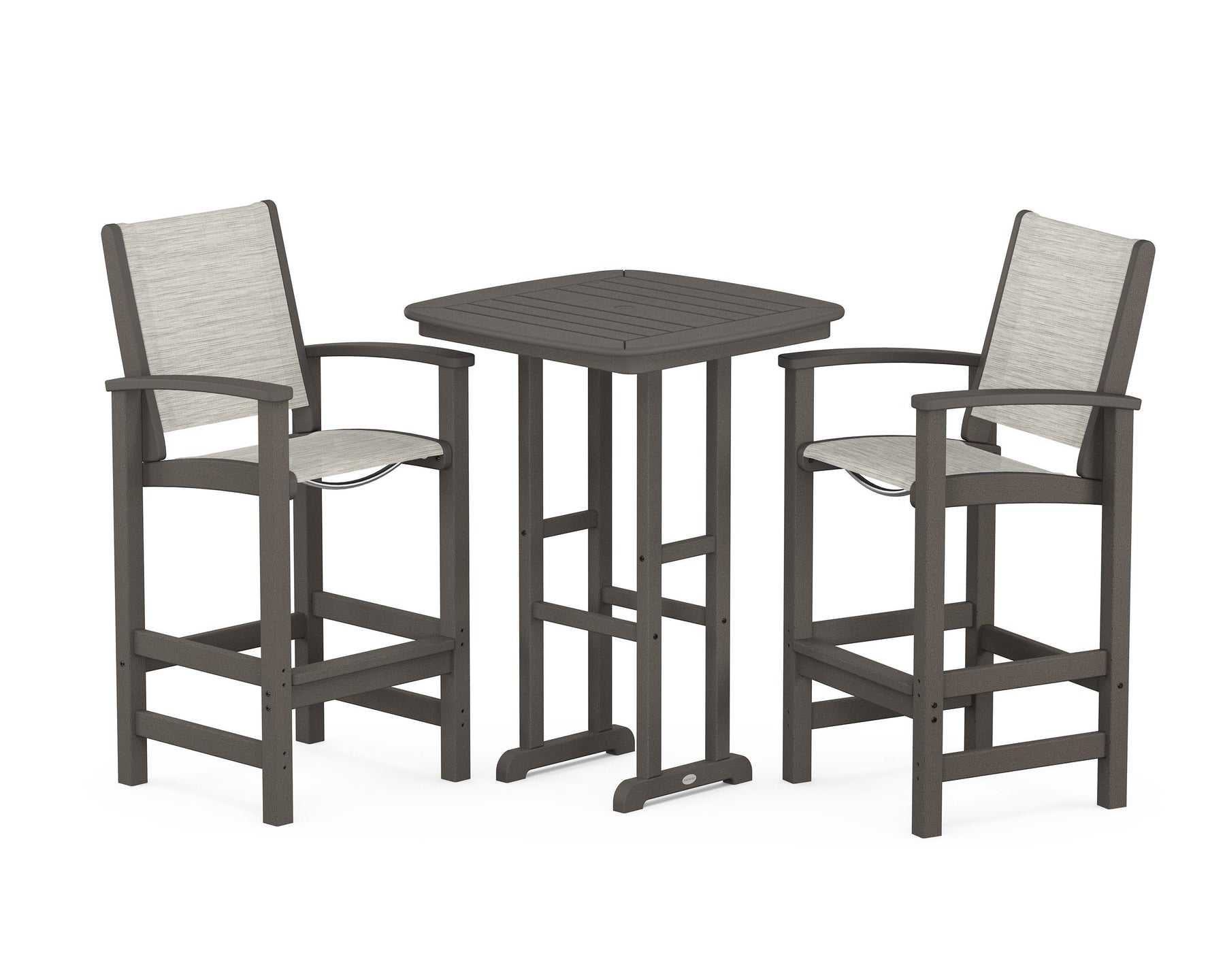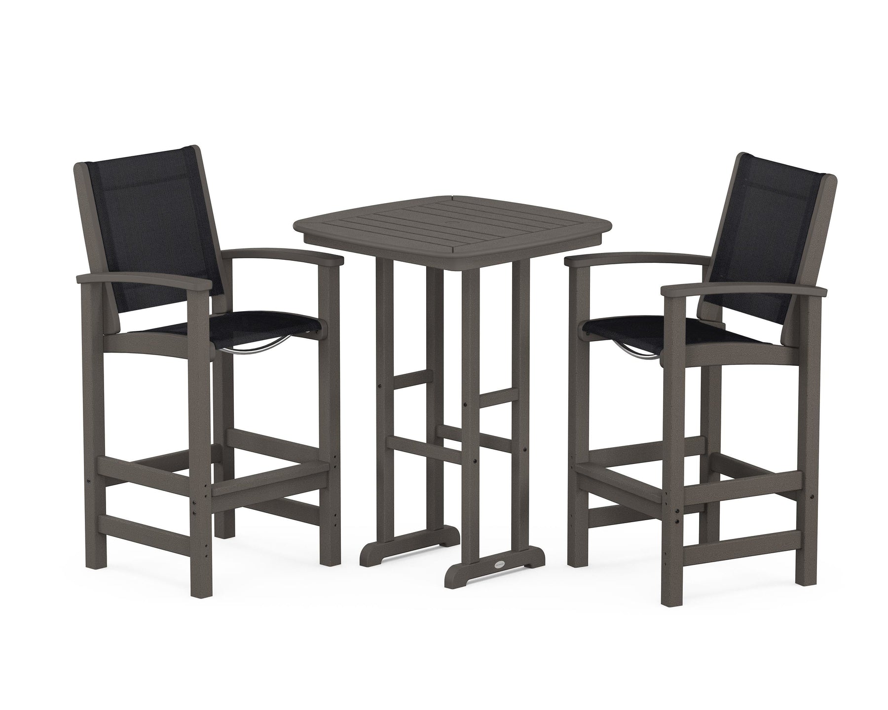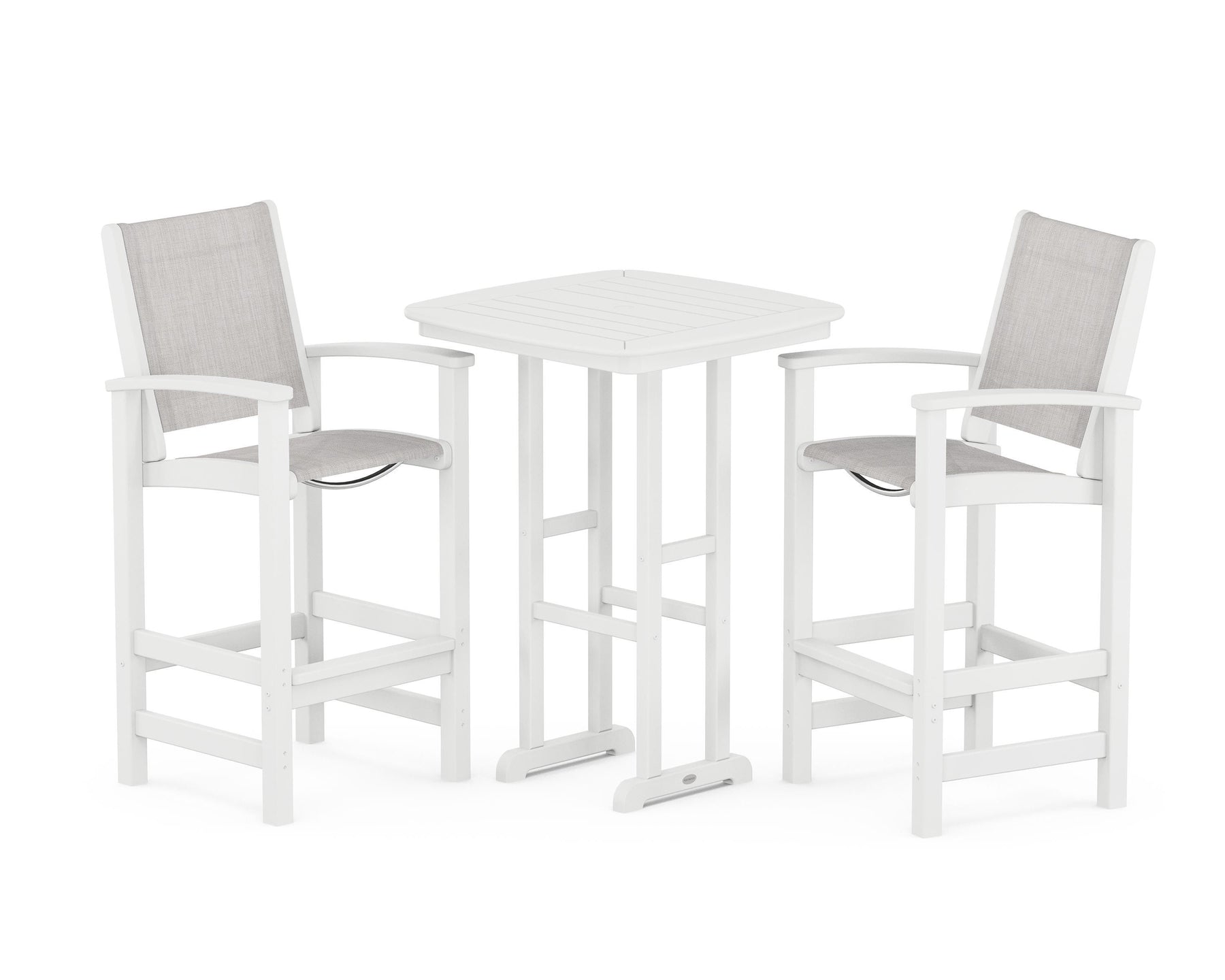 Two words can sum up the Coastal Collection: comfortable and carefree. Designed with materials that withstand all the elements, the Coastal 3-Piece Bar Set features durable lumber frames and all-weather sling seats for resort-inspired style. Centered around a bar-height table, this set comfortably accommodates two.