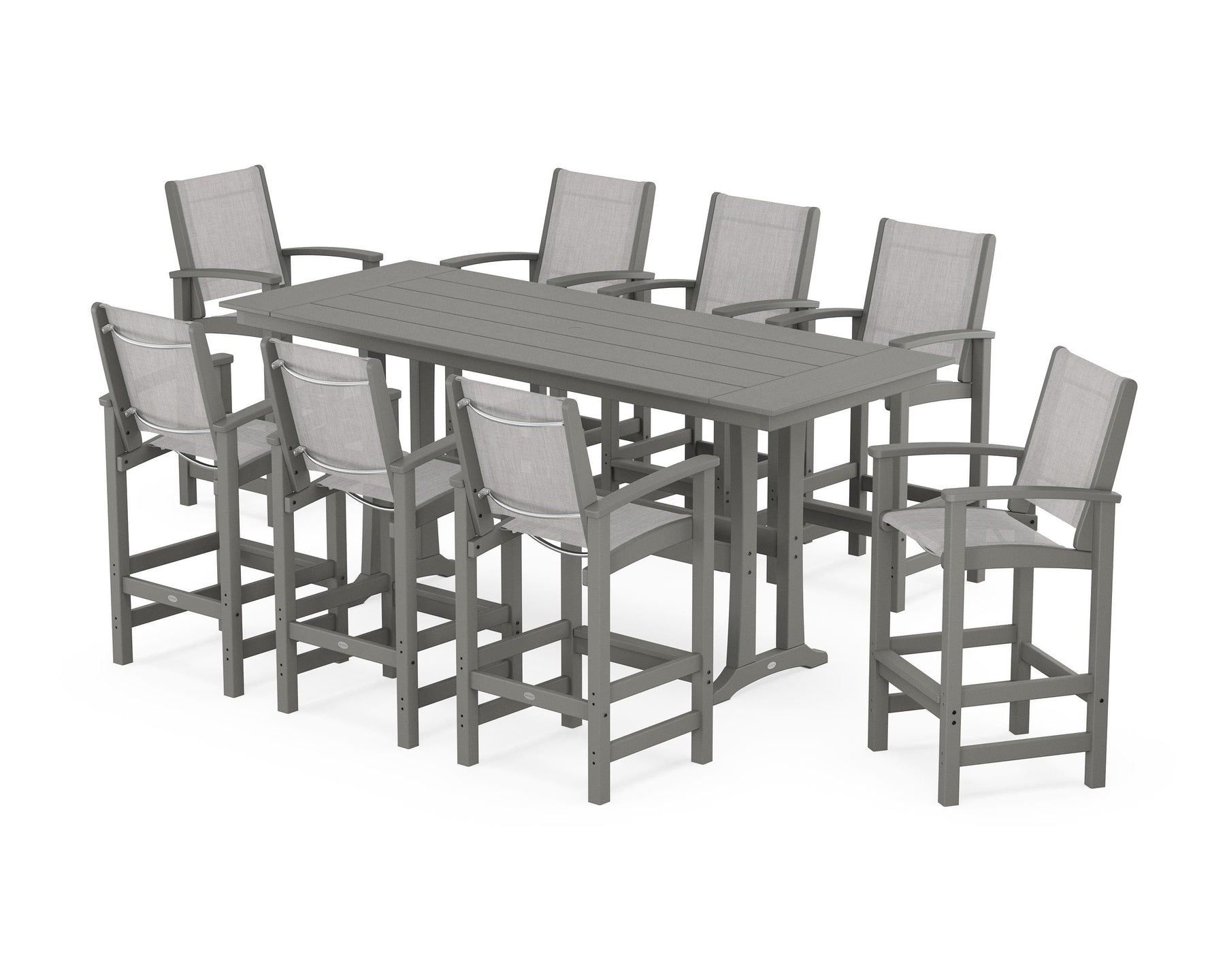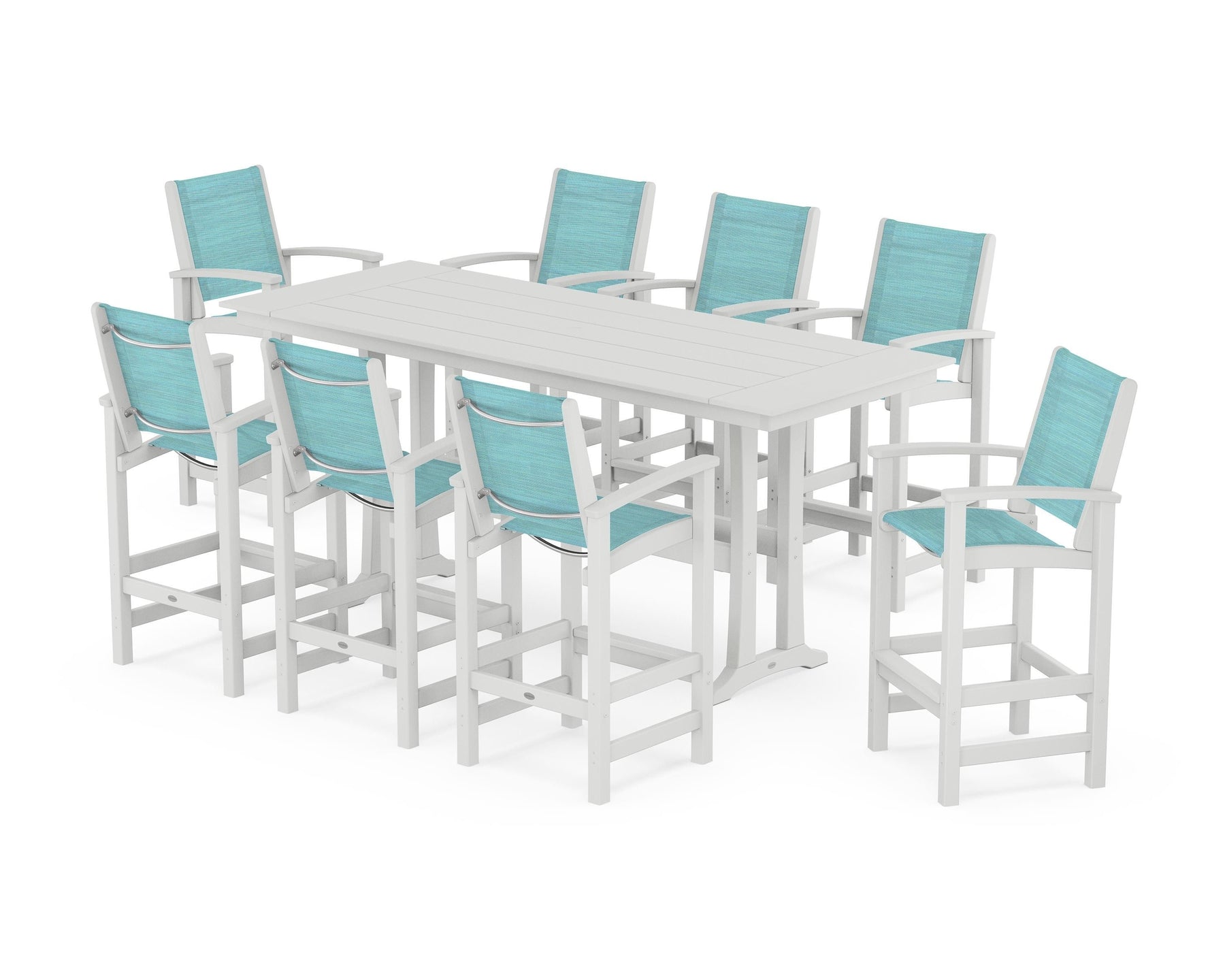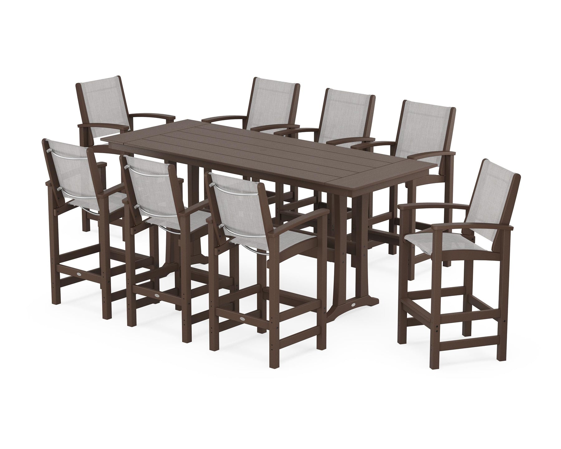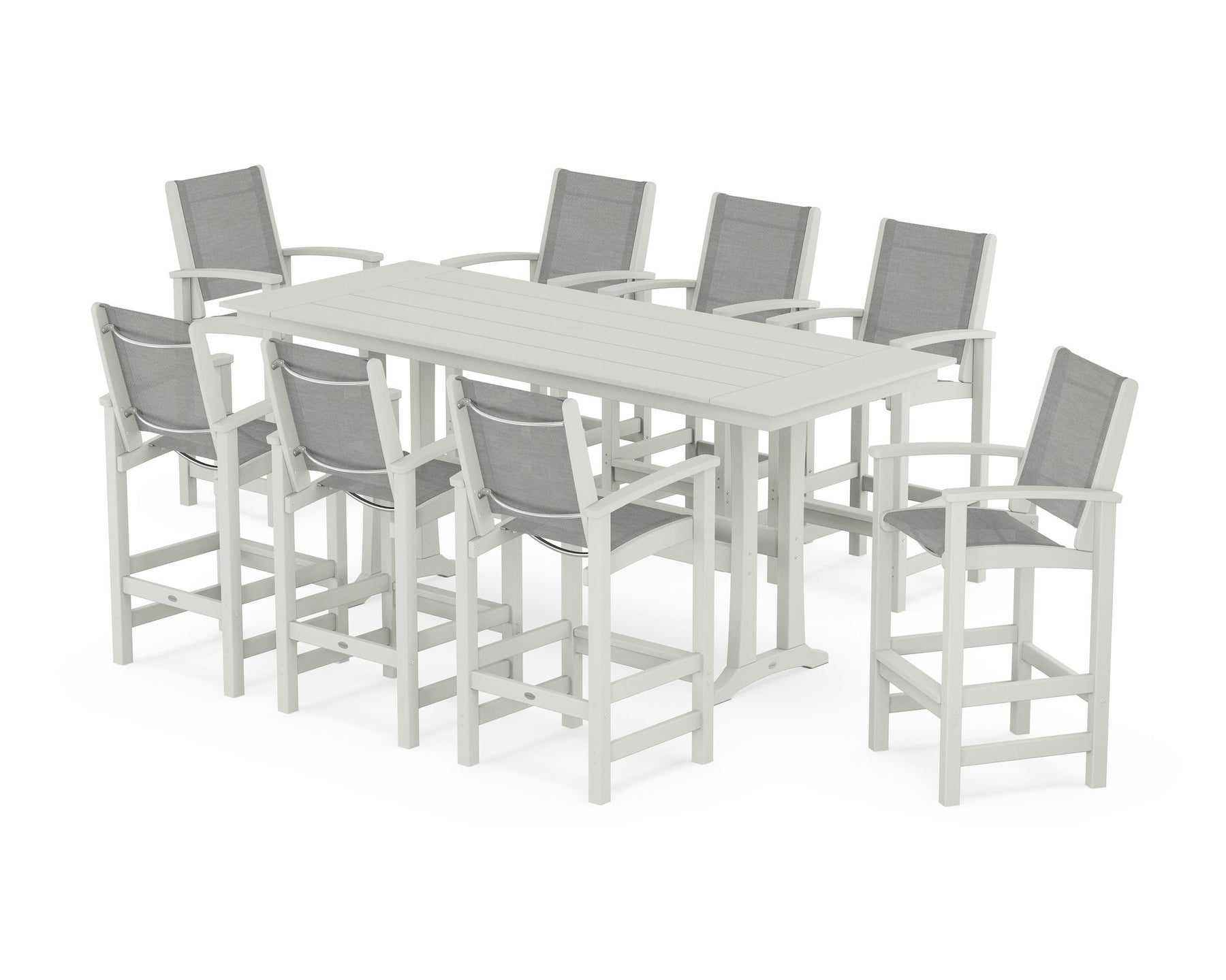 Two words can sum up the Coastal Collection: comfortable and carefree. Designed with materials that withstand all the elements, the Coastal 9-Piece Farmhouse Bar Set with Trestle Legs features durable lumber frames and all-weather sling seats for resort-inspired style. Centered around a spacious plank-style table, this set easily and comfortably accommodates eight.