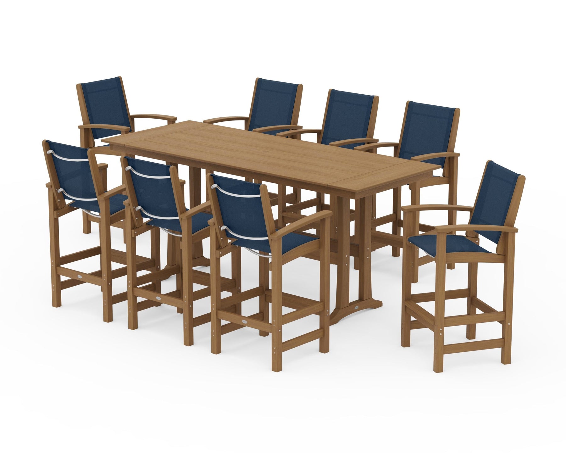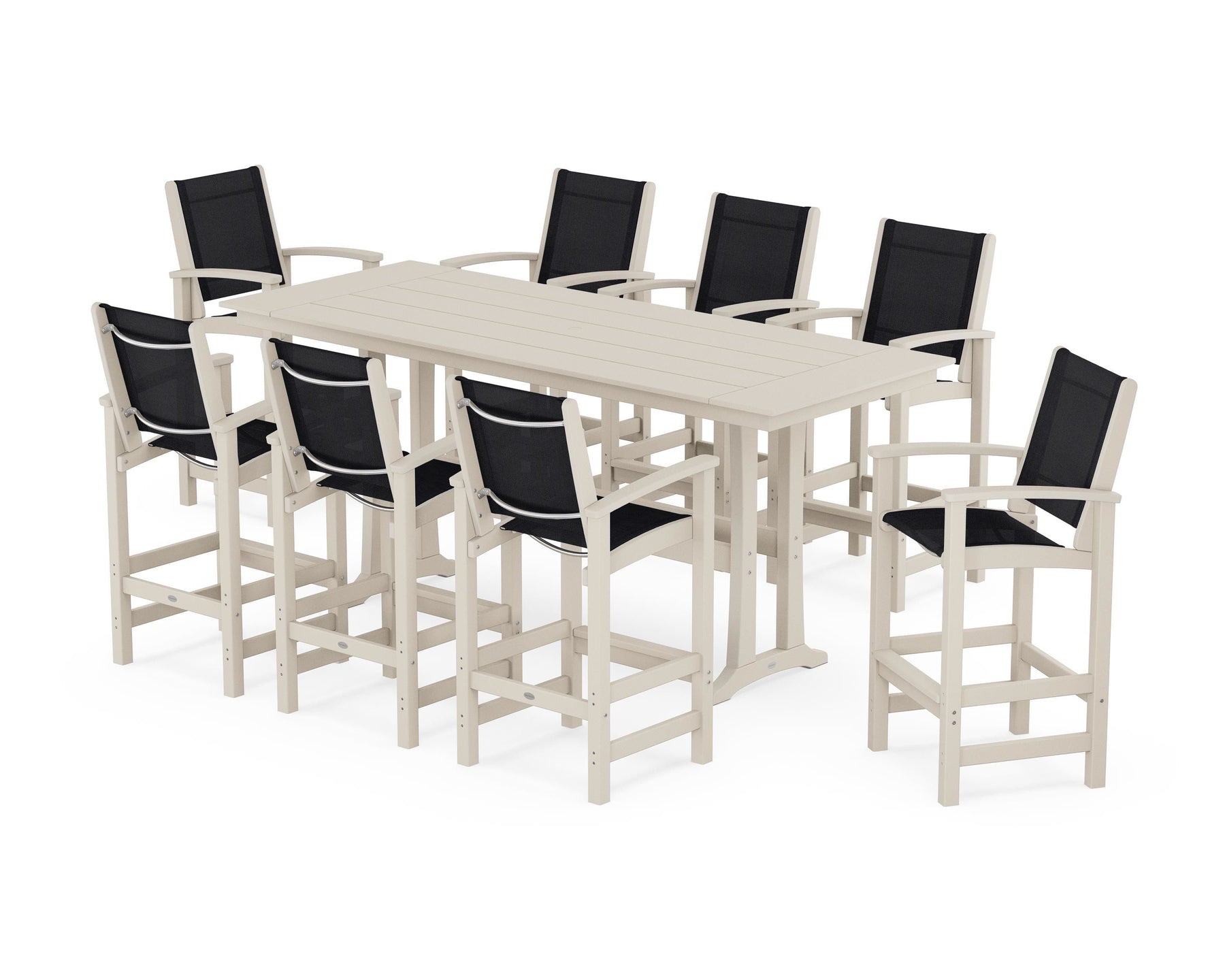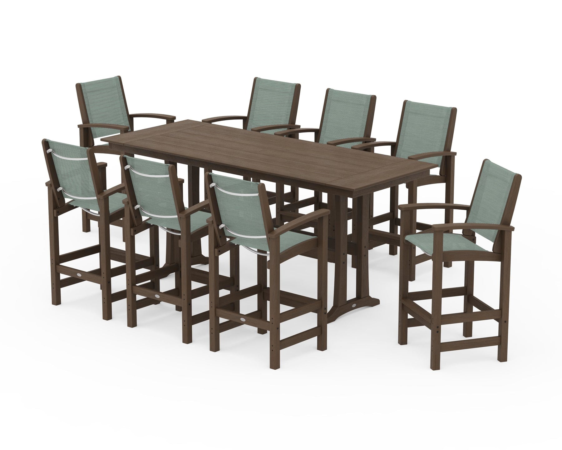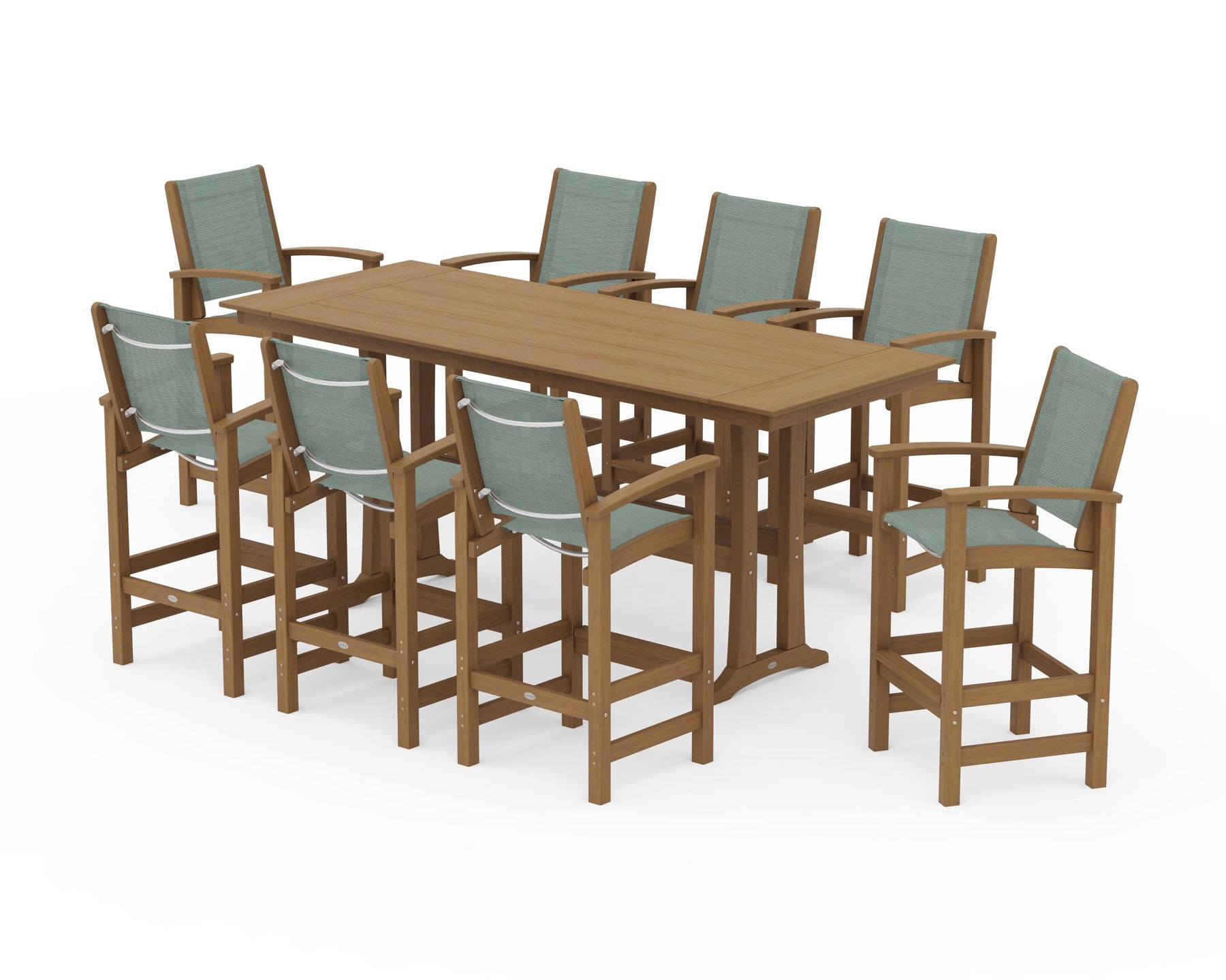 Two words can sum up the Coastal Collection: comfortable and carefree. Designed with materials that withstand all the elements, the Coastal 9-Piece Farmhouse Bar Set with Trestle Legs features durable lumber frames and all-weather sling seats for resort-inspired style. Centered around a spacious plank-style table, this set easily and comfortably accommodates eight.
