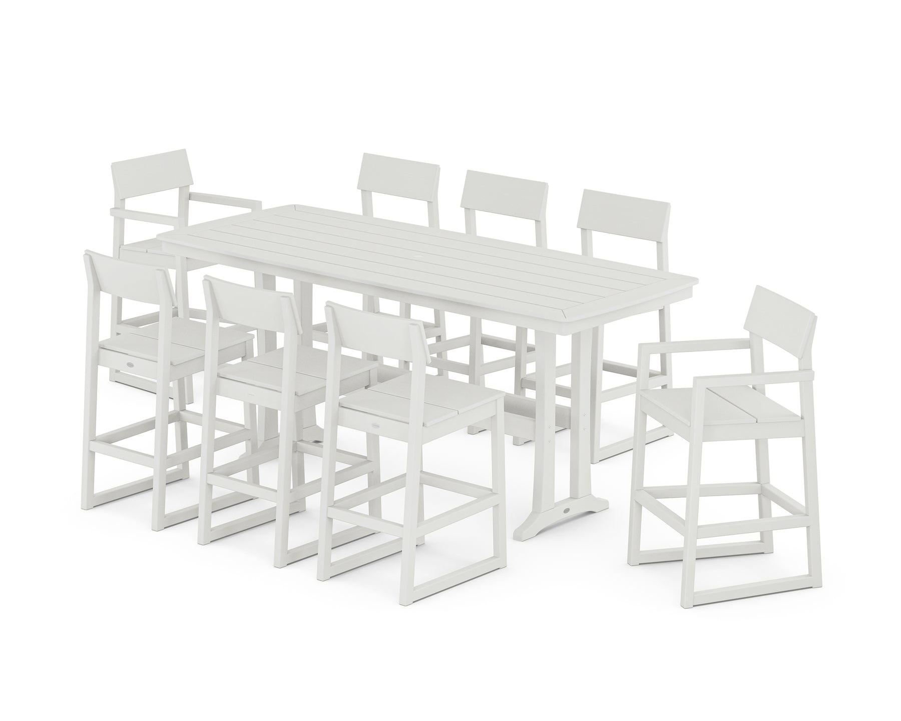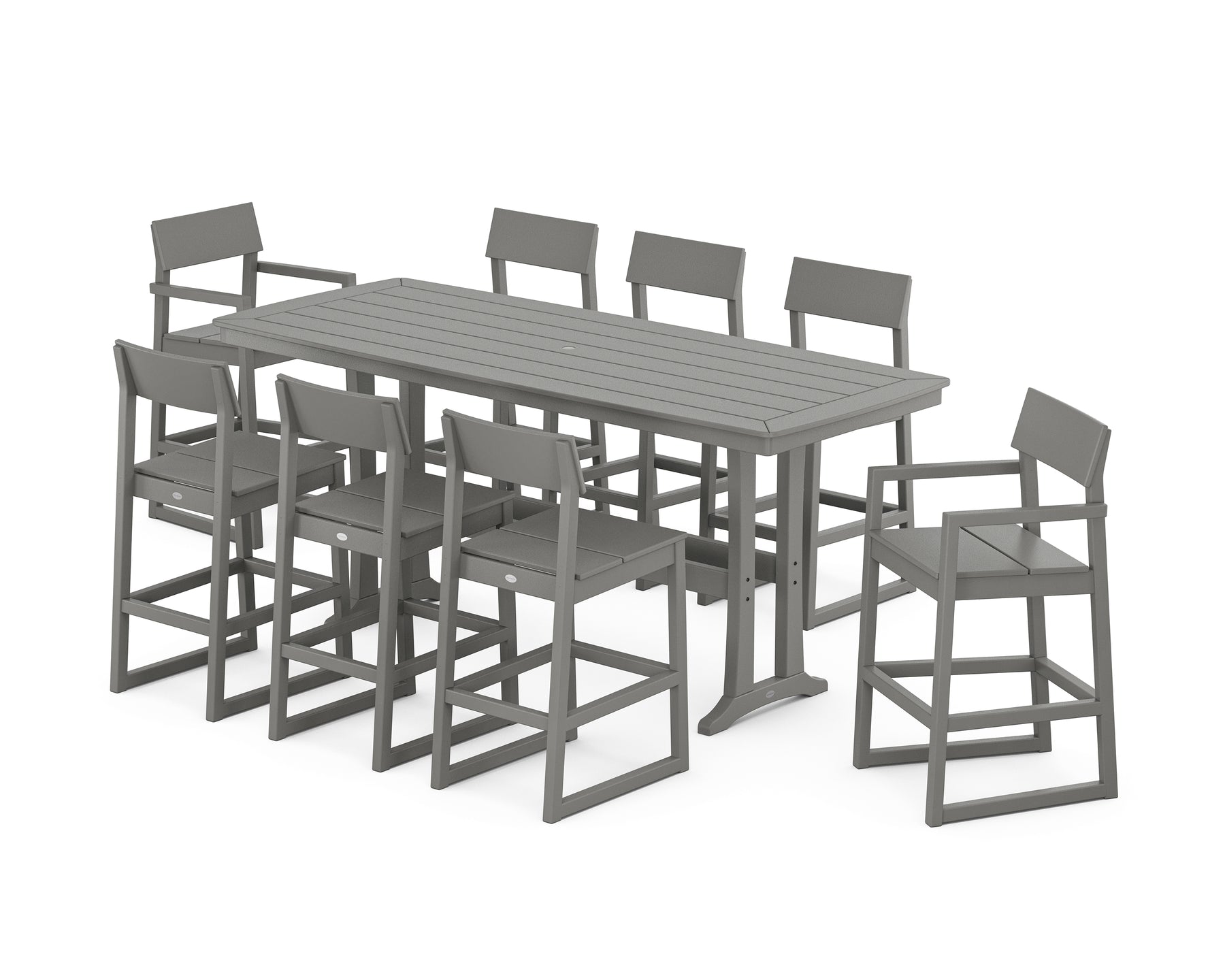 Minimalist in style and durable by design, our EDGE Collection is all-weather furniture that leaves a lasting impression. With its clean, confident lines and linger-worthy comfort, the EDGE 9-Piece Bar Set with Trestle Legs has all the makings of a five-star experience. Designed at counter height, the sleek seating and roomy table lets eight guests comfortably gather.
