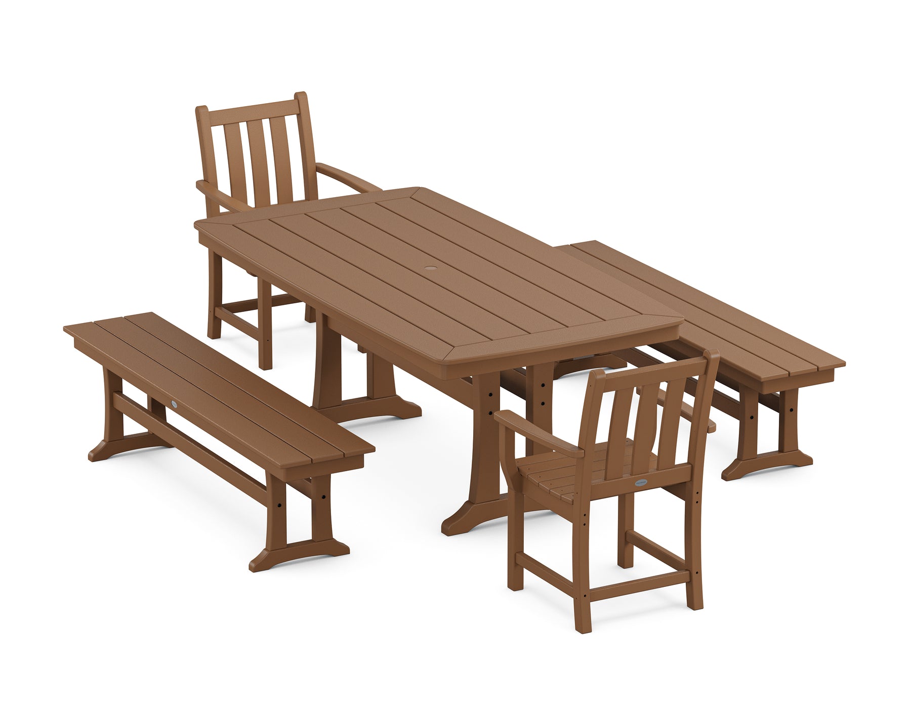 • Includes (2) Traditional Garden Dining Arm Chairs, (2) Farmhouse Trestle 65" Benches, and (1) Nautical Trestle 38" x 73" Dining Table